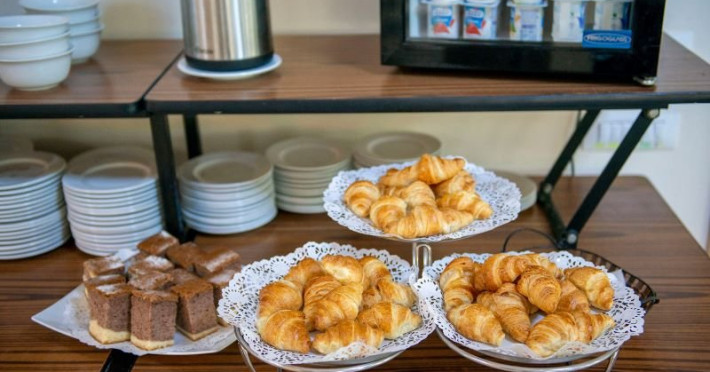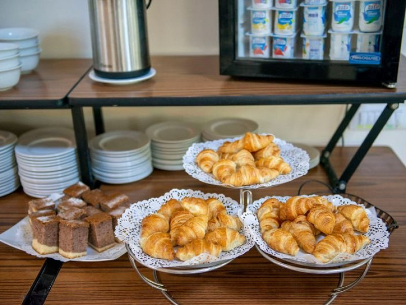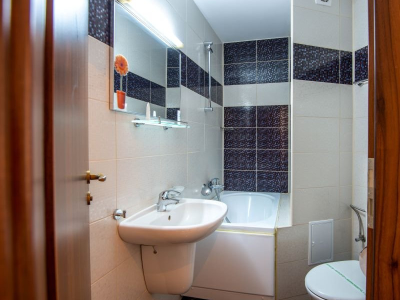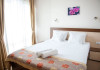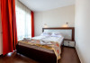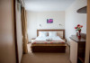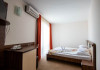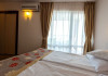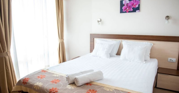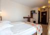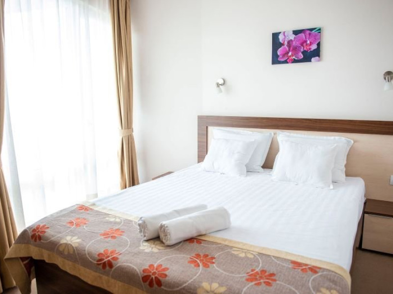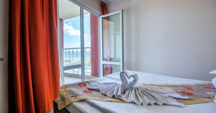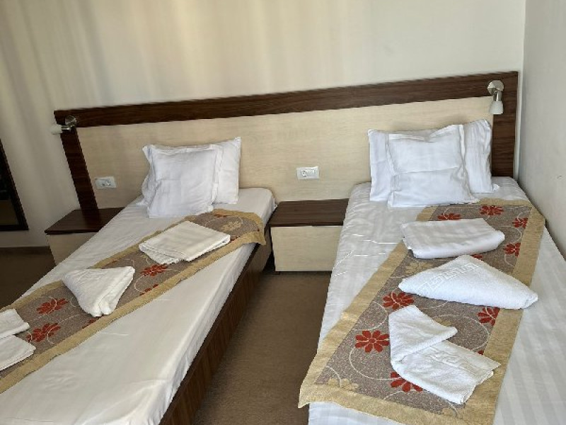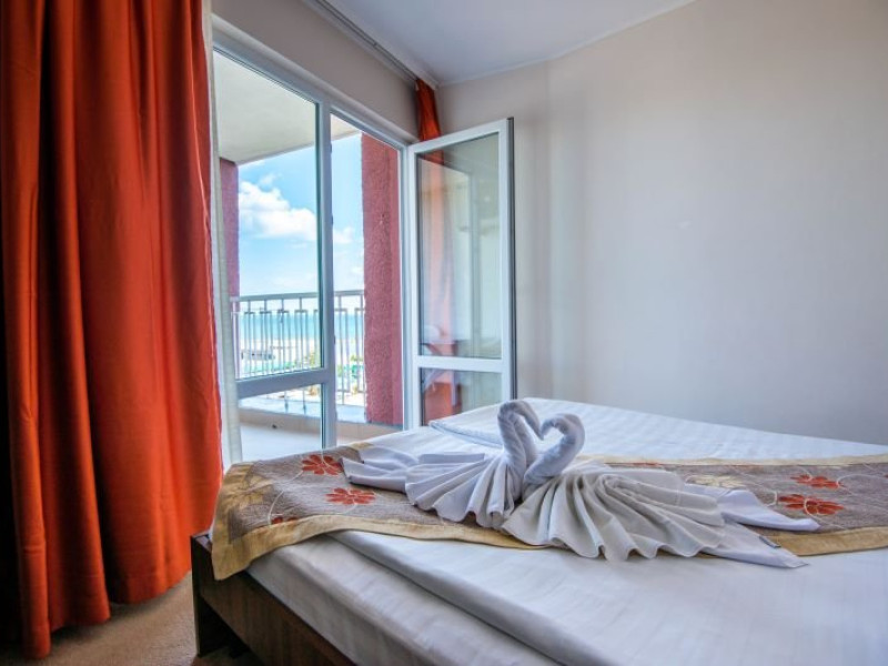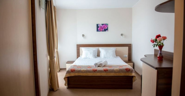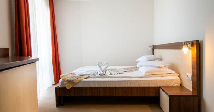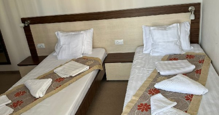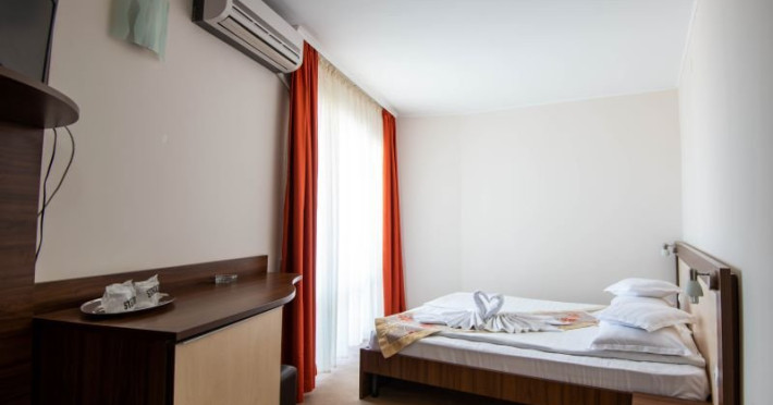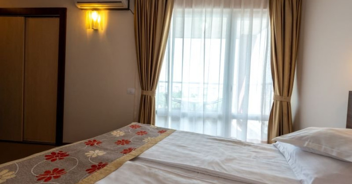 Patutul pentru bebelus este de tipul tarc pliabil cu plasa, are suprafata interioara de 60x120cm si se ofera gratuit la cerere. Patul suplimentar extensibil are dimensiunea de 80x180cm si se taxeaza indiferent de varsta beneficiarului. Va rugam sa aveti in vedere ca spatiul de manevra din camera poate fi astfel redus. Camera si balconul au suprafata aproximativa de 18 mp si sunt dotate cu pat dublu (160x200cm) sau 2 paturi twin (90x200cm fiecare).