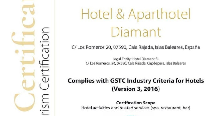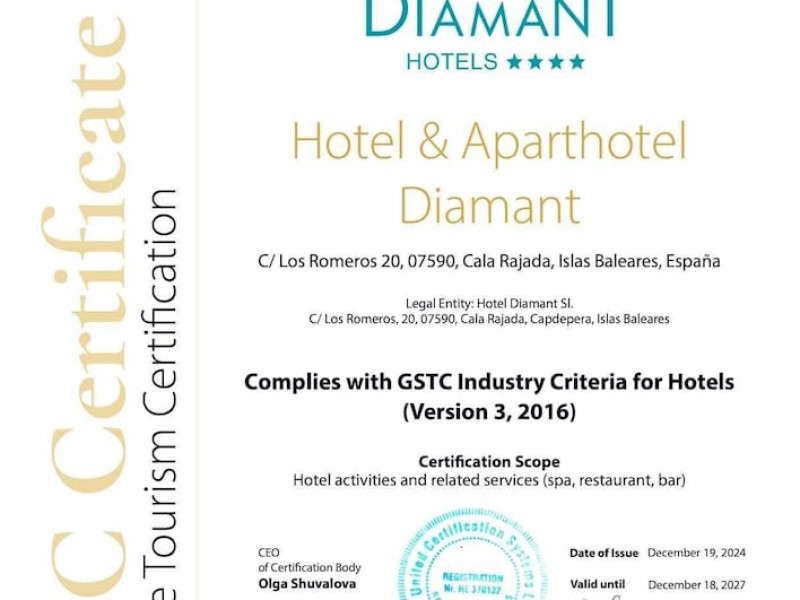Located on Mallorca's northeast coast, near Cala Agulla Beach, the 4-star Diamant Hotel y Aparthotel offers a range of amenities for a relaxing holiday. Guests can enjoy indoor and seasonal outdoor pools, a fitness center, a full-service spa with massage services, and sports facilities including mini-golf and volleyball. Dining options include a buffet restaurant serving breakfast and half-board options, a snack bar, and multiple bars, including poolside options. The hotel features air-conditioned rooms with complimentary Wi-Fi, TVs, and balconies. Additional amenities include a 24-hour front desk, luggage storage, bike storage and repair services, and a business center. An airport shuttle is available for a surcharge. The hotel is a certified sustainable resort with the GSTC sustainability certificate. The Diamant Hotel and Aparthotel is a Tourist hotel. Located in Cala Ratjada area. The nightlife/restaurants are located in the hotel.