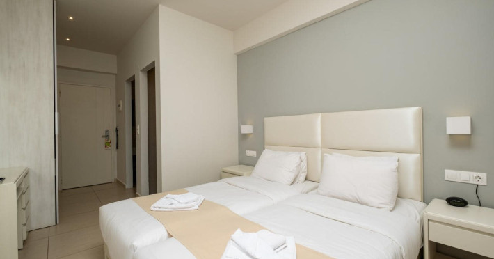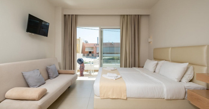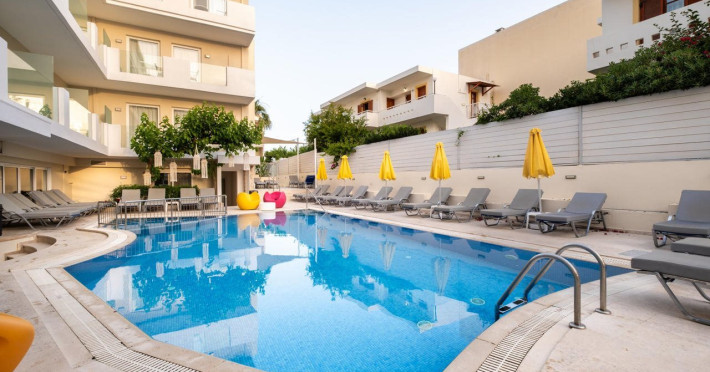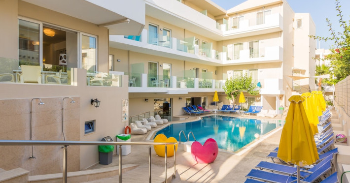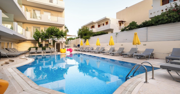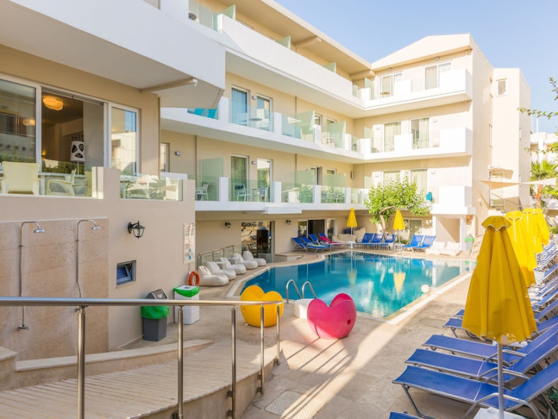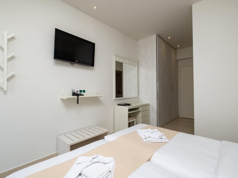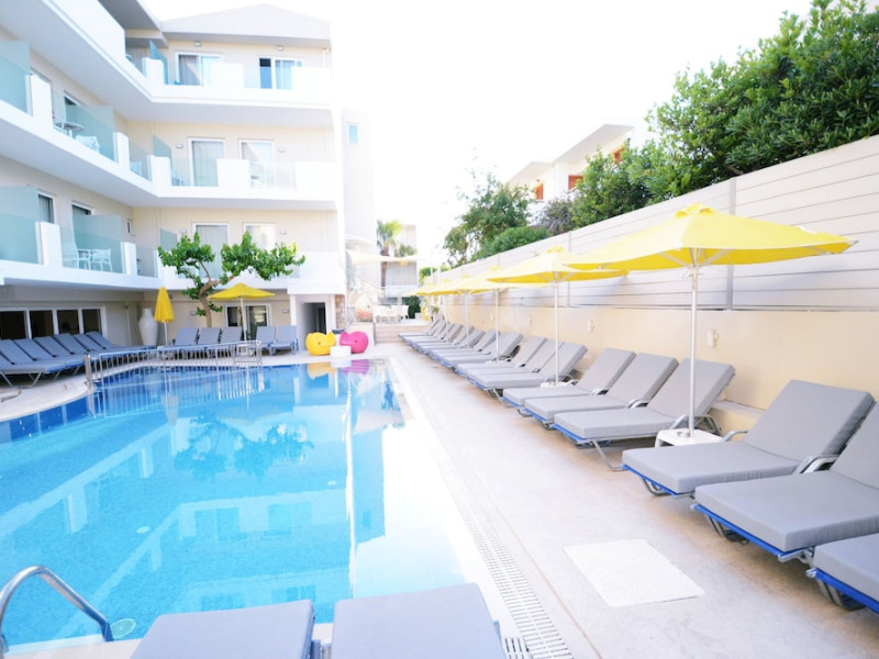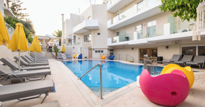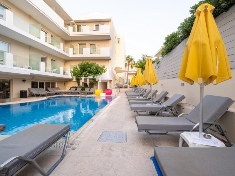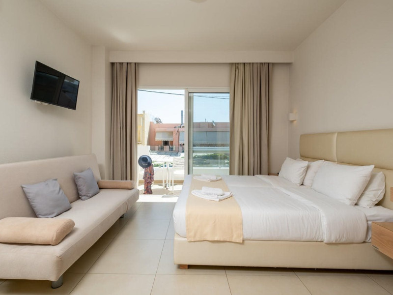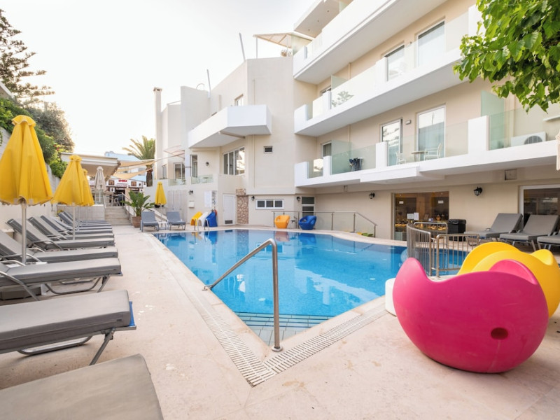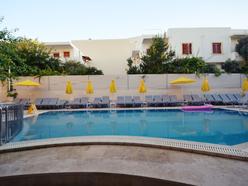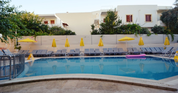 Facilities and services include 24hr reception, WIFI, lobby area, internet access, massage (extra charge), pool bar, swimming pool with free sun loungers & umbrellas, pool towels (extra charge), children's pool, luggage room, shower room and restaurant, laundry service (extra charge). Parking public parking near by. On the public beach umbrellas & sunchairs with extra charge.Rooms feature Individual air conditioning/heatingi, Wifi, cable/satellite TV, telephone, safe (extra charge), mini fridge, electric kettle,electric coffee maker ( on request), furnished balcony or ground terrace and bathroom with shower, bath amenities and hairdryer.Check in 15:00Check out 11:00Towels changing per week 3 timesBed linen changing per week 2 times Room cleaning per week 7 timesIn case of choosing the option of "all inclusive":The All Inclusive-concept includes all meals (breakfast, lunch, dinner and snacks) and mealtime drinks such as soft drinks, beer, wine, water and alcoholic drinks, all of local brands. Drinks are served from morning until late evening (approx until 22.00 -24.00 hrs). Opening times vary between different hotels. In certain hotels the activities program is also included.Please note that some of the above facilities may be closed due to weather / seasonal conditions.Address: 16 Australon Polemiston, Rethymnon, 74100 Crete, Greece.