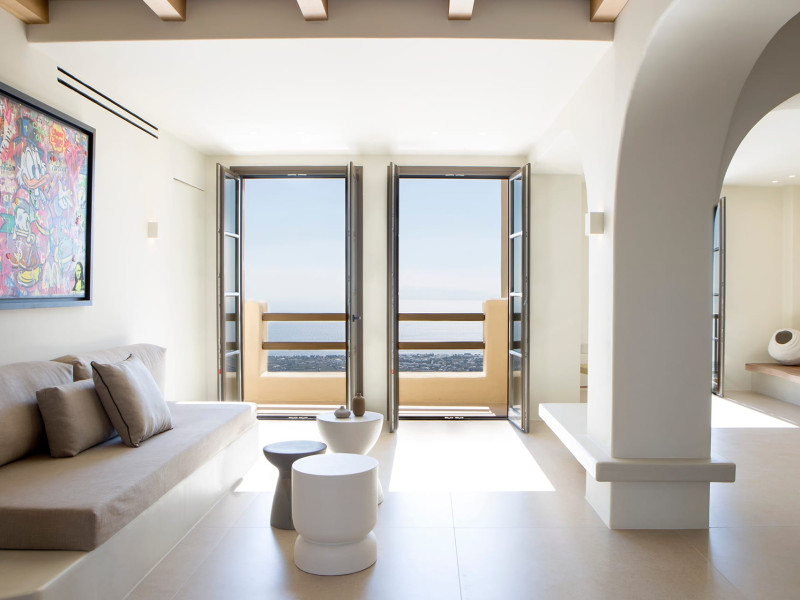 Elessa Hotel is a prestigious 5-star hotel offering outstanding amenities for absolute comfort and relaxation. The hotel features a common swimming pool and a renowned restaurant called Elani. Private parking is also available. Guests can enjoy attentive room service and a 24-hour front desk. The hotel is only for adults and we accept children from the age of 16 and above. The hotel provides luxurious suites and villas with open spaces, showcasing traditional accents and soothing beige tones that create a warm and tranquil atmosphere. Each accommodation includes a private swimming pool or plunge pool with mesmerizing views.