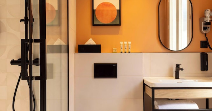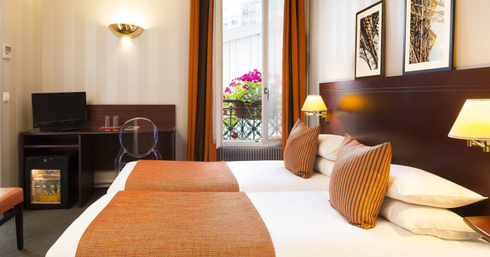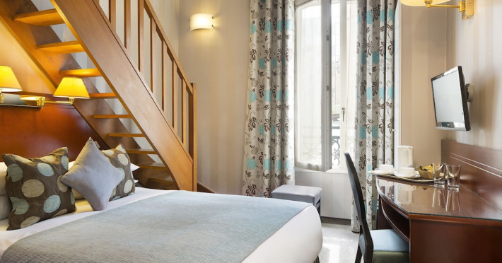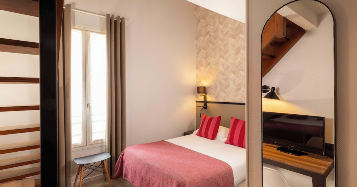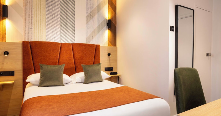 Located in Levallois-Perret, Hôtel Espace Champerret is a contemporary hotel 2.8 km from the Champs-Élysées and 80 metres from Louise Michel Metro Station. It offers a terrace decorated with Japanese-style floral bouquets and features a 24-hour front desk and complimentary wireless internet access. The hotel offers 39 soundproofed guestrooms with bright décor, flat-screen televisions, minibars, desks, and private bathrooms with shower/tub combinations and hair dryers. Some rooms feature a mezzanine level. A buffet breakfast is served on weekdays from 7:00 AM to 10:30 AM and on weekends from 7:30 AM to 11:00 AM for a fee. Room service is available during limited hours. Featured amenities include multilingual staff and luggage storage. Public parking is available nearby. The ESPACE CHAMPERRET is a Tourist hotel. Located in LEVALLOIS - PERRET area. The nightlife/restaurants are easily accessible by taxi or bus from the hotel.