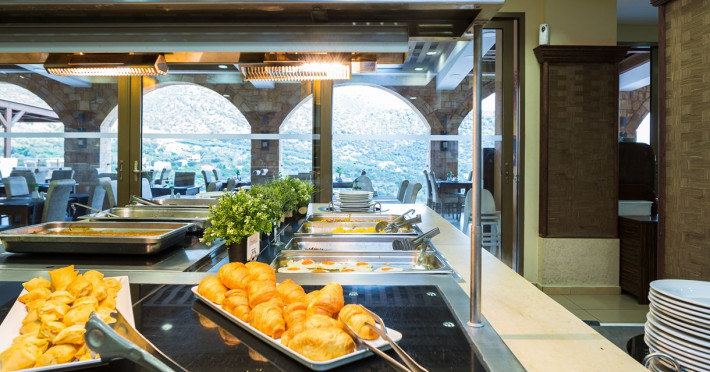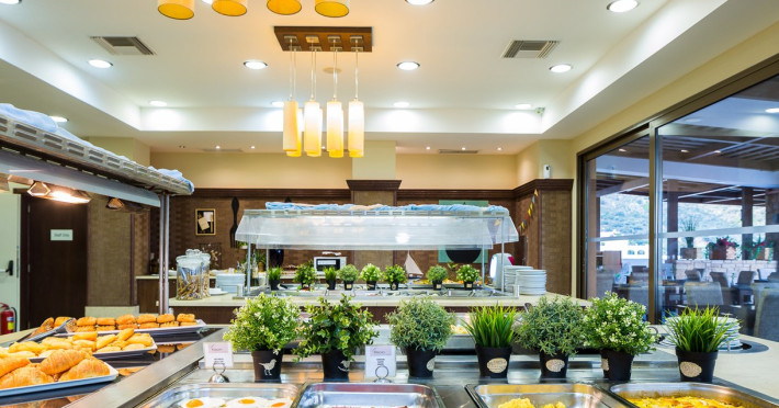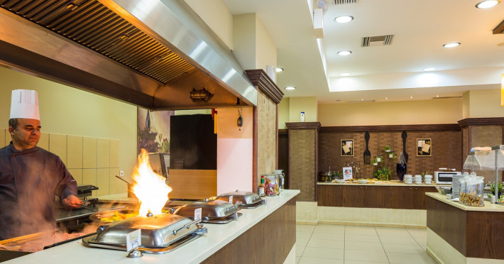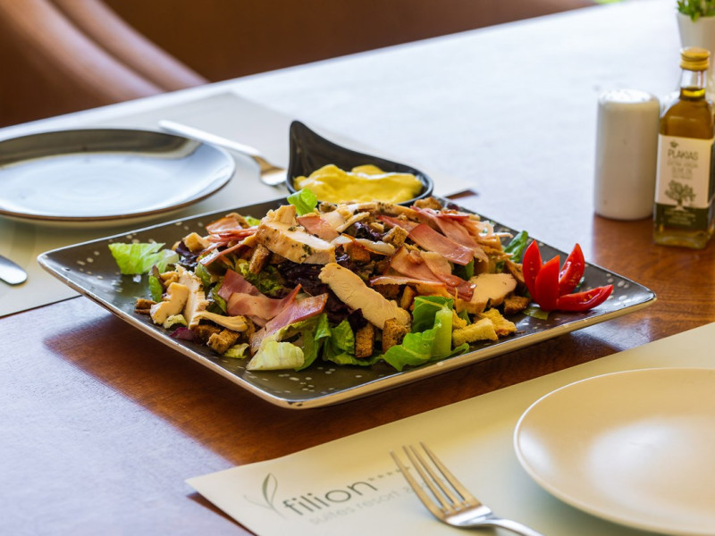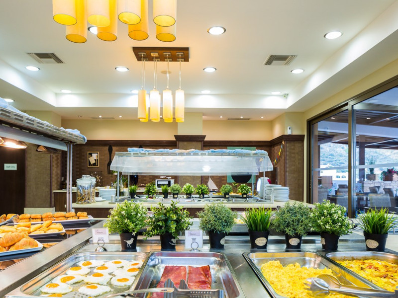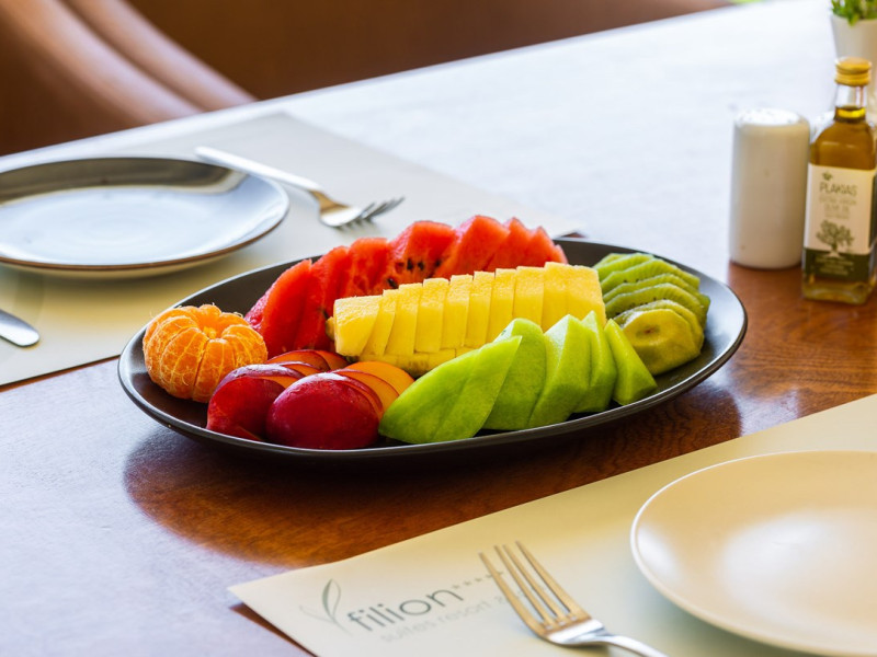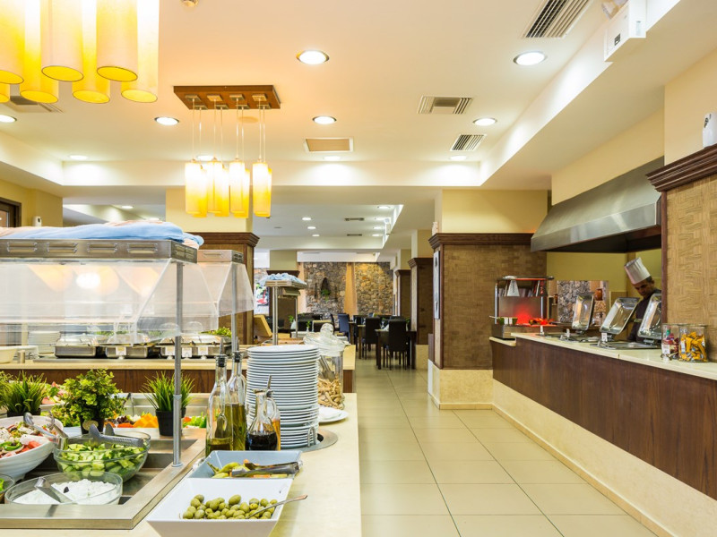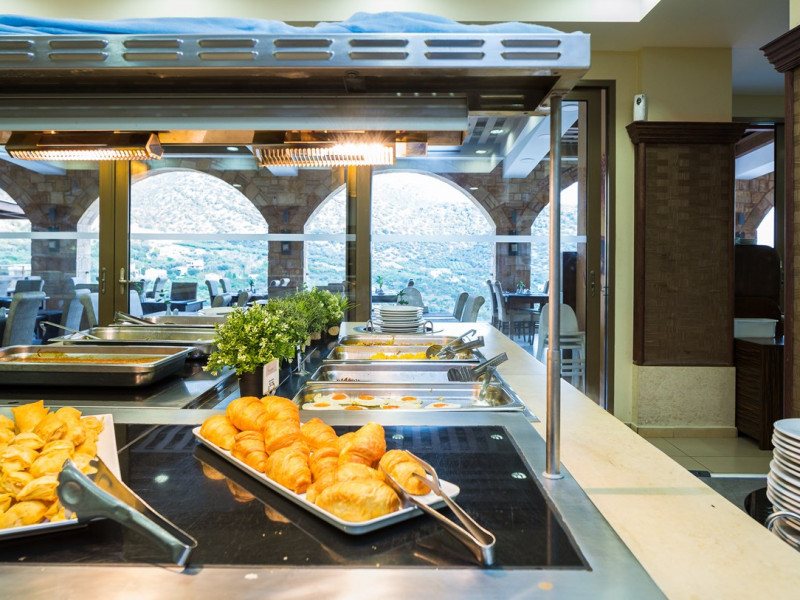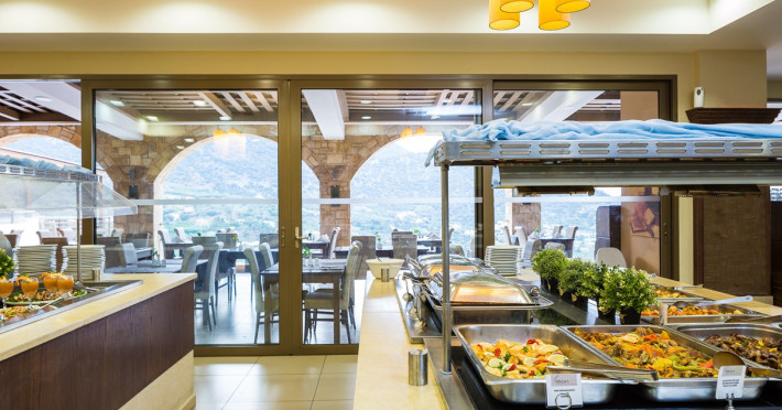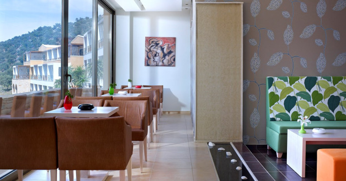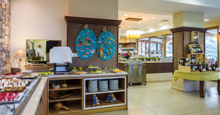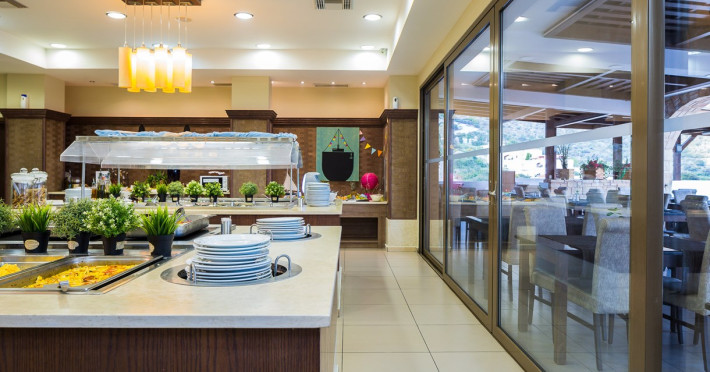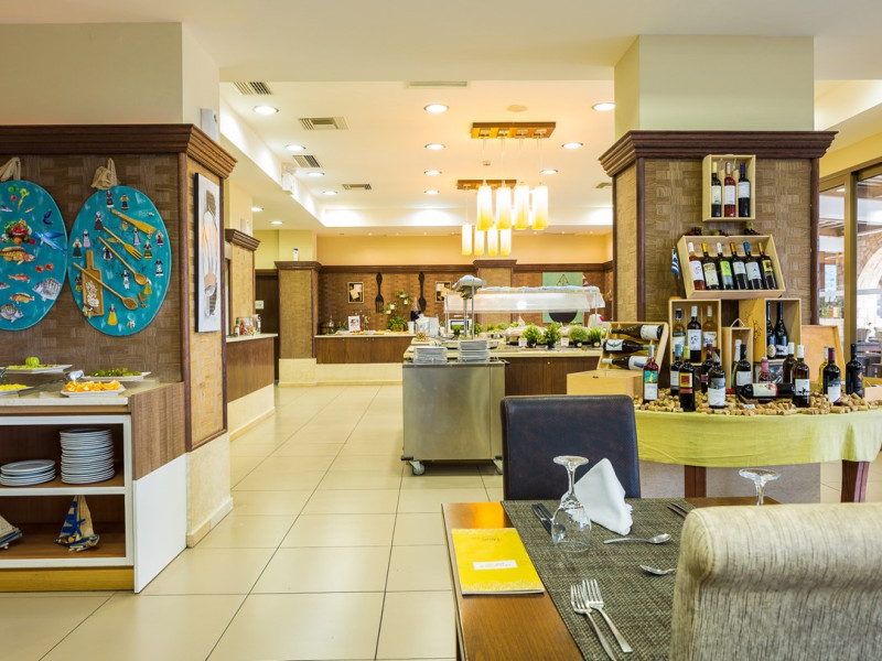 Tempting choices are prepared on a daily basis by the hotel's executive chef and tantalize you with their variety, taste, and quality of palatable local products. The extensive buffets for breakfast, lunch, and dinner are going to be a real temptation that no one can resist. Viewing the Pools and the gardens with the blinding sunlight or the soft wavering of the candles, the wonderful atmosphere of the lounge bar will fascinate you and capture your imagination.Every Thursday at noon, a cooking lesson on creating Greek Specialties is provided free from our kitchen Chef.