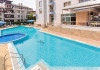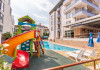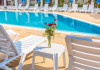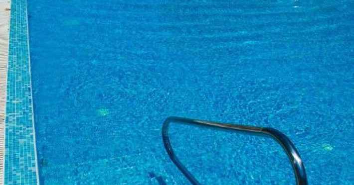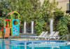 Piscina exterioara cu sectiune pentru copii. Sezlonguri si umbrele de soare la piscina.