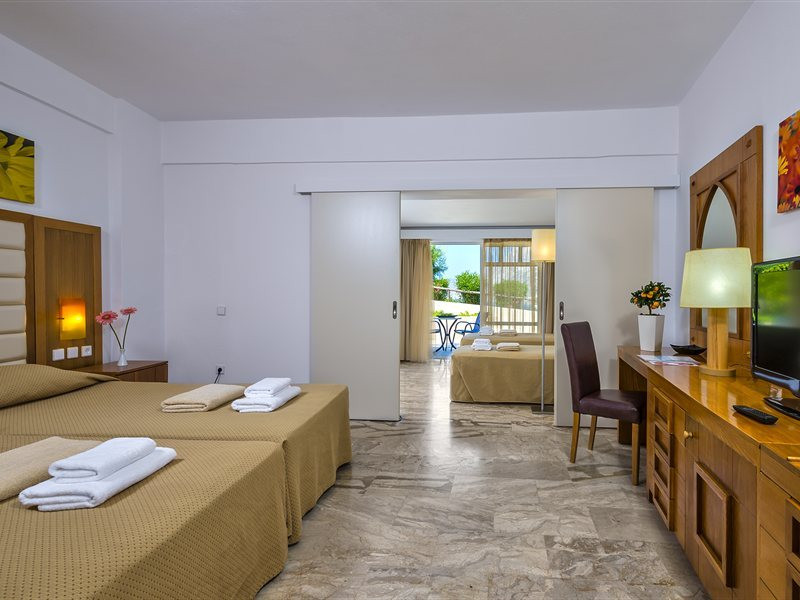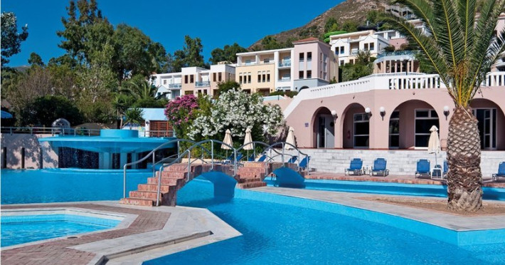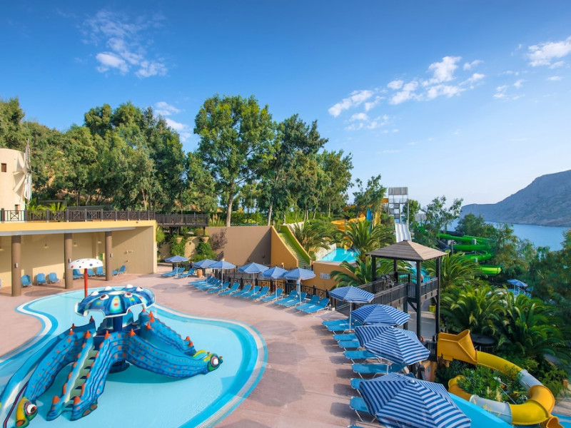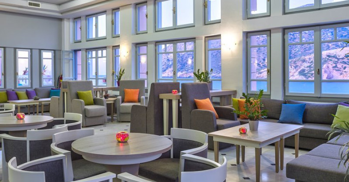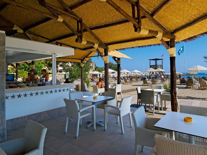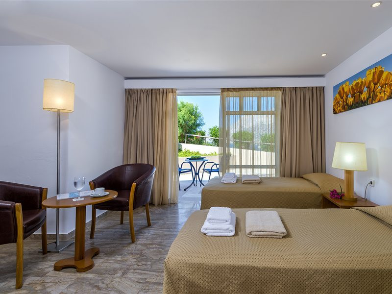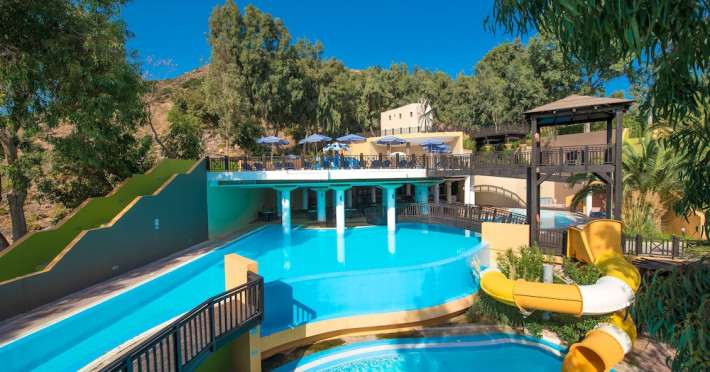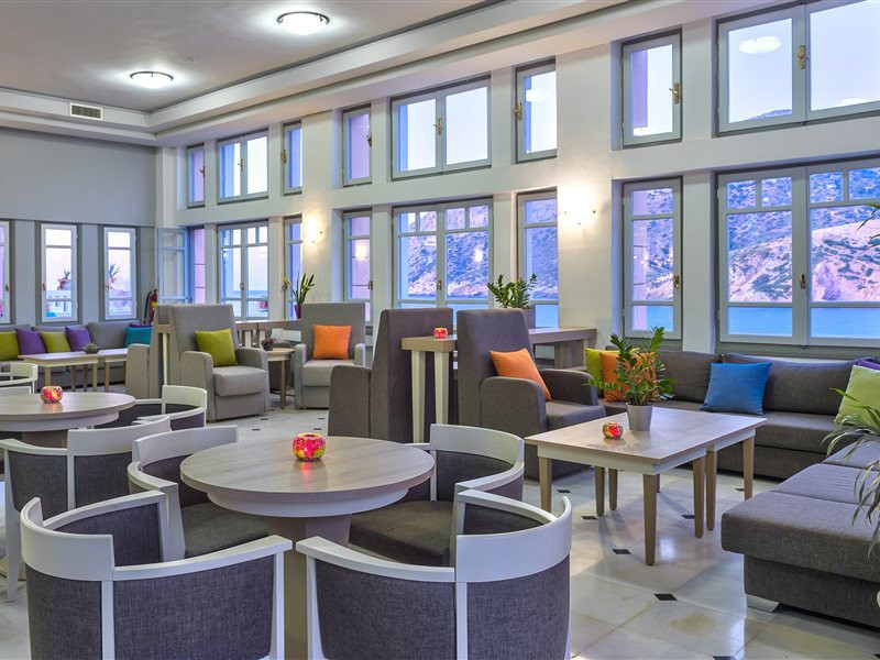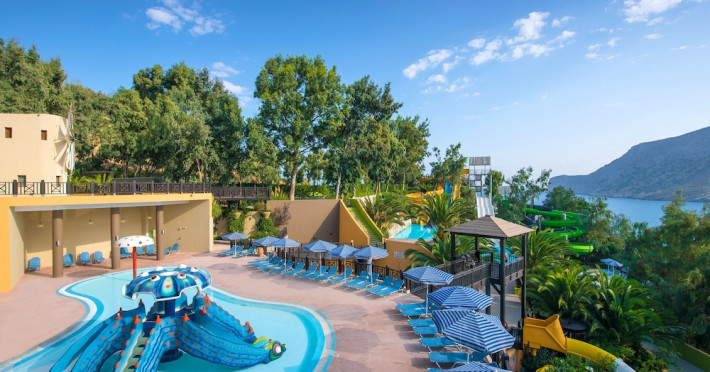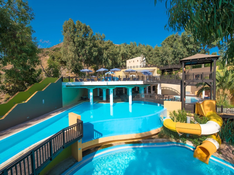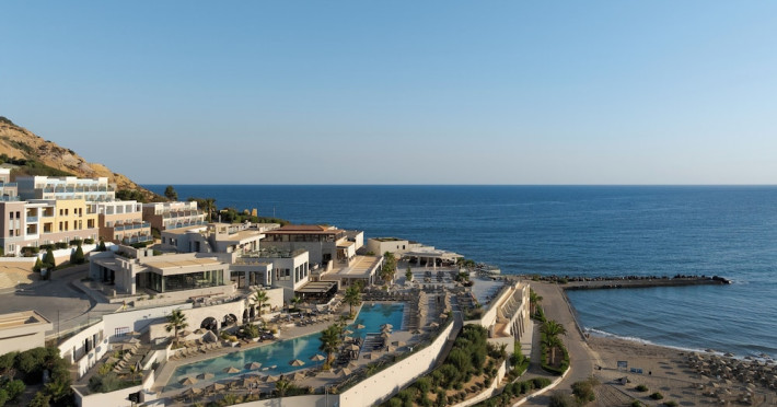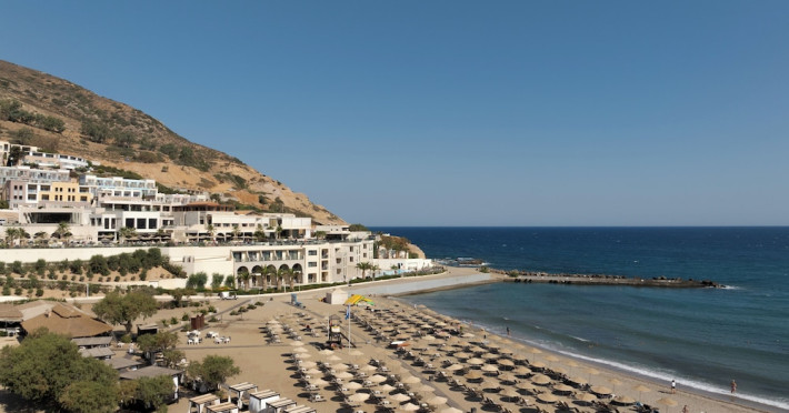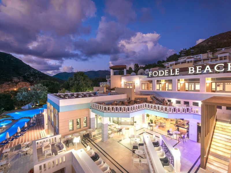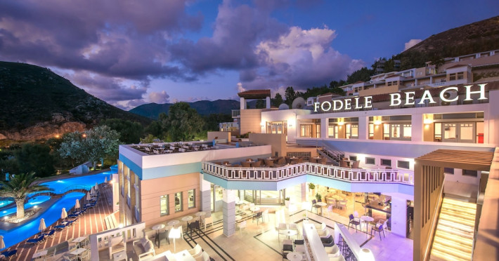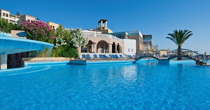 Facilities and services include a lobby with lounges, several terraces with sea view, three swimming pools, one of which is heated during the low season, two separate children’s pools, sun terrace with sun beds and parasols, pool bar, snack bar, lounge bar, beach bar, restaurants, tennis courts, gym, mini golf, billiards, games room, basketball court, congress hall, beach towels, playground and children’s club. A small shopping centre and hair dresser are also available in the hotel area.Guest rooms are equipped with air conditioning, bathroom with hair dryer, satellite TV, radio, safe (with charge), telephone, fridge and balcony or terrace.Please note:Any problems, complaints or issues which have not been communicated to the representatives of the Hotel or the T.O during the stay will not be acknowledged after guests’ departure.Pets are not allowed.The DBL GV & SV rooms have showers onlyWi- Fi is free of charge all over the hotel, but an extra charge with high speed.** Please note that some of the above facilities may be closed due to weather / seasonal conditions. The All Inclusive-concept includes all meals (breakfast, lunch, dinner and snacks) and mealtime drinks such as soft drinks, beer, wine, water and alcoholic drinks, all of local brands. Drinks are served from morning until late evening (approx until 22.-24.00 hrs). Opening times vary between different hotels. In certain hotels the activities program is also included.Address: Fodele 71500, Crete, Greece