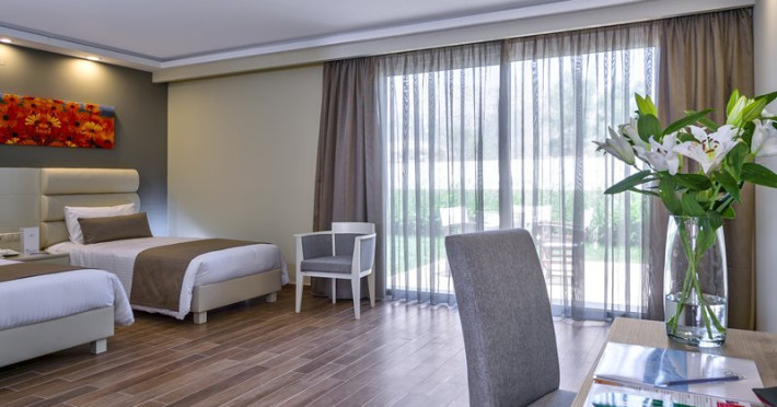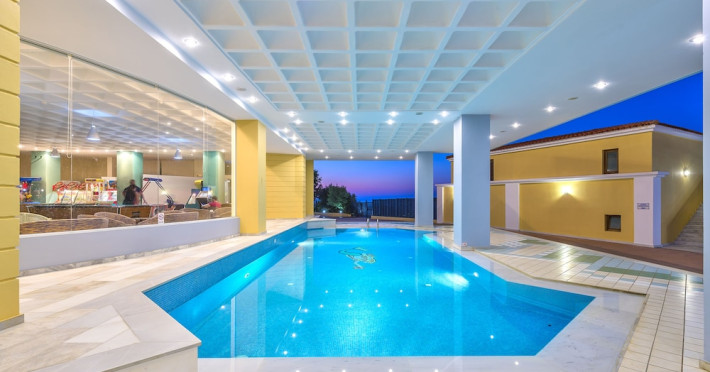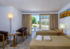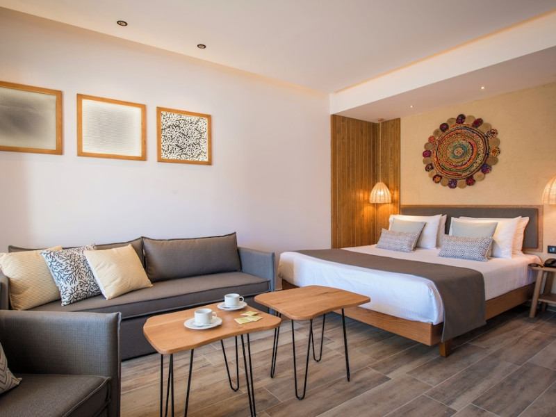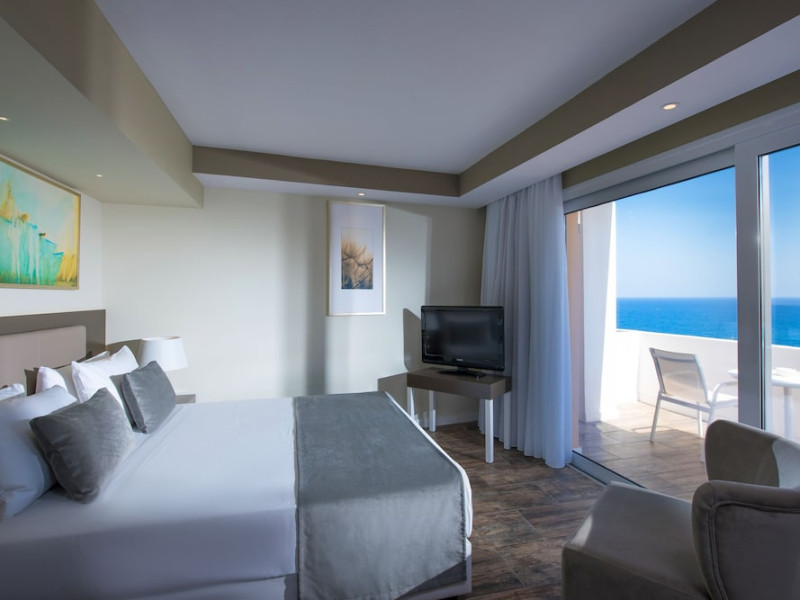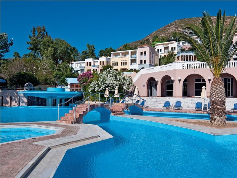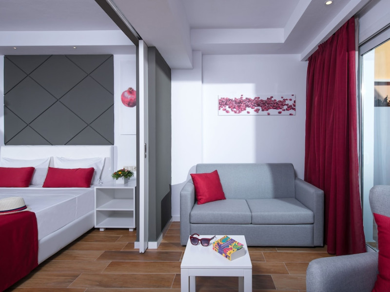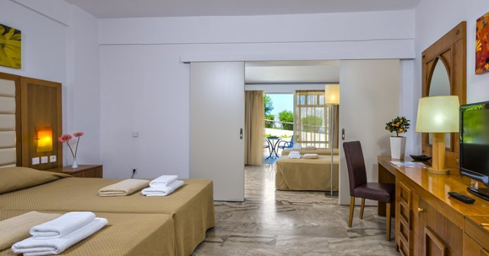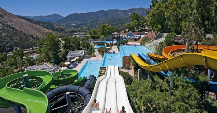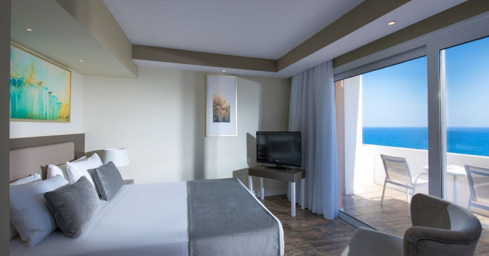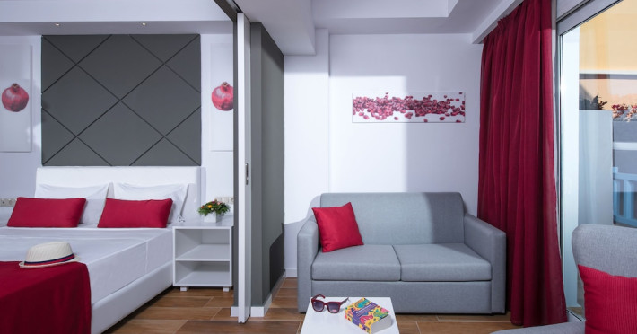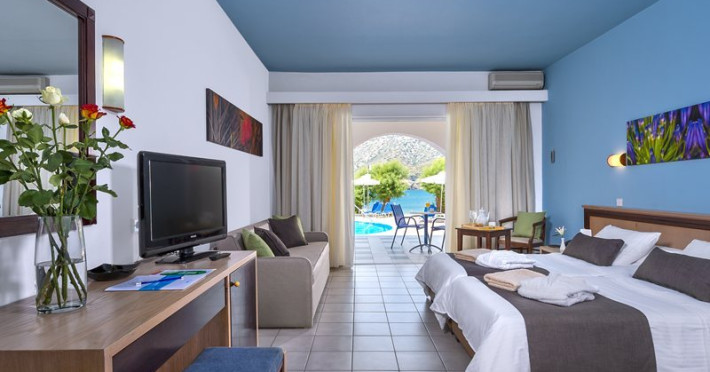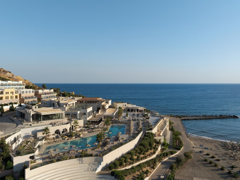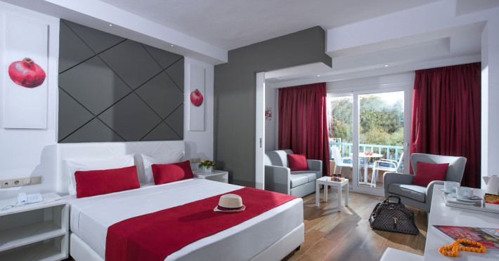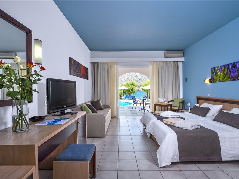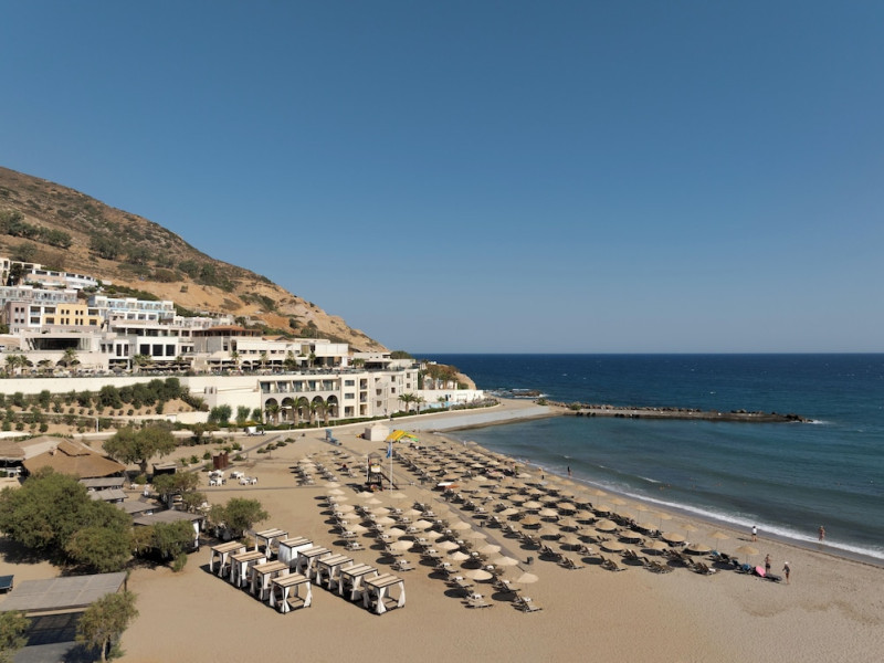 Facilities and services include a lobby with lounges, several terraces with sea view, three swimming pools, one of which is heated during the low season, two separate children’s pools, sun terrace with sun beds and parasols, pool bar, snack bar, lounge bar, beach bar, restaurants, tennis courts, gym, mini golf, billiards, games room, basketball court, congress hall, beach towels, playground and children’s club. A small shopping centre and hair dresser are also available in the hotel area.Guest rooms are equipped with air conditioning, bathroom with hair dryer, satellite TV, radio, safe (with charge), telephone, fridge and balcony or terrace.Please note:Any problems, complaints or issues which have not been communicated to the representatives of the Hotel or the T.O during the stay will not be acknowledged after guests’ departure.Pets are not allowed.The DBL GV & SV rooms have showers onlyWi- Fi is free of charge all over the hotel, but an extra charge with high speed.** Please note that some of the above facilities may be closed due to weather / seasonal conditions. The All Inclusive-concept includes all meals (breakfast, lunch, dinner and snacks) and mealtime drinks such as soft drinks, beer, wine, water and alcoholic drinks, all of local brands. Drinks are served from morning until late evening (approx until 22.-24.00 hrs). Opening times vary between different hotels. In certain hotels the activities program is also included.Address: Fodele 71500, Crete, Greece