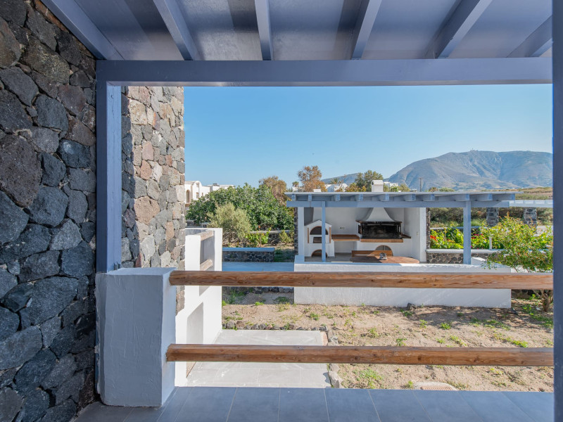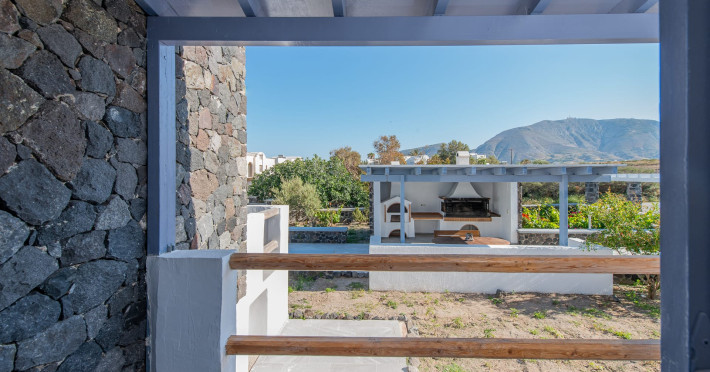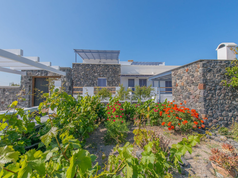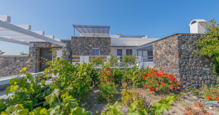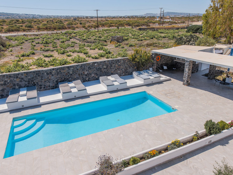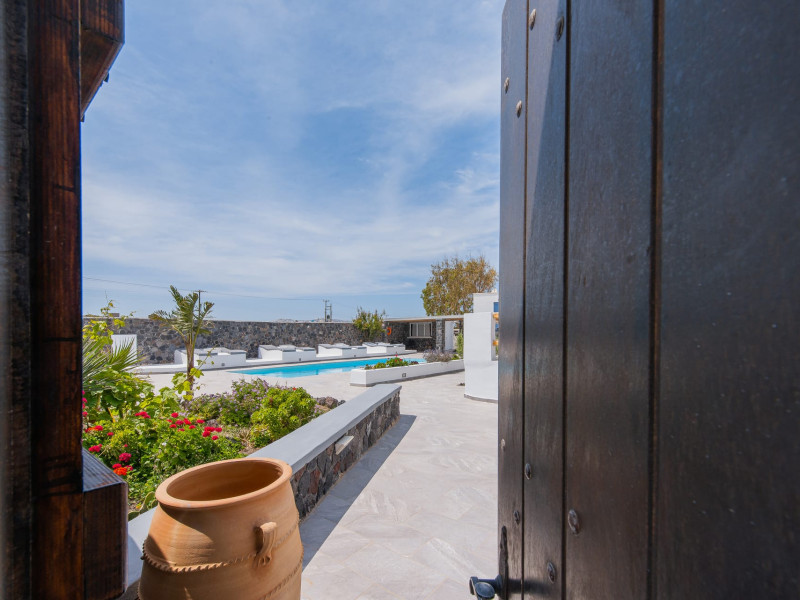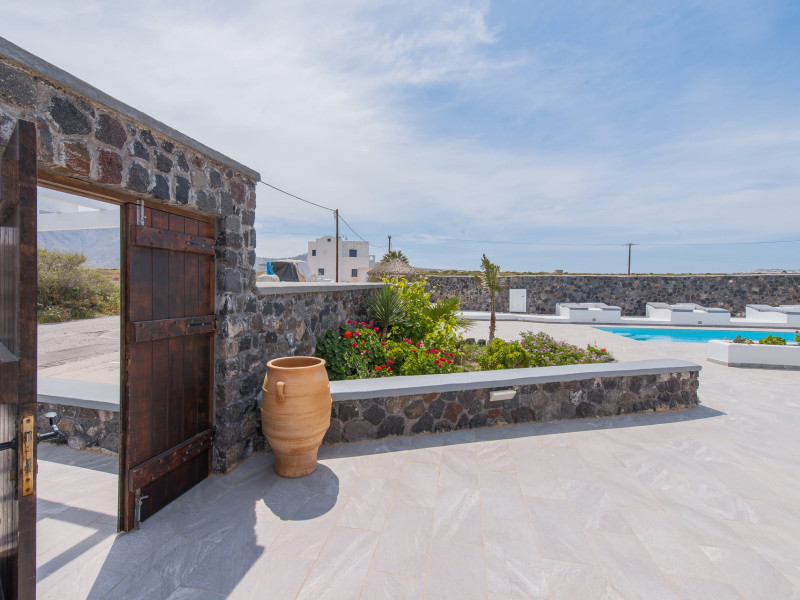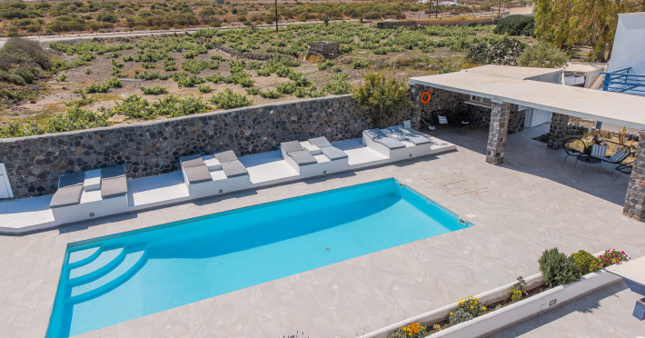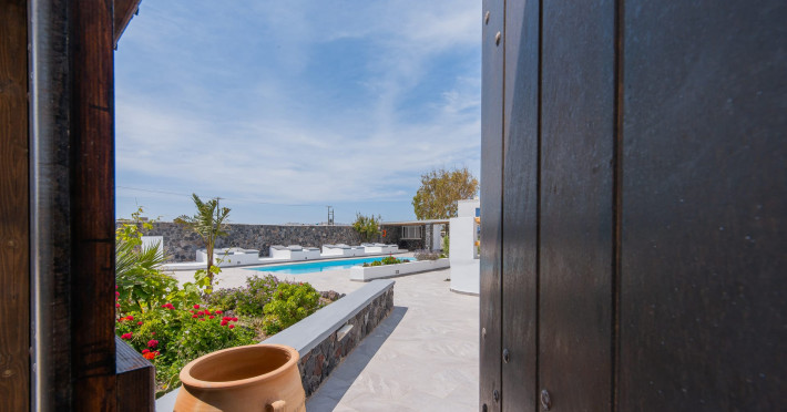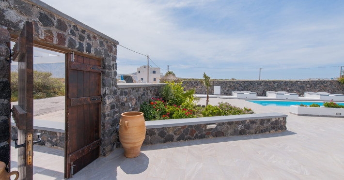 It is not only that: the beach is just one short walk of less than 1’ away, where one can enjoy a swim or take time for reflection walking by the seaside gazing the deep blue sea! If one is looking for a bit of pampering, a well-organized beach with sunbeds is just 3’ drive away; perhaps the family-friendliest beach of Santorini with shallow waters and playground which ensure a great & safe day on the beach for the whole family!