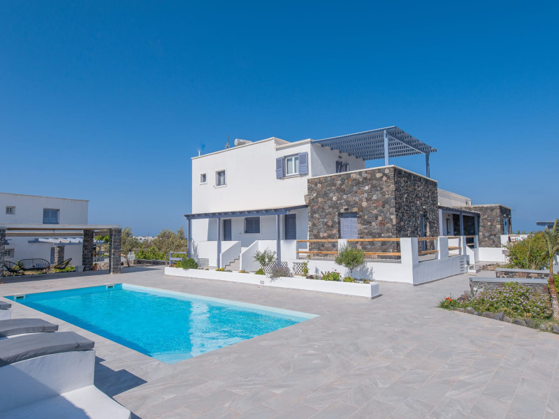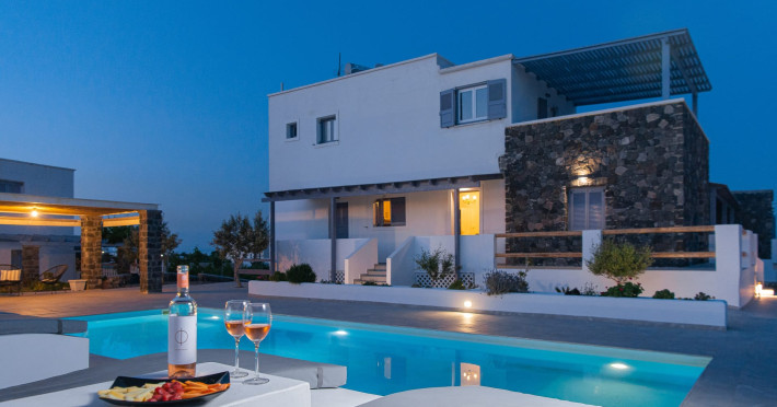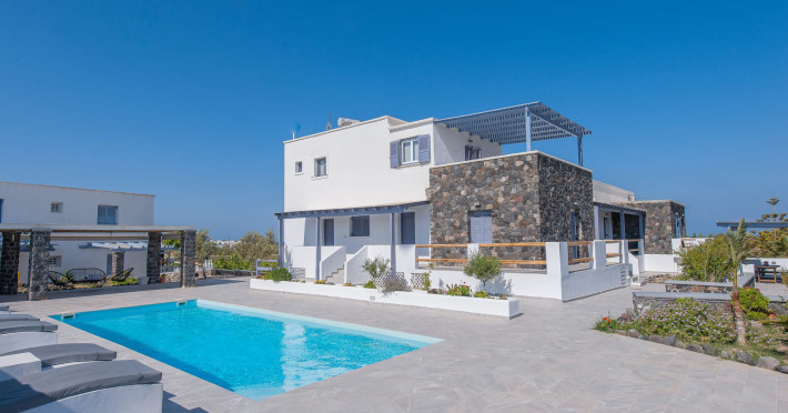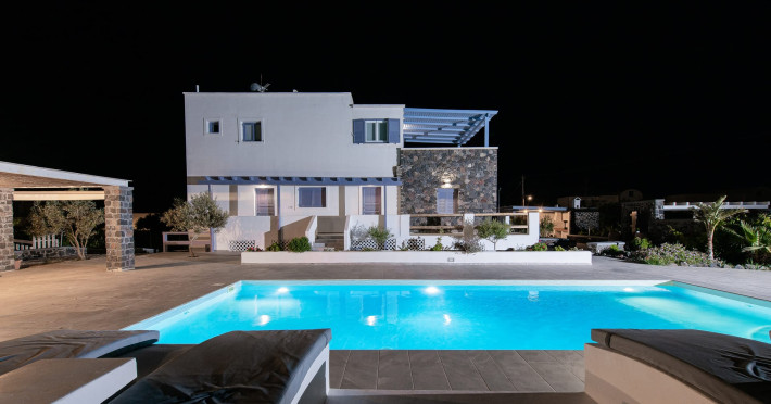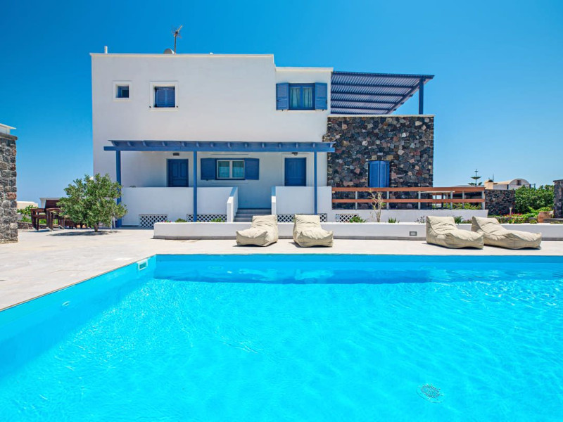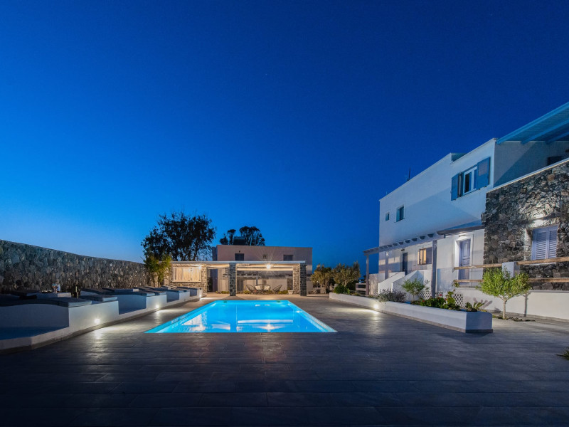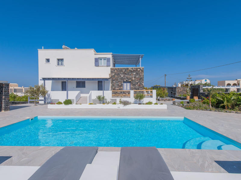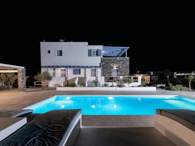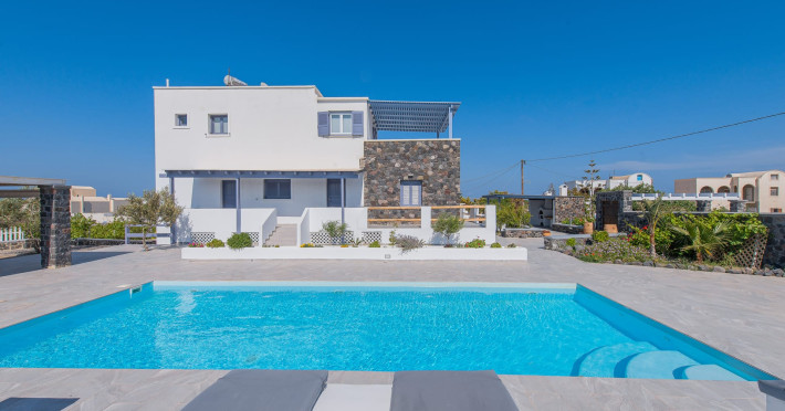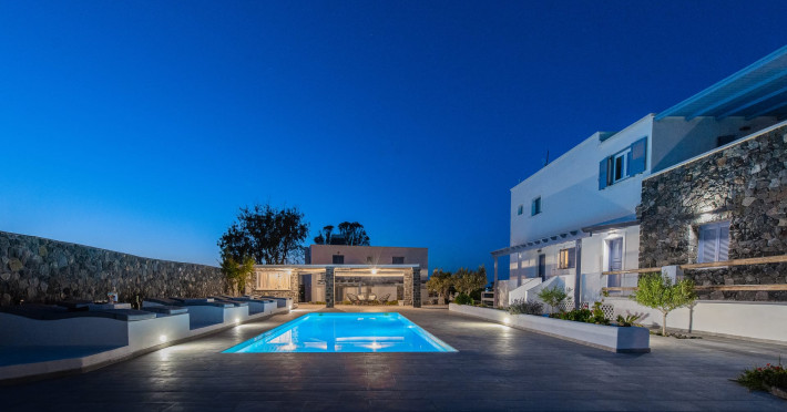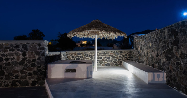 It is not only that: the beach is just one short walk of less than 1’ away, where one can enjoy a swim or take time for reflection walking by the seaside gazing the deep blue sea! If one is looking for a bit of pampering, a well-organized beach with sunbeds is just 3’ drive away; perhaps the family-friendliest beach of Santorini with shallow waters and playground which ensure a great & safe day on the beach for the whole family!