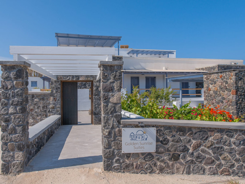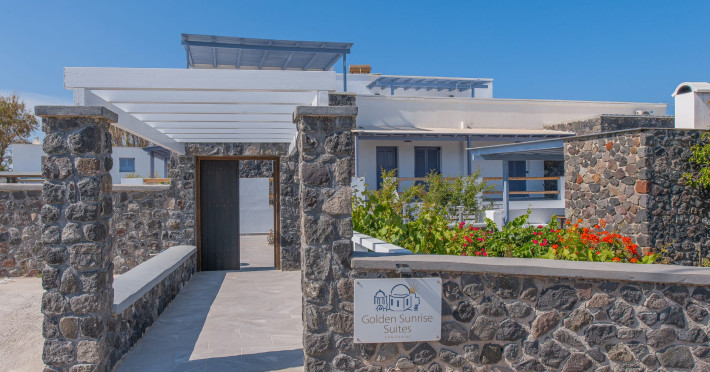 Golden Sunrise Suites is located in Kamari and it is a complex of four spacious suites designed to provide its guests with the Santorini experience in a peaceful and relaxed environment. The traditional Cycladic Architecture of the building warmly blends with the dark grey colors of the surroundings and the light blue of the sky, while it allows for moments of tranquility and privacy.