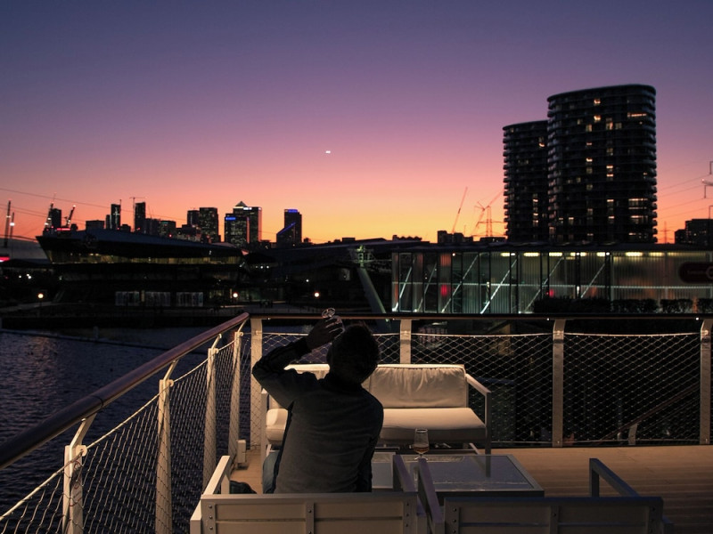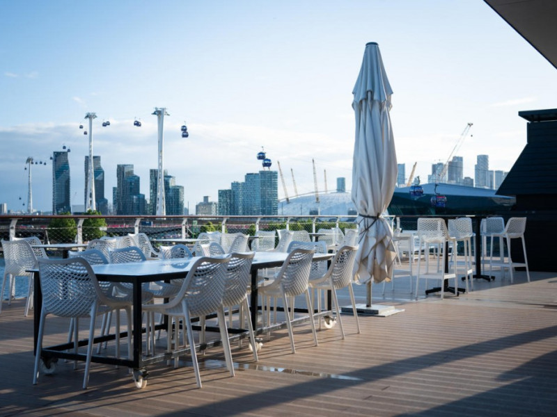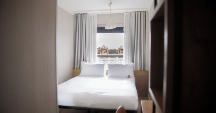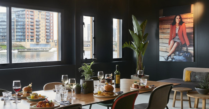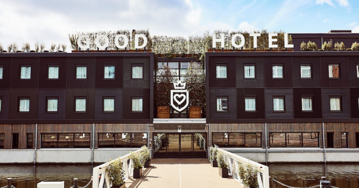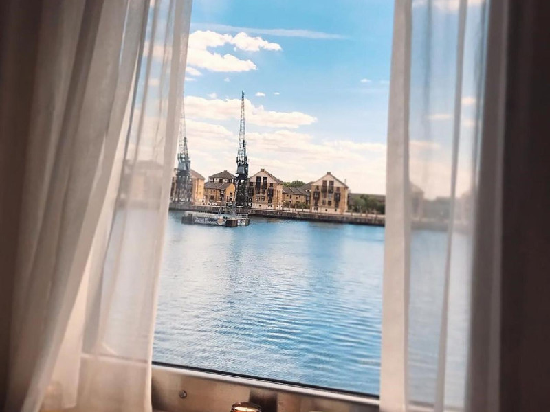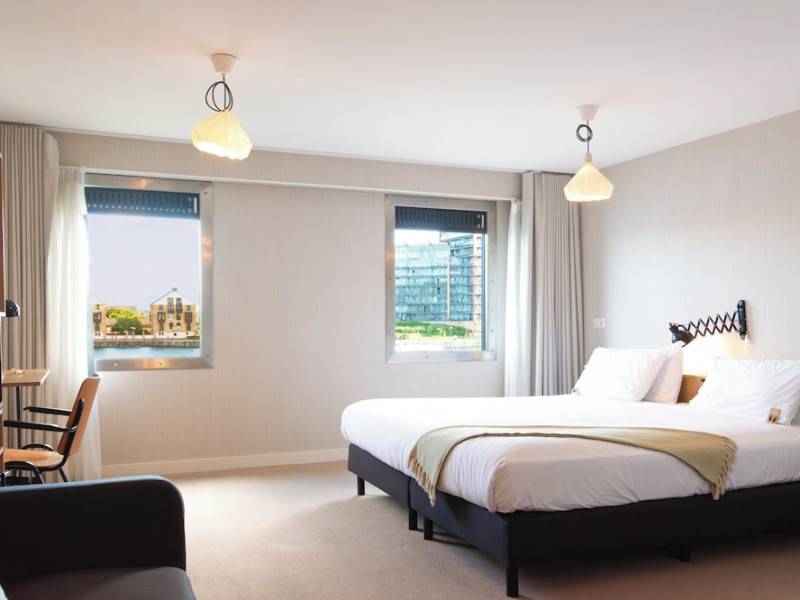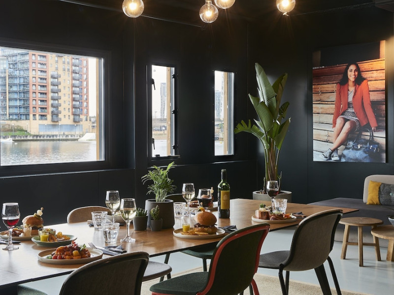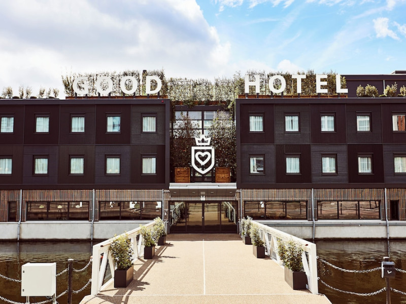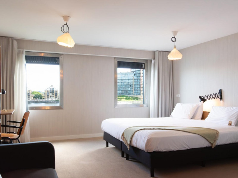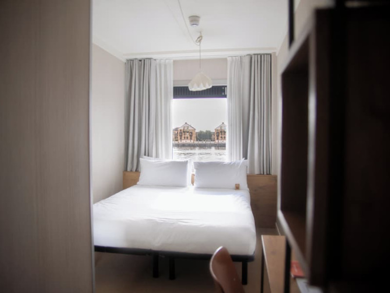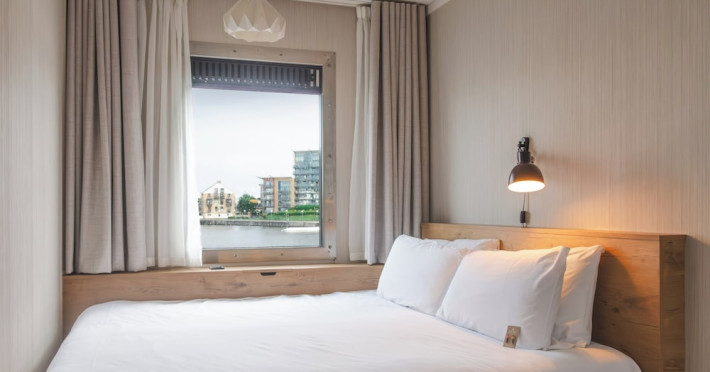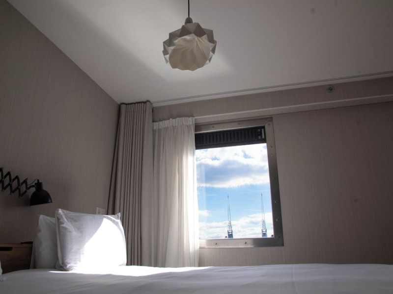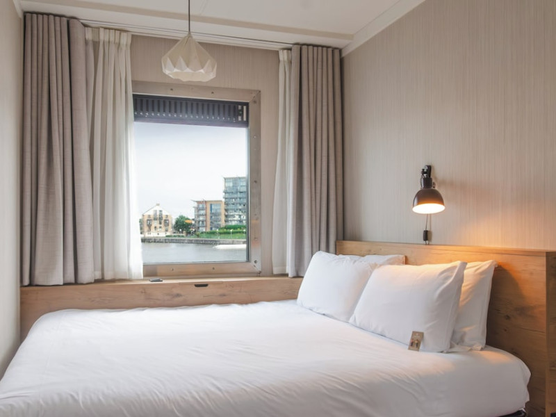 Good Hotel London is a unique, floating hotel on the Royal Victoria Docks, offering stunning views of the River Thames and the London skyline. Located near City Hall, ExCeL London, London City Airport, the O2 Arena, Stratford London Stadium, and Canary Wharf, it provides easy access to central London via the Elizabeth Line and DLR. The hotel features a rooftop terrace, a living room, and minimalist design throughout. Amenities include complimentary Wi-Fi, concierge services, a snack bar/deli, two bars/lounges, and a restaurant (The Living Room). A buffet breakfast is served daily (weekdays 7:00 AM-10:30 AM, weekends 7:30 AM-10:30 AM, fee applies). Other amenities include dry cleaning/laundry services, a 24-hour front desk, multilingual staff, conference space, and nine meeting rooms. Rooms are air-conditioned and include private bathrooms with showers, complimentary toiletries, hair dryers, safes, desks, and daily housekeeping. Note that TVs are not currently available in rooms. The minimum age for check-in is 18. Good Hotel is a social business; profits support training programs for the long-term unemployed in London and education for disadvantaged children in Guatemala. The hotel is approximately 0.5 km from ExCeL London and 3.5 km from London City Airport. The Good Hotel London is a hotel.