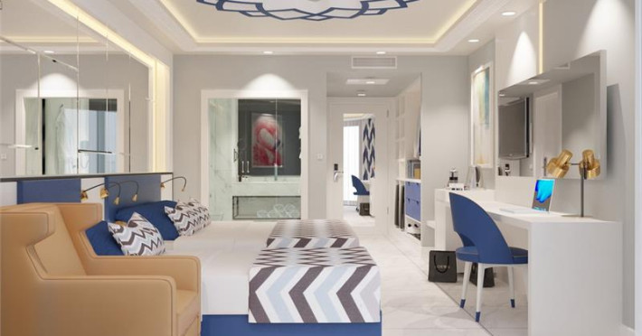Camerele standard au in jur de 35 m2 iar suitele au 75 m2, pot avea vedere la mare sau land view, balcon, baie cu dus si toaleta, Jacuzzi (doar in suite), sistem de incalzire/aer conditionat, telefon, minibar, set pentru ceai si cafea, pardoseala pe jos, acces internet wireless, seif, TV prin satelit inclusi canale cu muzica.
