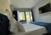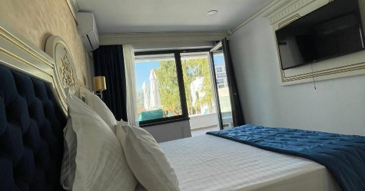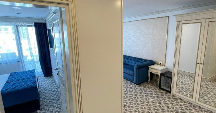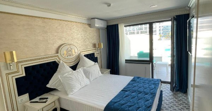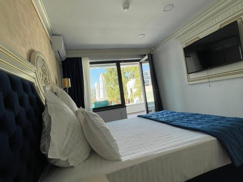 APARTAMENTE KING Apartamentul, cu o suprafata generoasa de 36mp este impartit in 3 zone specifice: dormitor, living open space si terasa cu vedere si iesire directa la zona de piscine si curtea interioara a resortului. Dormitorul este dotat cu pat matrimonial (160*200 cm), livingul spatios poate fi utilizat atat ca zona de relaxare precum si ca zona de dormit. Canapeaua este extensibila si foarte comoda, poate fi utilizata de doua persoane. Terasa spatioasa a apartamentului este dotata cu masuta, 4 scaune si un sezlong. De aici, exista acces direct la terasa exterioara si piscine. Pentru confortul dumneavoastra fiecare apartament este dotat cu aer conditionat, internet wireless gratuit, televiziune prin cablu. Acces in camera cu card margnetic, fiecare apartament are baie cu cabina de dus si toate dotarile necesare: feon, cosmetice, prosoape, halat, papuci de unica folosinta.