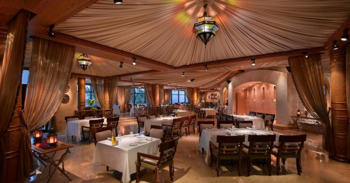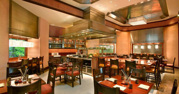 Oaspeţii de la Grand Hyatt au la dispoziţie restaurante care servesc mâncăruri indiene, japoneze şi din Singapore. Masa se poate lua şi pe una dintre terasele cu vedere la domeniile complexului. Bucătăriile deschise permit oaspeţilor să îi vadă pe bucătari în acţiune.