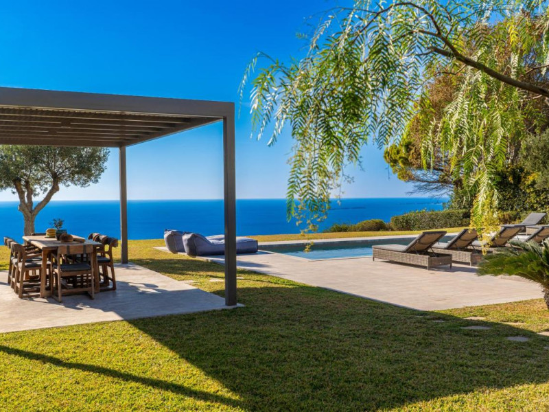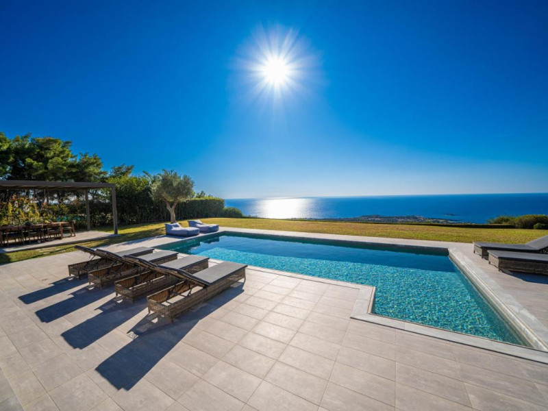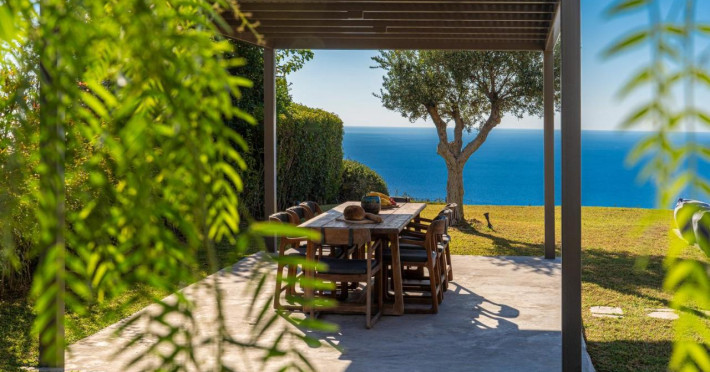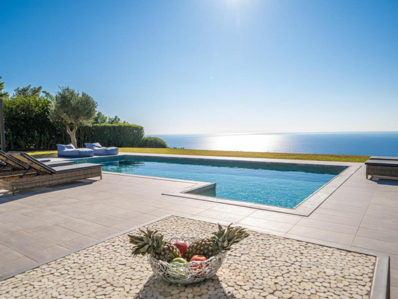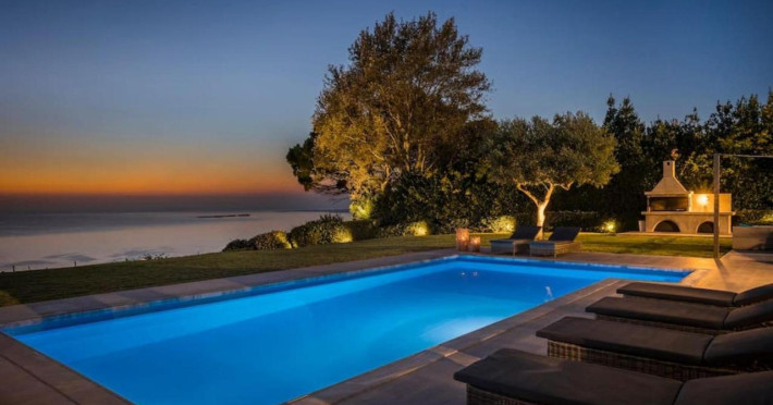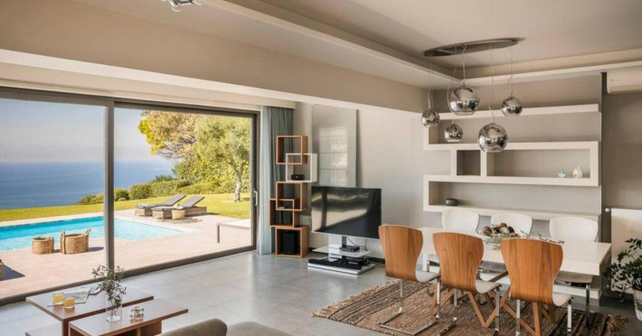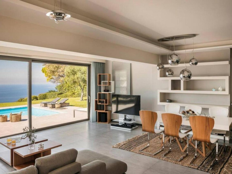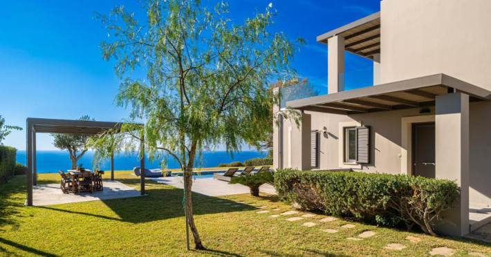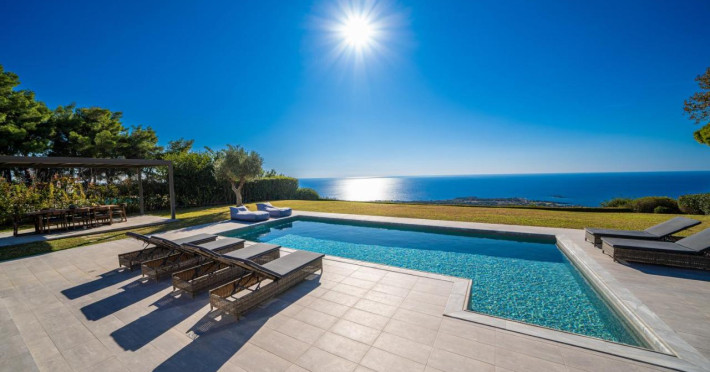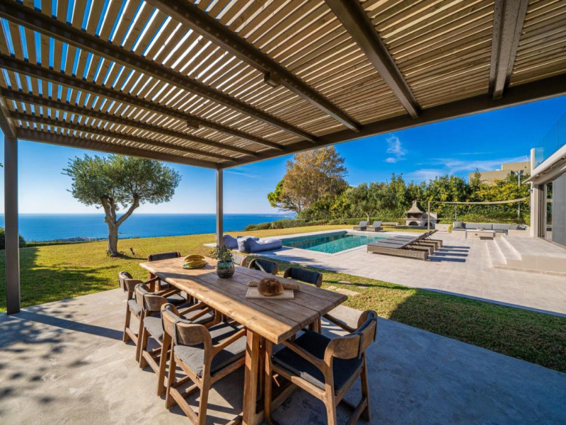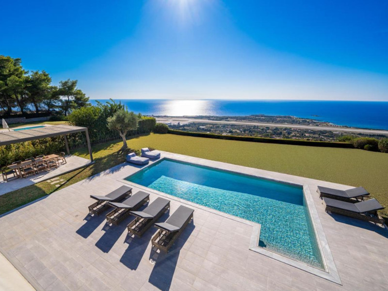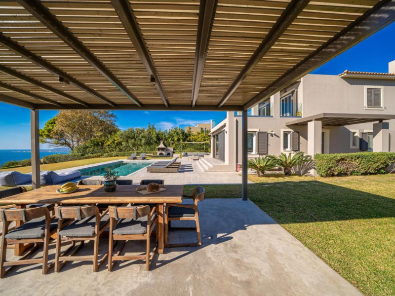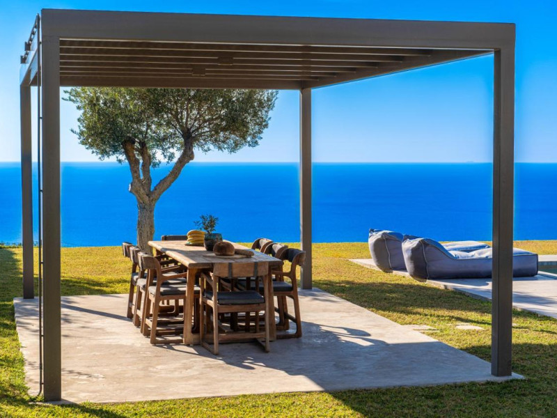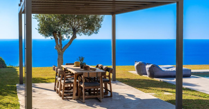 Set in its own large acre plot, Grande Azzurro is modern amp; minimalistic in design and can be honestly described as having the most breathtaking panoramic views of pretty much anywhere on the island and from every single aspect of the property. The extensive private grounds are fully landscaped and beautifully manicured all around, with the feature lawn area housing the patios, pool area, Al Fresco dining pergola, large external kitchen/BBQ area amp; an amazing more casual seating area: simply perfect for those mid-morning coffees and early evening cocktails alike. From every single area of the garden, the clear Blue Azure of the Ionian Sea is sure to dazzle and hypnotize in equal measures, as you sit or lie and just immerse yourself in these mesmerizing views.