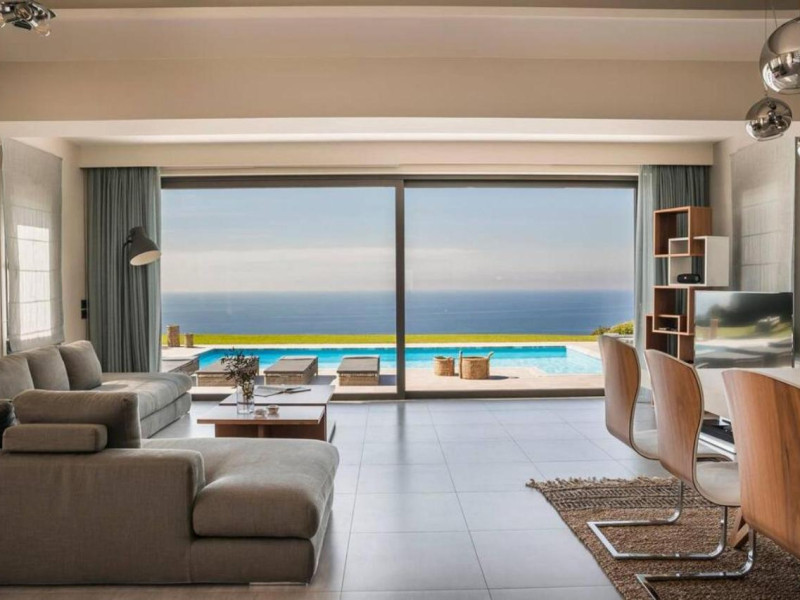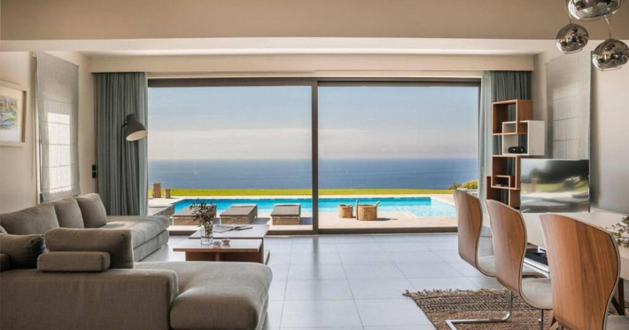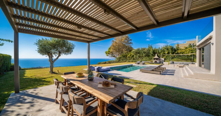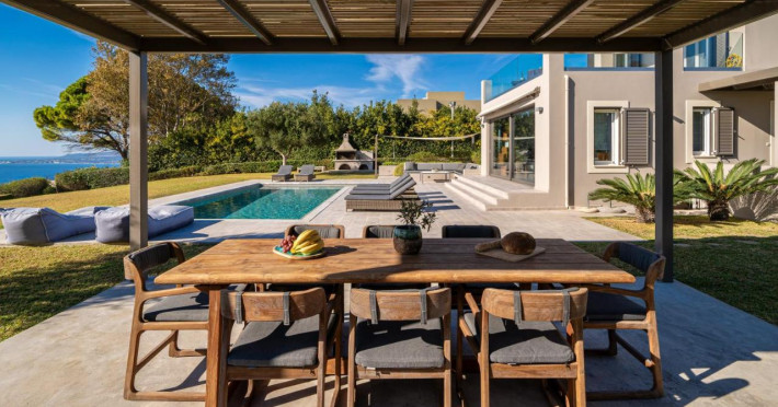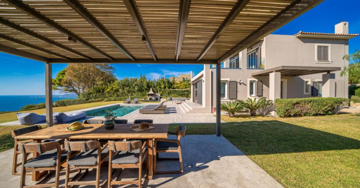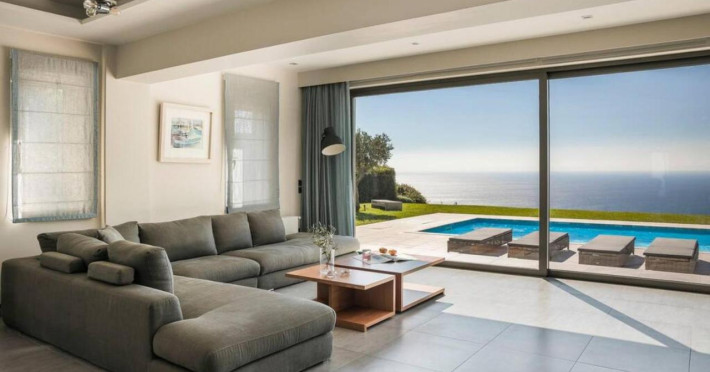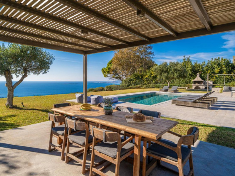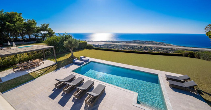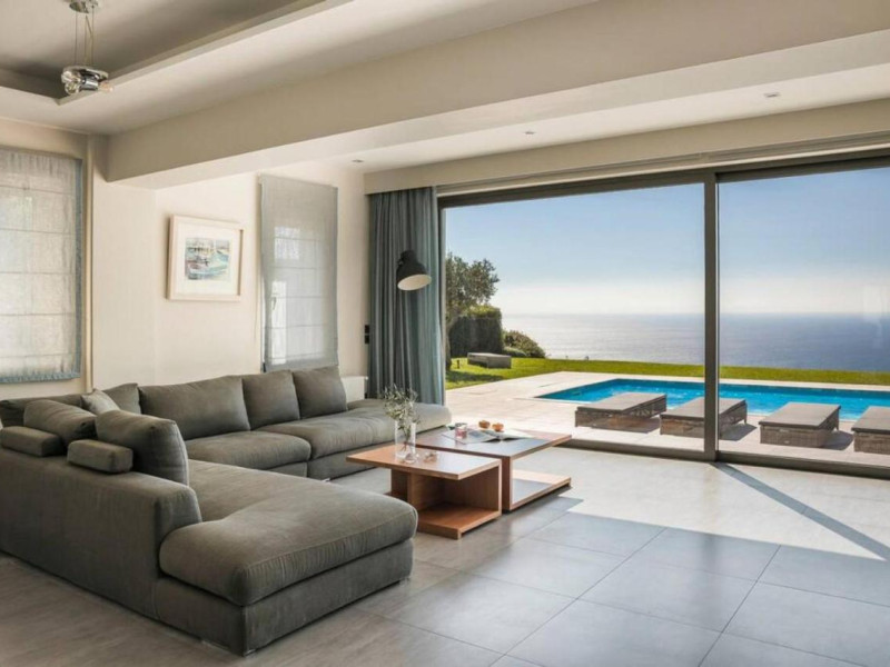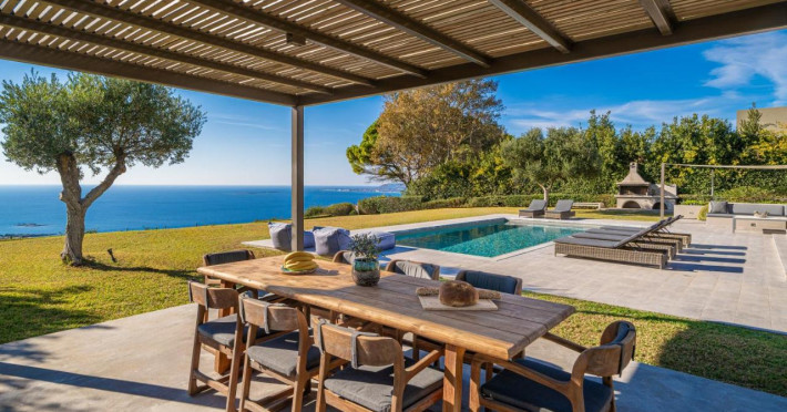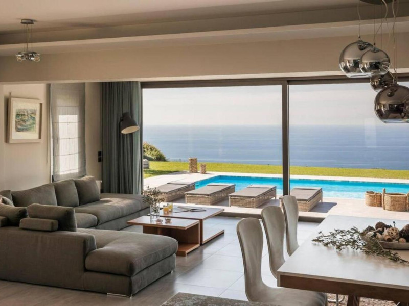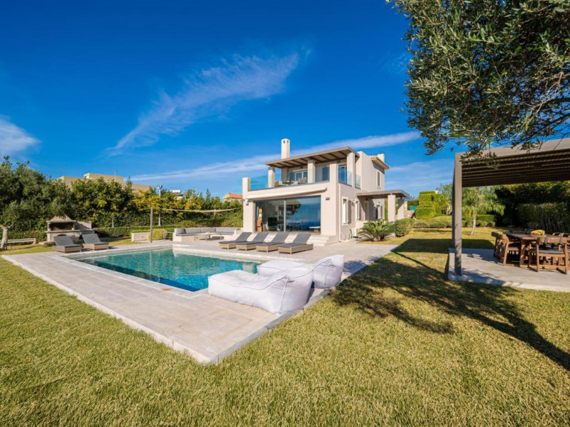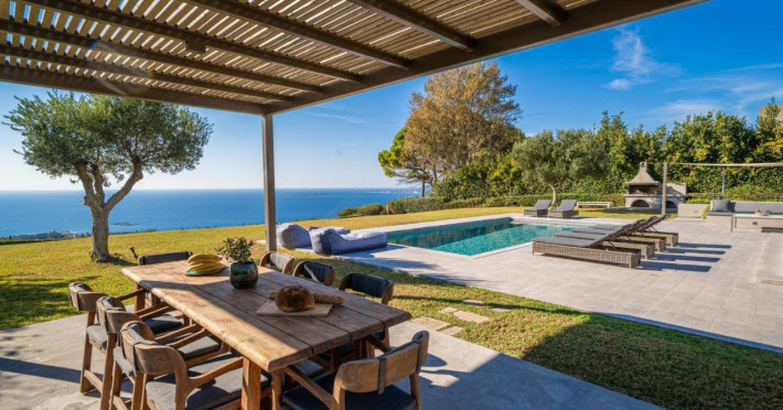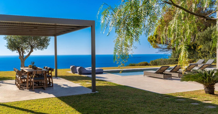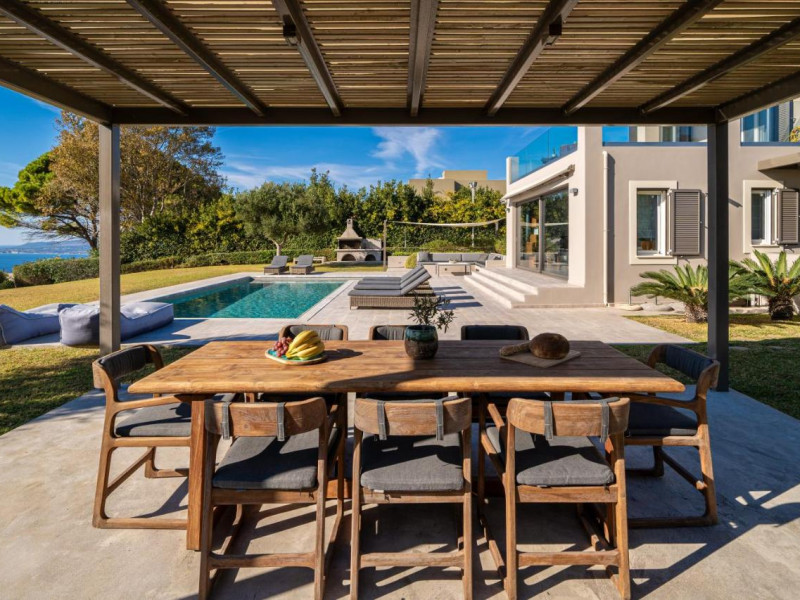 Set in its own large acre plot, Grande Azzurro is modern amp; minimalistic in design and can be honestly described as having the most breathtaking panoramic views of pretty much anywhere on the island and from every single aspect of the property. The extensive private grounds are fully landscaped and beautifully manicured all around, with the feature lawn area housing the patios, pool area, Al Fresco dining pergola, large external kitchen/BBQ area amp; an amazing more casual seating area: simply perfect for those mid-morning coffees and early evening cocktails alike. From every single area of the garden, the clear Blue Azure of the Ionian Sea is sure to dazzle and hypnotize in equal measures, as you sit or lie and just immerse yourself in these mesmerizing views.