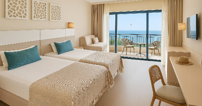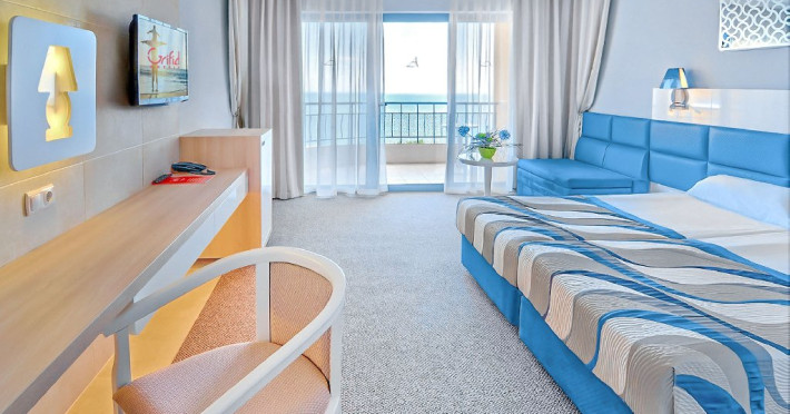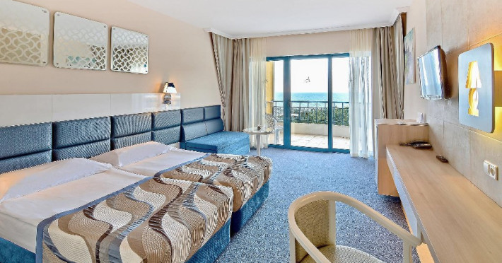 DBL 2+2 SEA SIDE: Aproximativ 26 - 30 mp. Pat dublu si doua paturi de o persoana standard (80/200 cm). Patul suplimentar este o canapea extensibila. Toate camerele au bai cu dus si cada. Uscator de par si oglinda cosmetica. Telefon cu apelare internationala. Sistem central de climatizare. TV prin satelit. Conexiune Wi-Fi gratuita. Seif in camera. Mini bar - reaprovizionat zilnic (apa, bauturi racoritoare, bere). Camere cu mocheta, cu balcon. Capacitatea maxima este de 3 adulti si 1 copil.