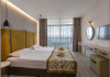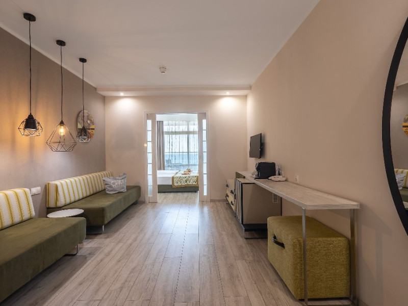 DBL 2+1 CONCEPT SEA: Aprox. 22 m2. Doua paturi unite in pat dublu. Patul suplimentar este de o persoana neextensibil cu dimensiunea: latime 80 cm. si lungime 190 cm. Toate camerele sunt cu bai cu dus. Uscator de par si oglinda cosmetica. Telefon cu apelare internationala. Sistem central de climatizare. Televiziune prin satelit. Conexiune Wi-Fi gratuita. Seif in camera (gratuit). Mini bar - gratuit, reaprovizionat zilnic (apa, bauturi racoritoare, bere). Toate camerele sunt cu parchet laminat. Balcon. Facilitati pentru ceai si cafea in toate camerele (gratuit). Meniu de perne. Meniu de top pentru saltele - la cerere. Acest tip de camera ofera servicii suplimentare incluse in pret: etaj superior cu vedere la mare, capsule de cafea si aparat de cafea, articole de toaleta de marca, papuci si halate de baie. Capacitate maxima de 2 adulti + 1 copil sau 3 adulti.