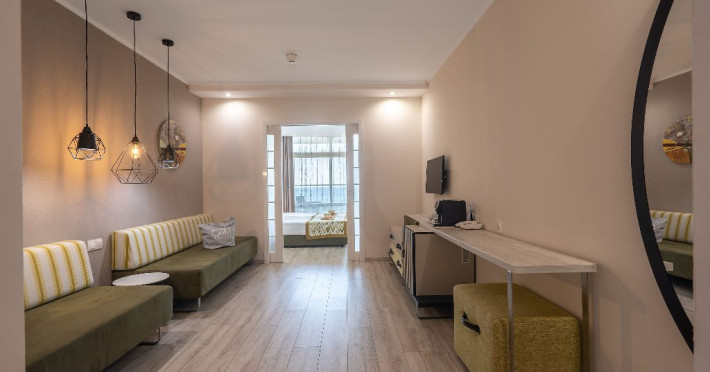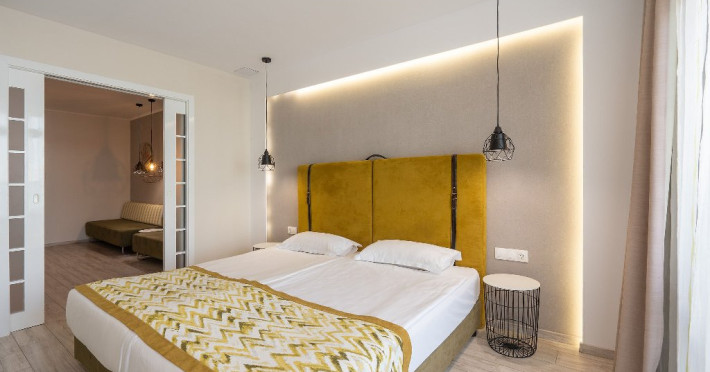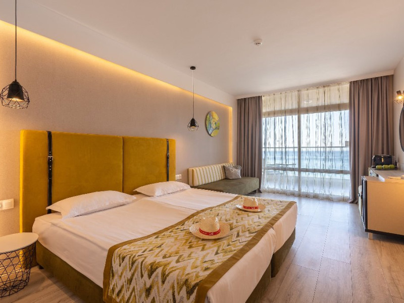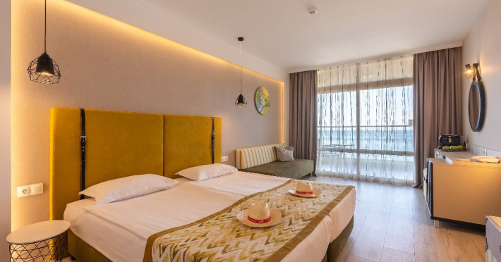 DBL 2+1 SEA: Aprox. 22 m2. Doua paturi unite in pat dublu. Patul suplimentar este de o persoana neextensibil cu dimensiunea: latime 80 cm. si lungime 190 cm. Toate camerele sunt cu bai cu dus. Uscator de par si oglinda cosmetica. Telefon cu apelare internationala. Sistem central de climatizare. Televiziune prin satelit. Conexiune Wi-Fi gratuita. Seif in camera (gratuit). Mini bar - gratuit, reaprovizionat zilnic (apa, bauturi racoritoare, bere). Toate camerele sunt cu parchet laminat. Balcon. Facilitati pentru ceai si cafea in toate camerele (gratuit). Meniu de perne. Meniu de top pentru saltele - la cerere. Capacitate maxima de 2 adulti + 1 copil sau 3 adulti.