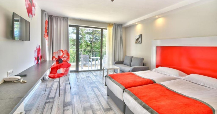 GRIFID FORESTA HOTEL 3*, NISIPURILE DE AUR - Adults Only +16 ani ! Grifid Foresta este situat intr-o zona linistita, langa Aquapark din Nisipurile de Aur, la 800 m. distanta de centrul statiunii Nisipurile de Aur si la 20 m. din statia de autobuz. Plaja: Nisipos, 800 m. departe. Fundul marii este plat, cu acces lin. Cazare: bloc cu 3 etaje cu 46 camere duble dotate cu TV satelit, uscator de par, aer conditionat, wi-fi. Fiecare camera dispune de baie proprie cu dus si chiuveta, separata optic de camera, balcon, parchet laminat. Seif, minibar, aparat de cafea/ceai. Exista lift la hotel. DBL 2+1: Aprox. 29 mp. Doua paturi care sunt unite. Este posibil sa fii separat. Patul suplimentar este o canapea extensibila. Toate camerele au baie cu dus. Chiuveta separata de baie. Uscator de par. Telefon cu apelare internationala. Sistem central de climatizare. Televiziune prin satelit. Conexiune Wi-Fi gratuita. Seif in camera la un cost suplimentar. Mini bar - gratuit, reaprovizionare zilnic/apa, bauturi racoritoare, bere/. Toate camerele sunt cu parchet laminat. Balcon. Facilitati de ceai si cafea gratuite in toate camerele. Meniu de perne. Capacitate maxima pentru 3 adulti. Animale de companie - nu sunt acceptate! Hotelul nu are conditii pentru cazarea persoanelor cu dizabilitati. Despre hotel: restaurant principal, lobby bar, bar la piscina, piscina exterioara cu terasa la soare, umbrela si sezlong la piscina. Receptie 24 de ore si securitate 24 de ore. Sport si Spa: tenis de masa, darts, biciclete de inchiriat. Fitness si distractie in aer liber. Zona de relaxare. Camere de masaj; tratamente faciale si corporale/ la hotel Arabella/ Parcare: Gratuita, nepazita, locuri limitate! Hotelul isi rezerva dreptul de a modifica pretul parcarii in orice moment.
