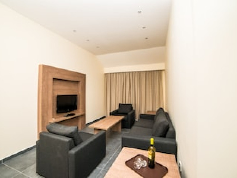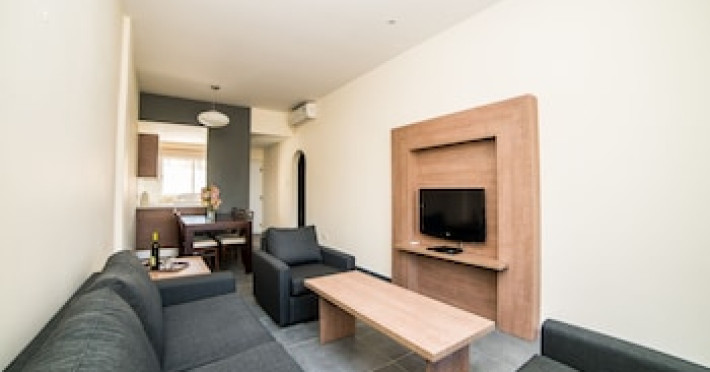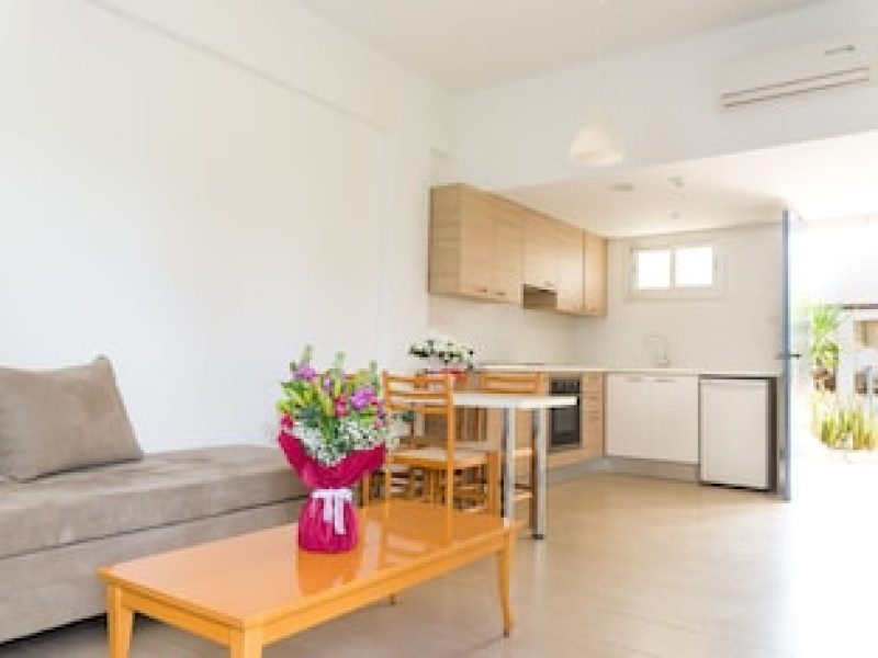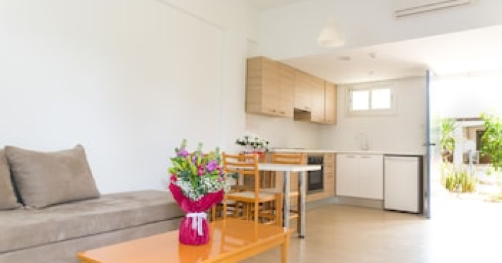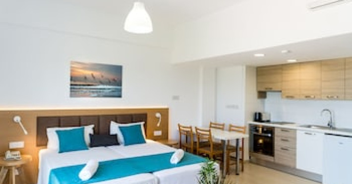 Hotelul Helios Bay oferă o gamă de studiouri, apartamente și vile cu 2 dormitoare, toate mobilate în stil cipriot tradițional, cu unități de cazare în sistem self-catering. Dotată cu aer condiționat și încălzire, fiecare locuință are o chicinetă complet echipată, baie și balcoane sau terase private.