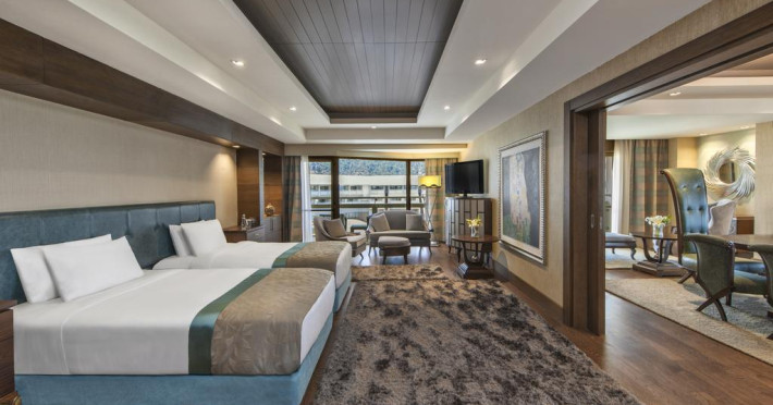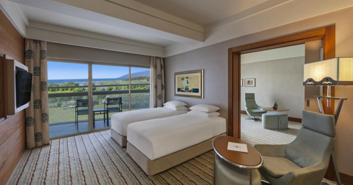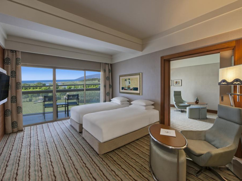 Hilton Dalaman Sarigerme oferă camere elegante, amenajate modern. Fiecare cameră are TV LCD, aer condiţionat şi balcon. Unele camere au vedere la mare sau la munte.