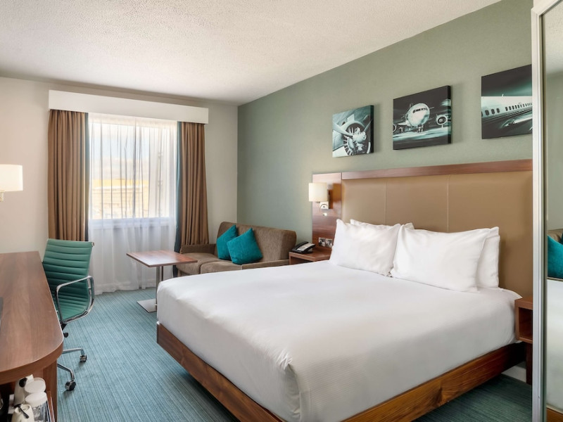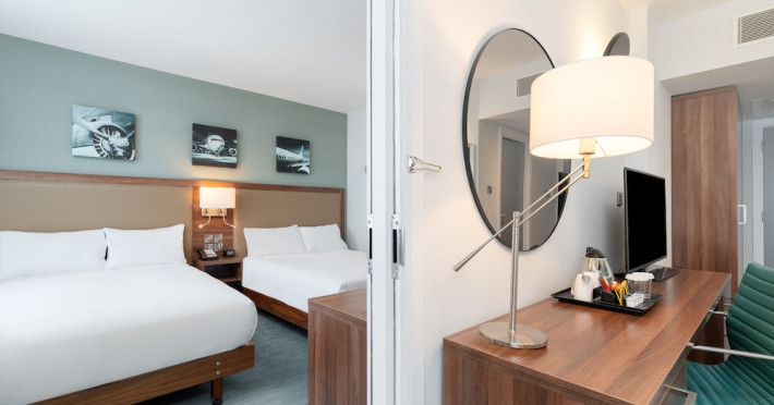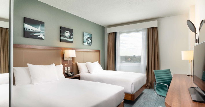 The Hilton Garden Inn London Heathrow Airport is a modern hotel located on the eastern perimeter of Heathrow Airport, a 5-minute walk from Hatton Cross Underground Station and a 10-minute drive from Terminals 2, 3, 4, and 5. It offers easy access to central London via the Piccadilly line. The hotel features a 24-hour front desk, an international restaurant (Jack's Restaurant & Bar), a bar serving beverages and light snacks, and a shop (Wundermart). Air-conditioned rooms include a spacious bathroom, work desk, and flat-screen TV. A varied breakfast, including made-to-order waffles and omelettes, is available. The hotel provides a bespoke Family Experience for children under 12, including a Kids Welcome, Kids Breakfast, and Kids Menu. On-site parking is available. The H2A and H5A Hotel Hoppa Buses provide transport to/from airport terminals (peak times only). Hounslow centre is a 15-minute bus ride away. The hotel is within the free Heathrow underground travel zone, allowing free travel between Hatton Cross and all Heathrow terminals. The Hilton Garden Inn London Heathrow Airport is a Airport Hotel, Business, Eco Friendly, Modern hotel. The nightlife/restaurants are easily accessible by taxi or bus from the hotel.