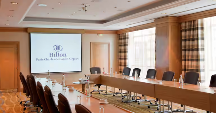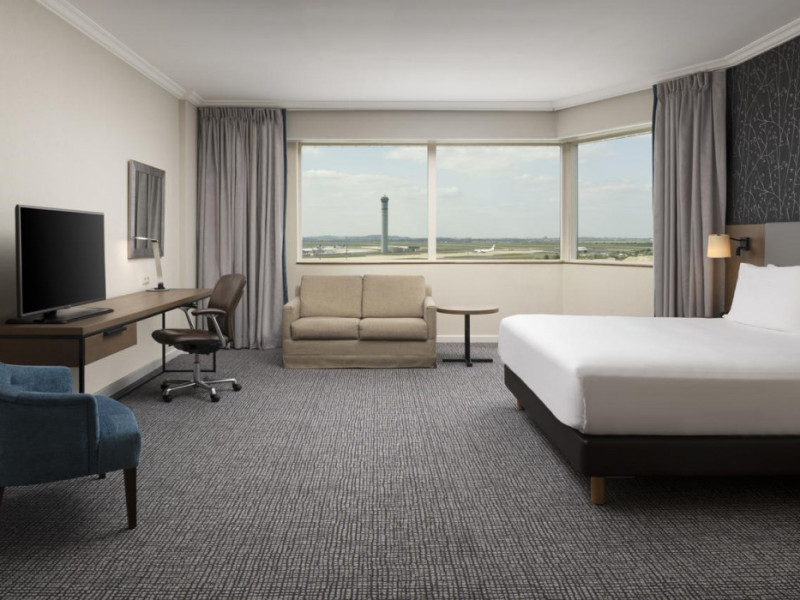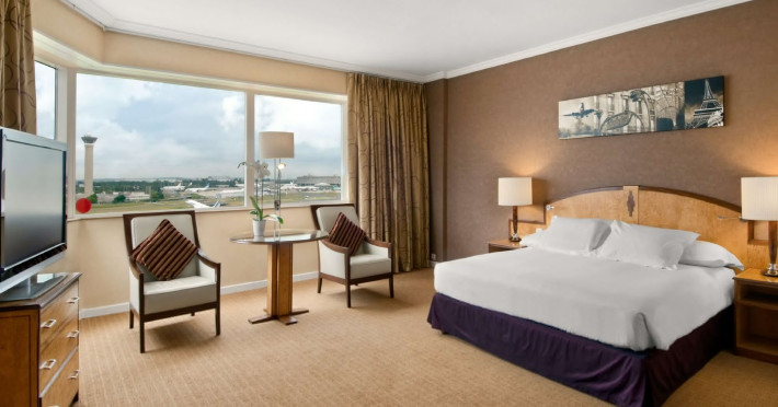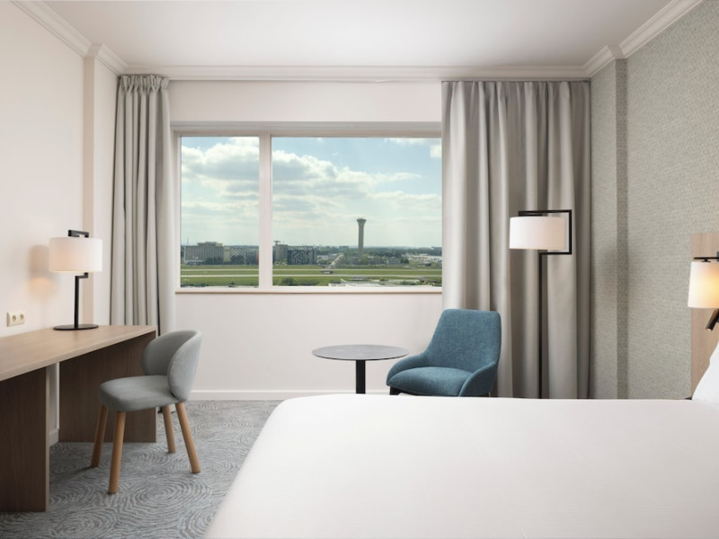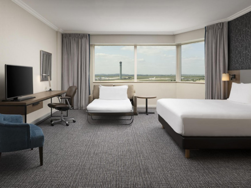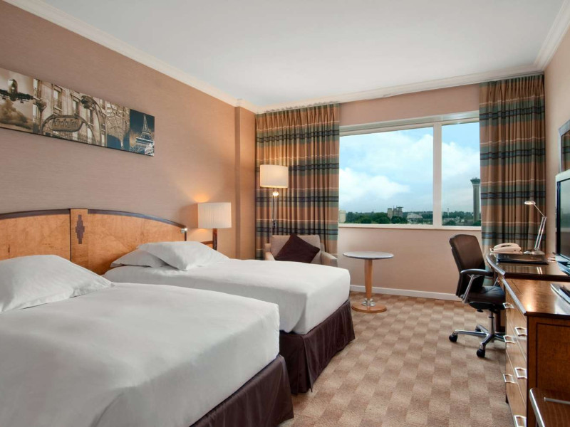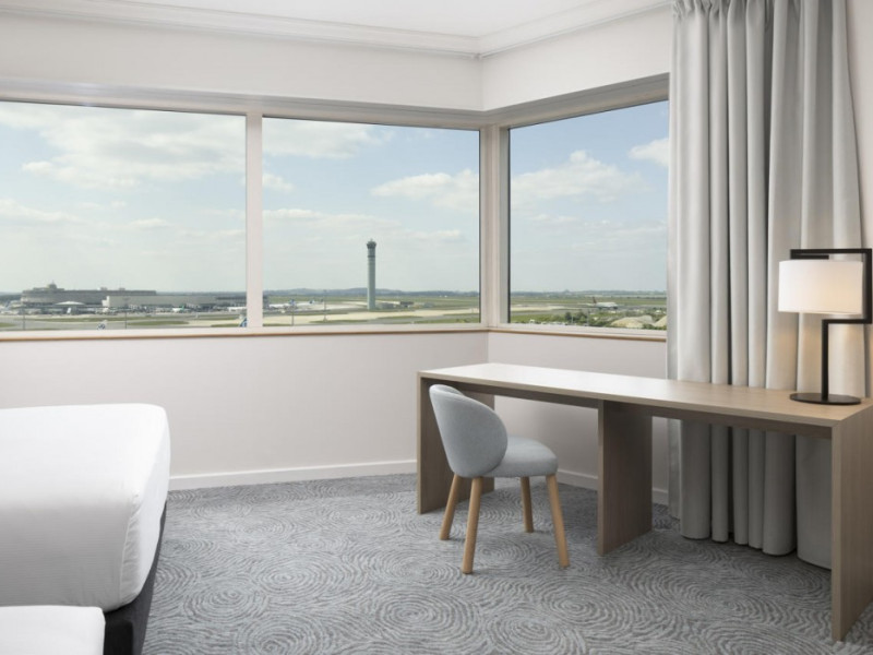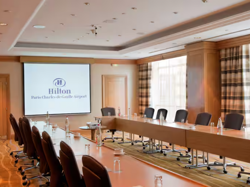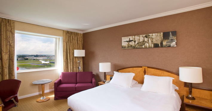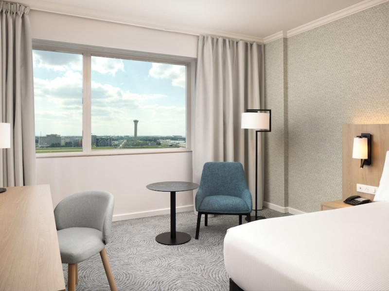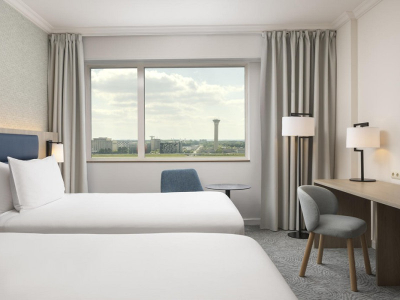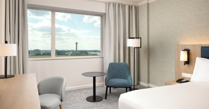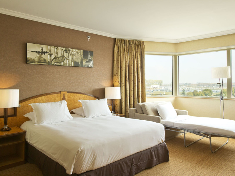 Hilton Paris Charles De Gaulle Airport, located in Tremblay-en-France, offers 392 stylish rooms (minimum 30 sq m), each featuring air-conditioning, a refrigerator, a workstation with large desk, fast WiFi (standard WiFi free, premium WiFi €10/day extra), satellite programming, a marble bathroom with separate bathtub and shower, a laptop-compatible safe, and an electric kettle. Executive Plus rooms (45 sq m) accommodate up to 3 people and include access to the Executive Lounge with complimentary continental breakfast and drinks. A complimentary breakfast buffet is served daily (6:00 AM - 10:30 AM), with breakfast costing €29 per person/day extra. The hotel offers a family experience for children under 12, including a Kids Welcome, dedicated Kids Breakfast, Kids Menu, and kids amenities (upon request). Dining options include the Skylight Bar & Restaurant, serving French cuisine and international snacks, open for breakfast, lunch, and dinner, and 24-hour room service. The hotel features 24 meeting rooms, a 700 sq m Concorde Ballroom (seating 650, reception 800), a 24-hour fitness center, a business center, concierge services, self-parking (fee applies), and a vending machine. Free CDGVAL train service connects to the three main airport terminals (3-minute walk from hotel, operates 4:00 AM - 1:00 AM, 7 days a week). Nearby attractions include Villepinte Exhibition Centre (10-minute drive), Usines Centre Outlet Shopping Mall (10-minute drive), O'Parinor (12 km), and Le Bourget Exhibition Center (13.2 km). Paris Charles de Gaulle Airport (CDG) is 4.4 mi away, and Paris Orly Airport (ORY) is 25.9 mi away. The Hilton Paris Charles De Gaulle Airport is a Tourist hotel. The nightlife/restaurants are easily accessible by taxi or bus from the hotel.