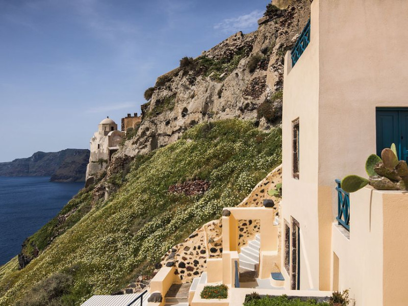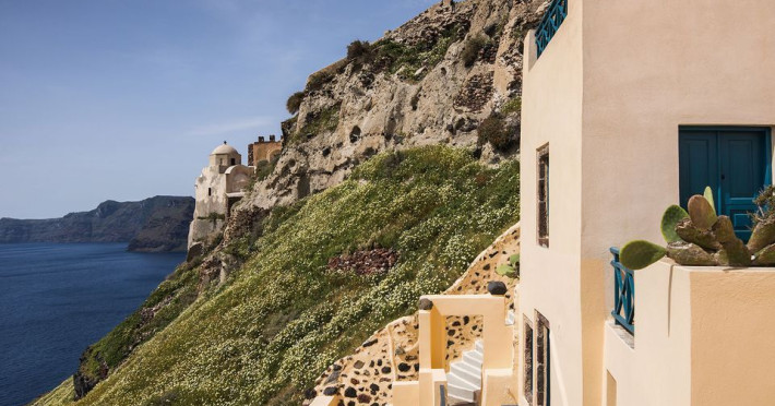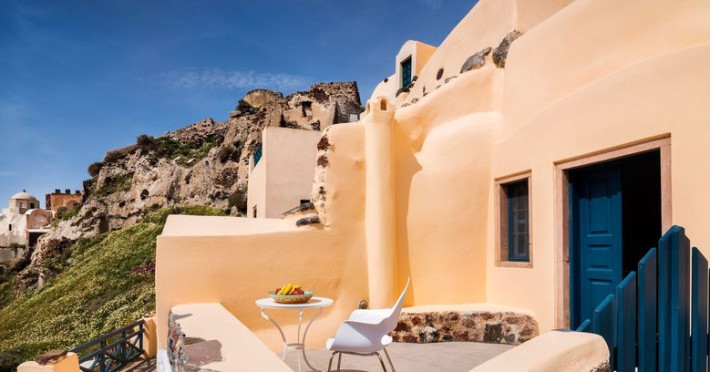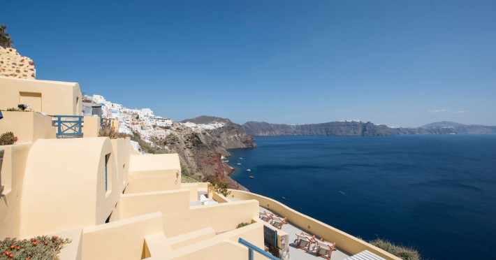 The first one is its traditional character, according to the special characteristics of the Traditional Architecture of Oia. We desire to keep all the characteristics without altering the initial form. All the renovations and improvements in the interior of the houses are made with respect to its initial structure and function. This way, are combined the experience of living in a traditional cavehouse, with all the comforts of a modern hotel. The built beds are combined with luxurious mattresses and textiles; the minimal decoration is integrated with the modern, wooden furniture, the built baths of traditional shape made with modern materials.