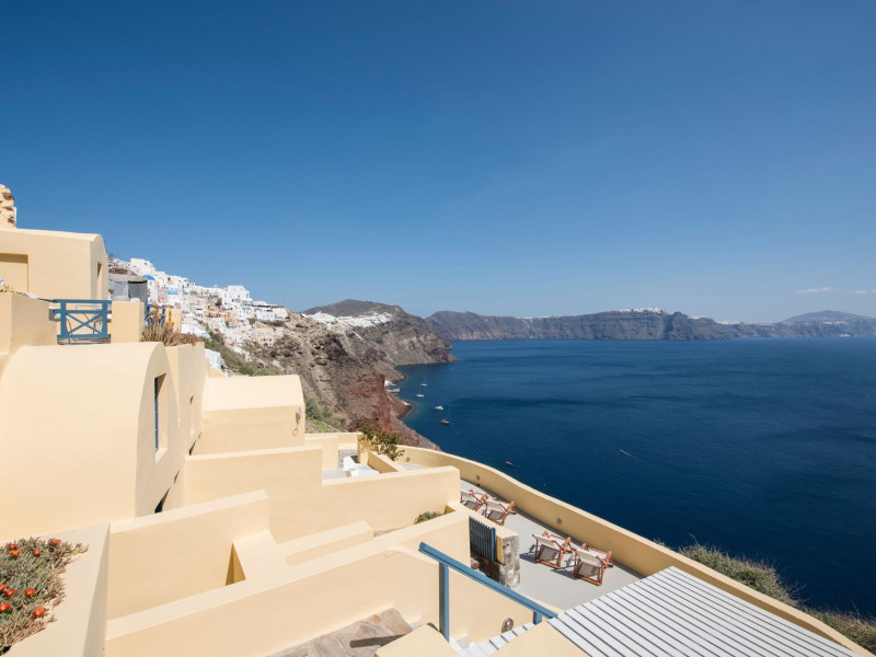 The second one is the location of our hotel. Our hotel is located next to the Castle of Oia, on the Caldera, with its entrance in the central pedestrian street of Oia. This is the area of the island where all the travelers want to visit in order to enjoy the well-known sunset. Our visitors have the privilege to enjoy the sunset from the terrace of our hotel. At the same time, our hotel offers the privacy and calmness needed to enjoy at any time the view to Caldera from your own private terrace or the communal yard.