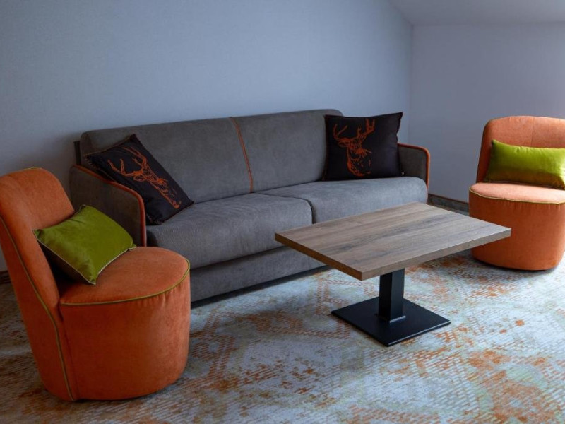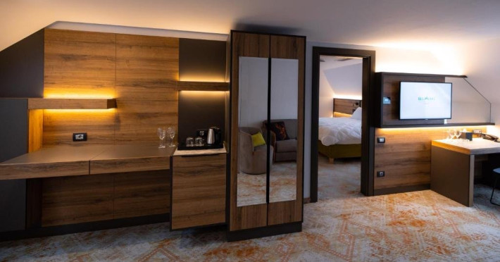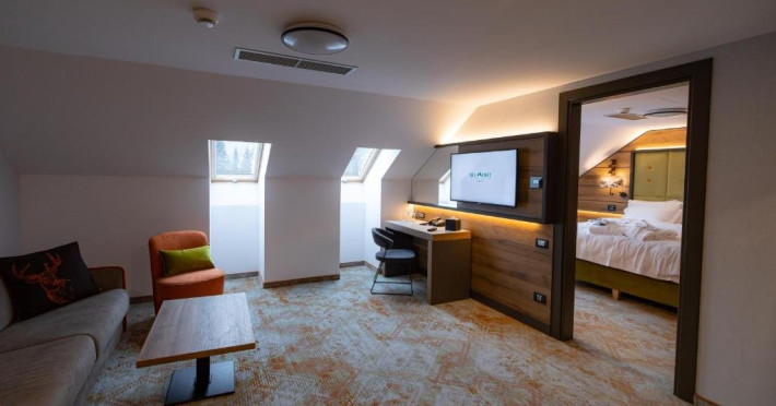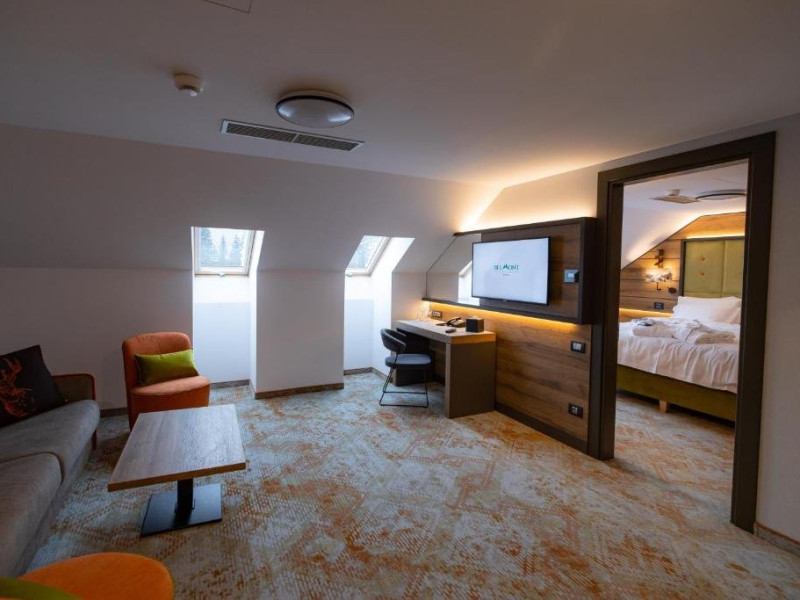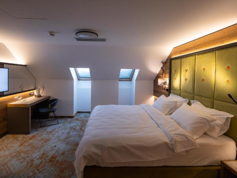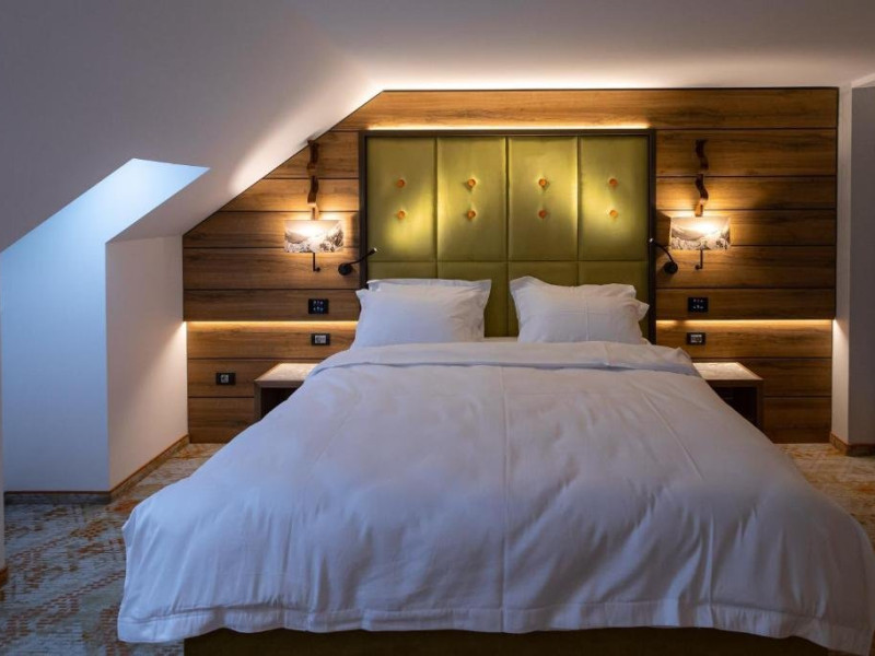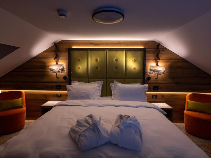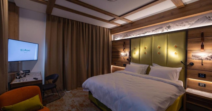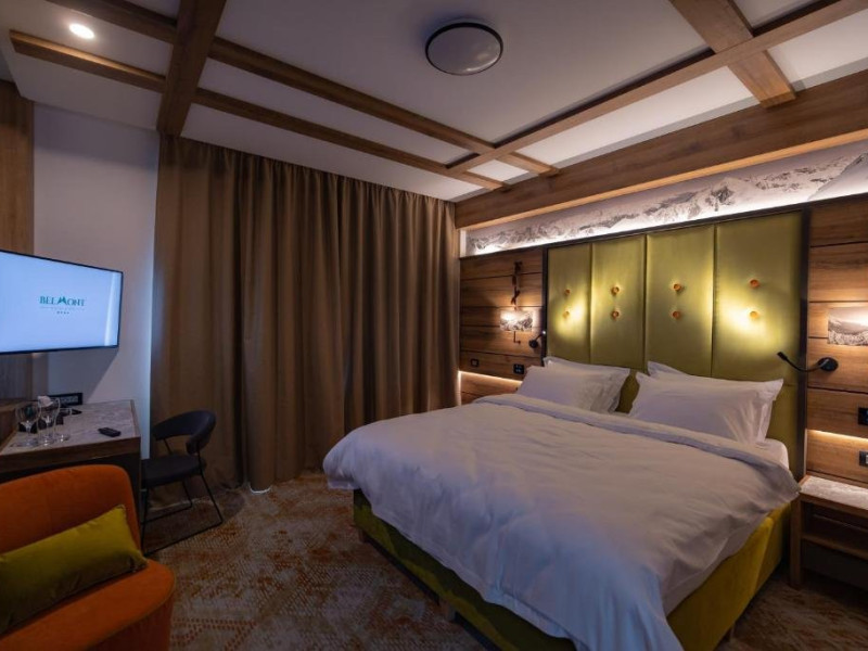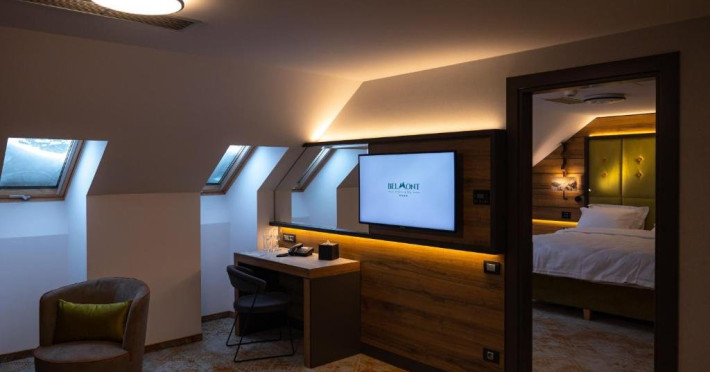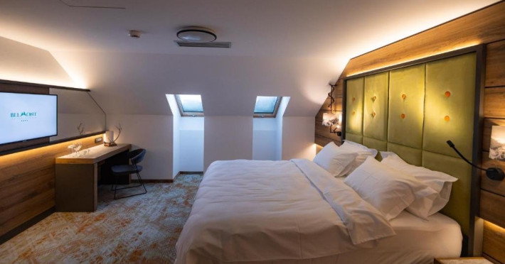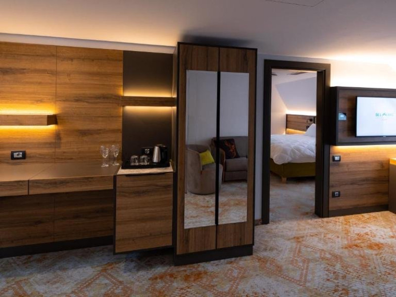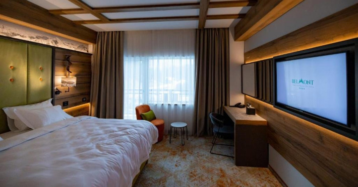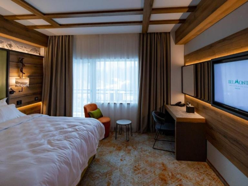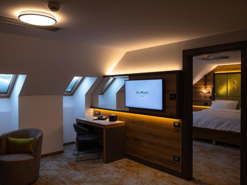 Cazare confortabila: Hotel Belmont Spa din Moroeni ofera camere familiale cu aer conditionat, bai private si dotari moderne. Fiecare camera include un birou de lucru, TV si WiFi gratuit, asigurand o sedere placuta.