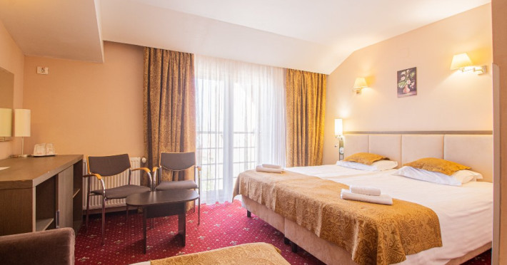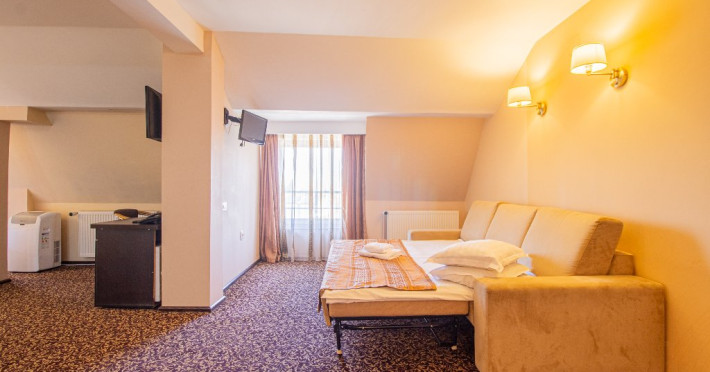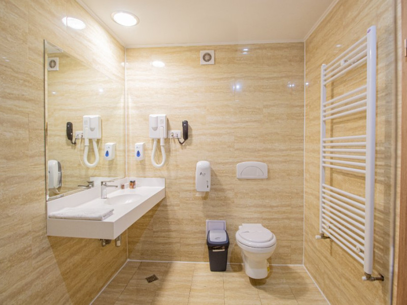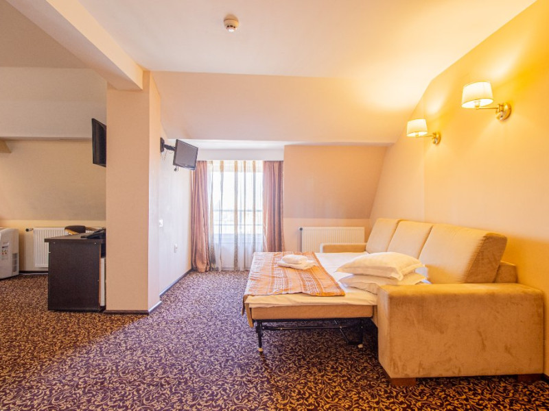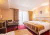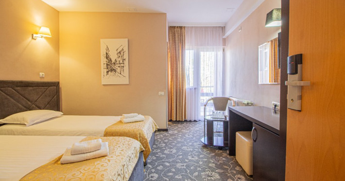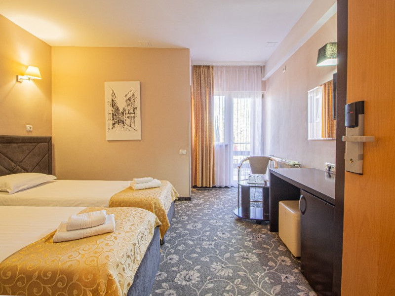 Dotarile camerelor de cazare se ridica la rangul unei unitati de 4 stele, avand sistem electronic de inchidere si deschidere a usii, baie proprie cu cabina de dus, uscator de par, minibar, cablu TV, internet gratuit, seif, balcon si lift.