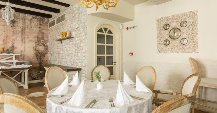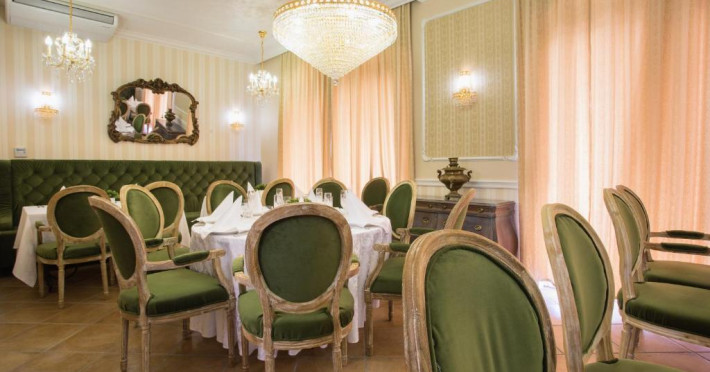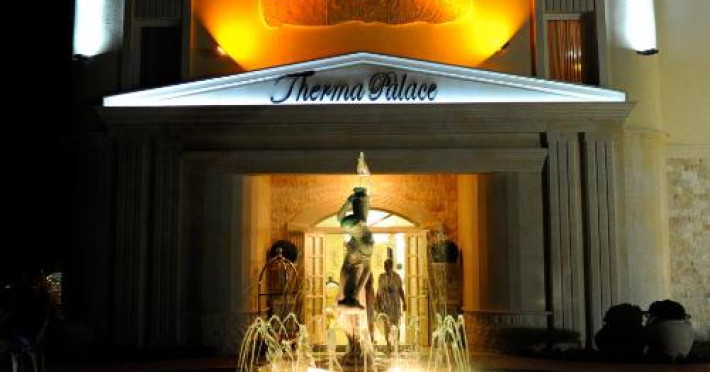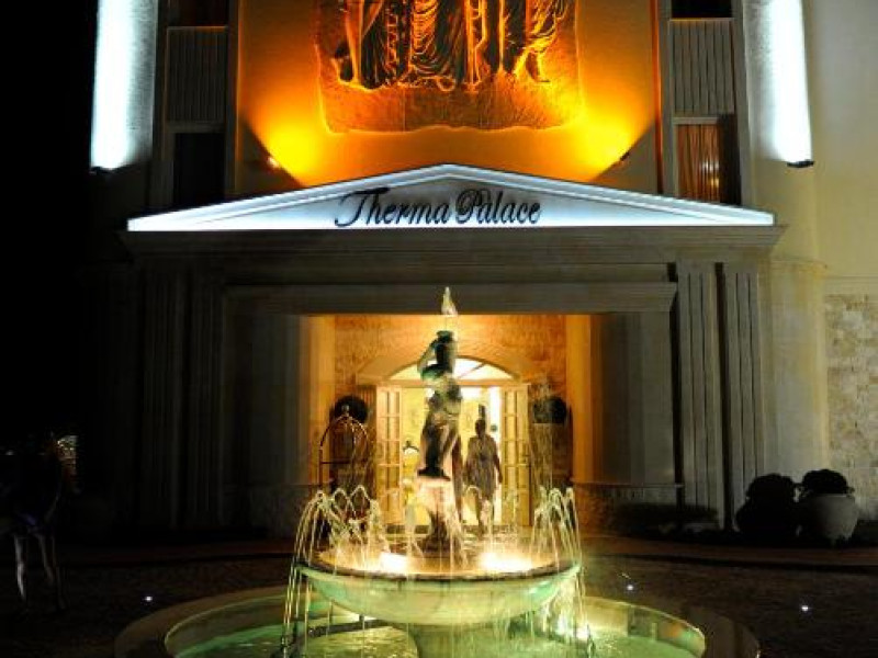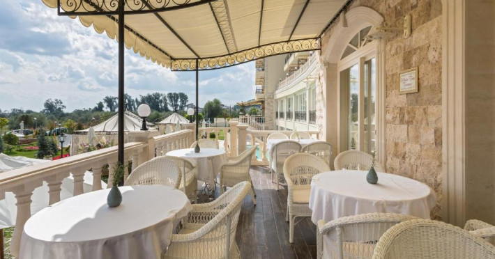Therma Palace - Privat Beach & Free Parking include un restaurant cu meniu à la carte și 2 săli, una in stil italian, iar alta in stil rusesc, precum și un bar in hol. Există și o grădină de vară unde oaspeții pot savura băuturi.