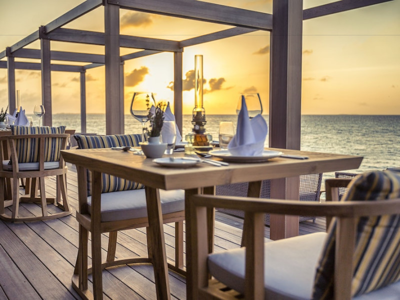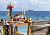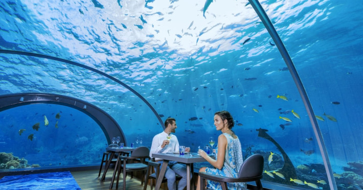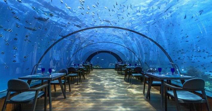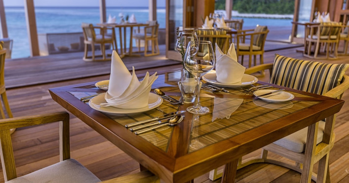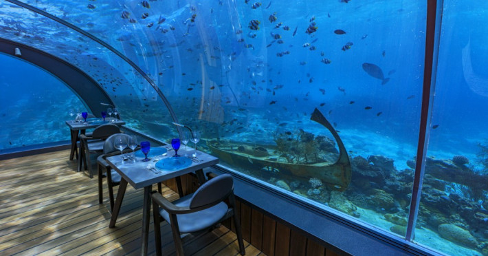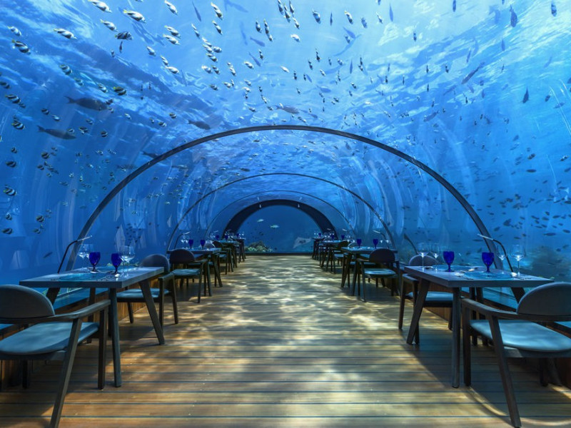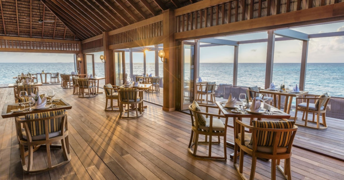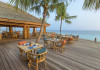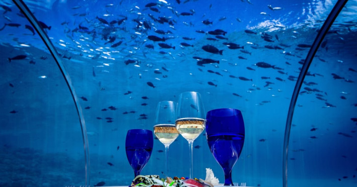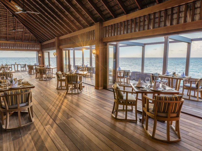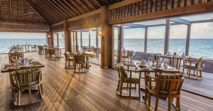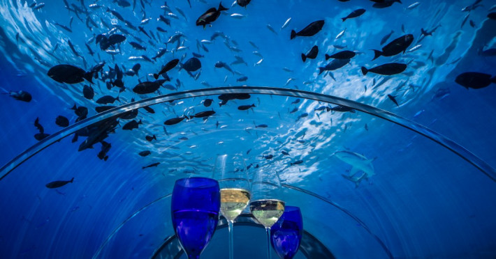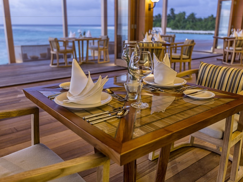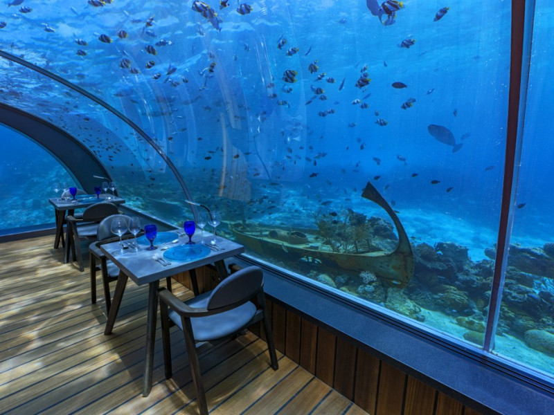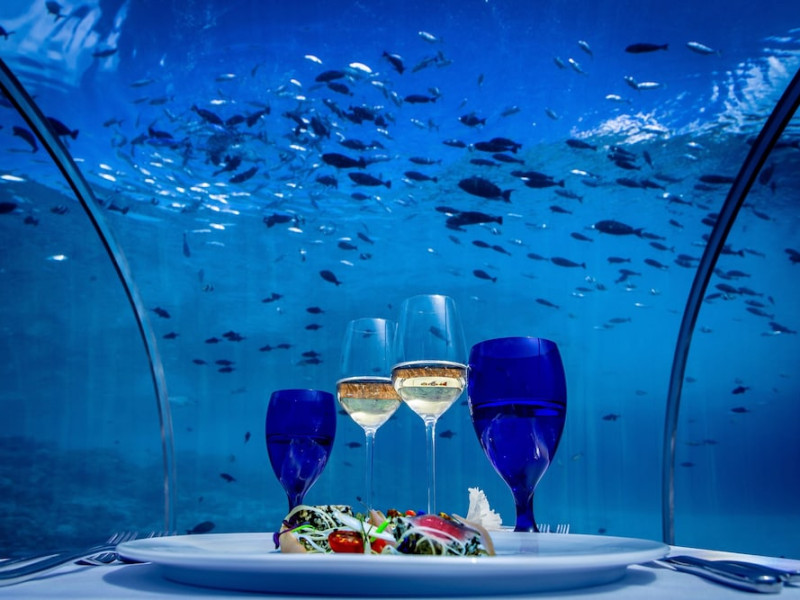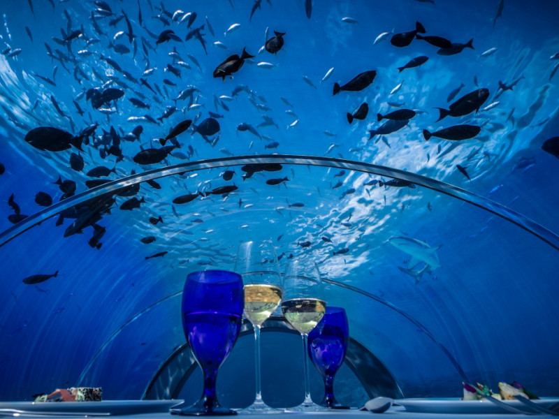 Canneli Restaurant, on the beach, serves “all you can eat” buffet style meals for breakfast, lunch and dinner, in a traditional open-air dining room with live action cooking stations. 5.8 Undersea Restaurant serves a world-class tasting menu and offers a selection of fine wines from our cellar. Guests walk down a spiral staircase, are seated at 1 of 12 tables located 5.8 meters (18 feet) beneath the lagoon and watch an exciting show of marine life swimming about the surrounding coral reef. Aquarium Restaurant, over-the-water, serves an international menu specialising in fresh seafood, prime beef and a variety of Asian cuisines including the flamboyant Teppanyaki show cooking, as well as a selection of fine wine. Dining options are the Snack Menu at the Bars and Pool, In-Villa Dining and Candlelight Dinners on the beach
