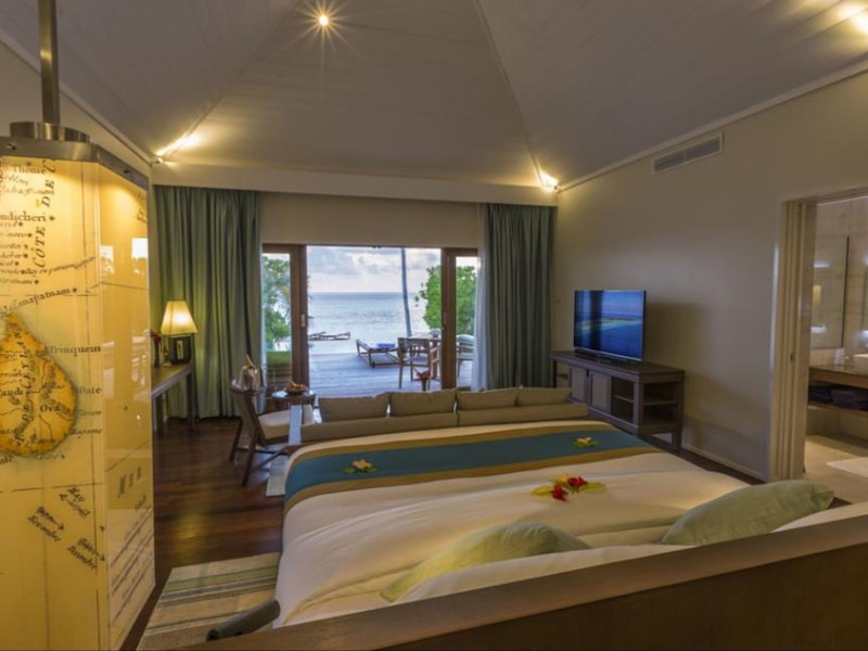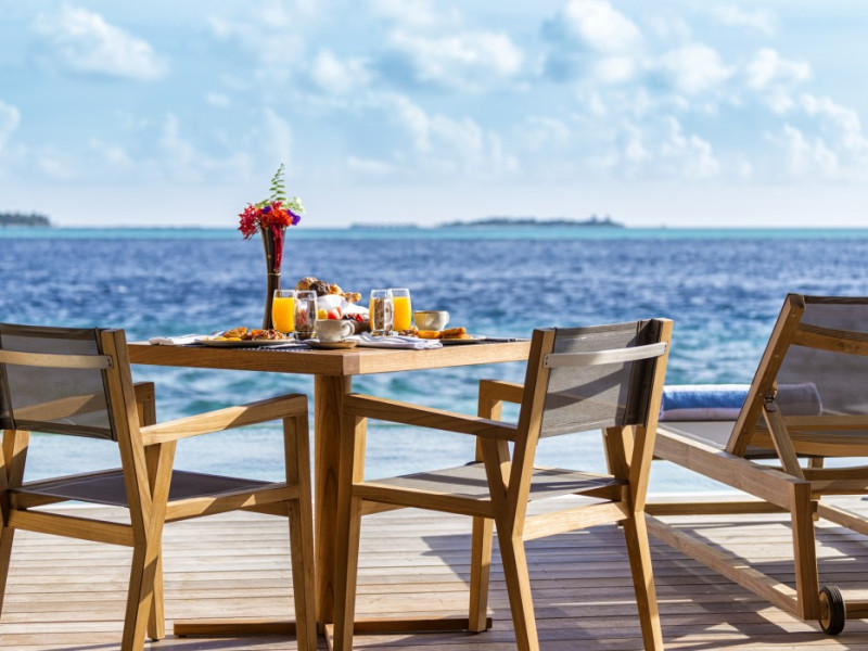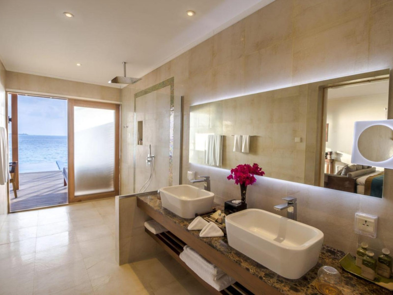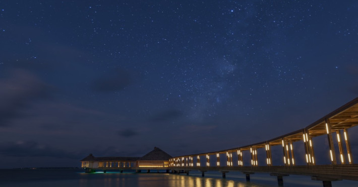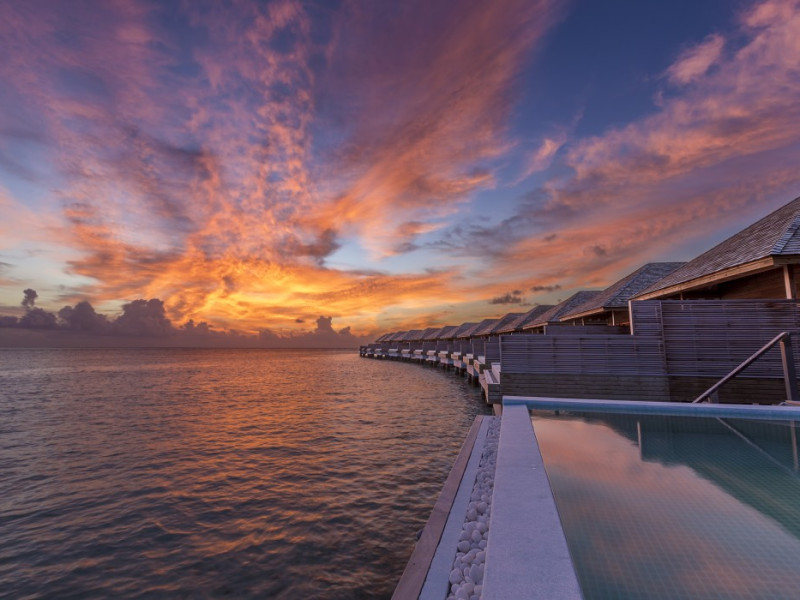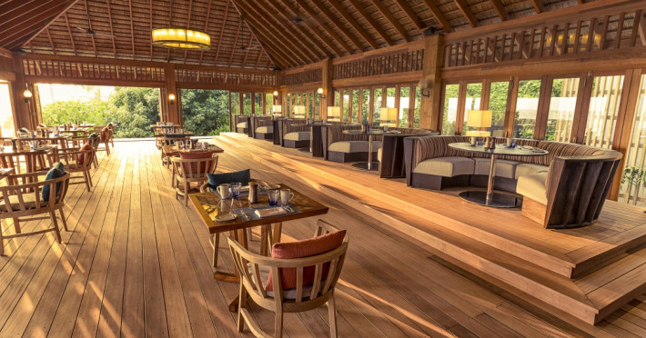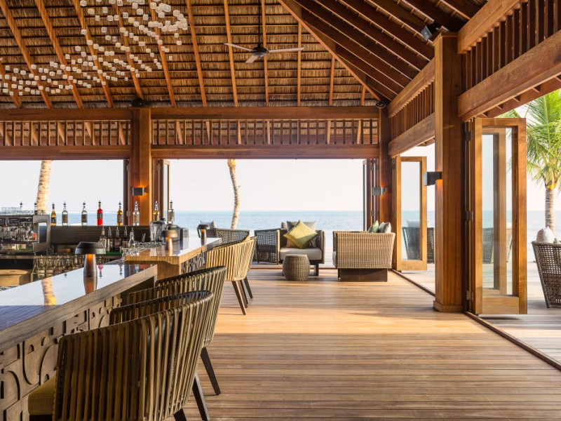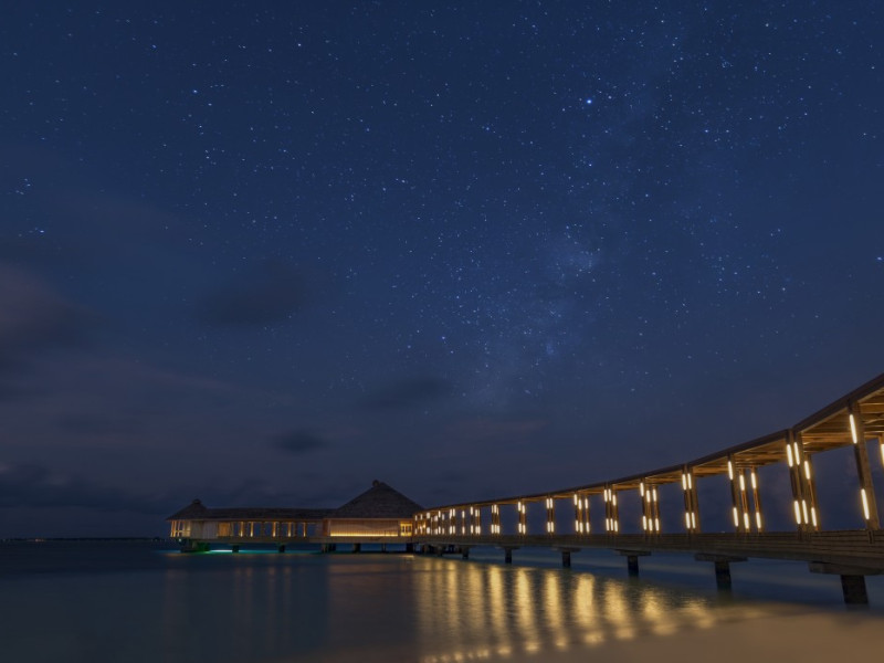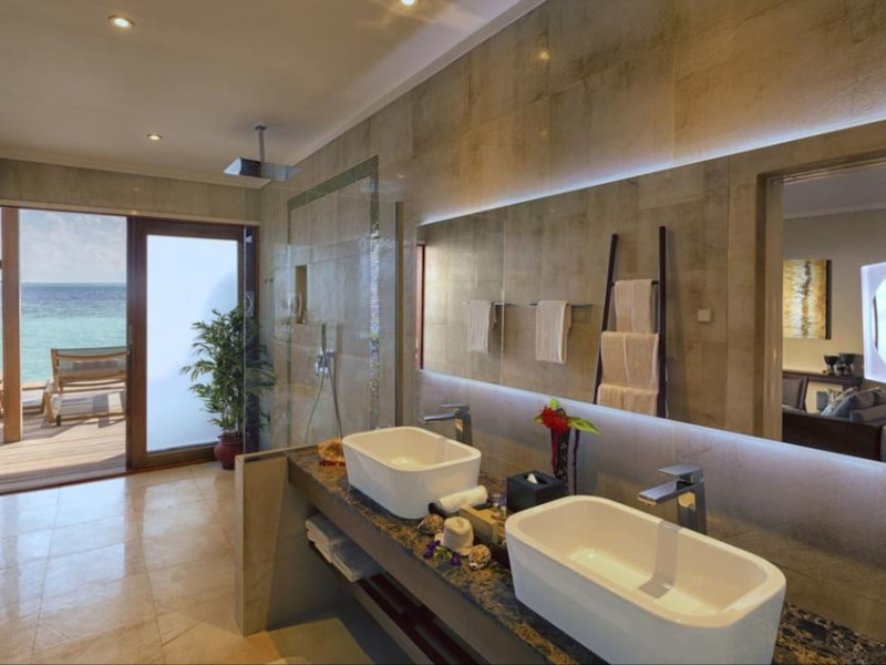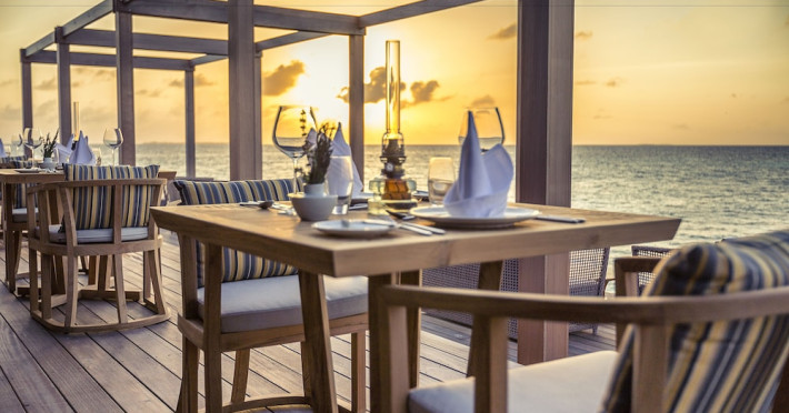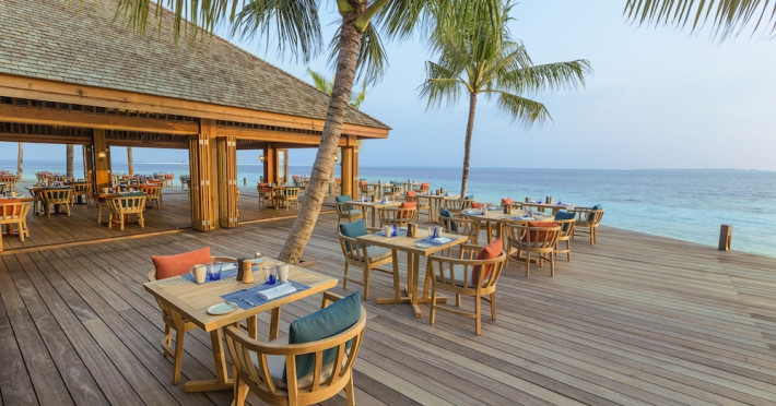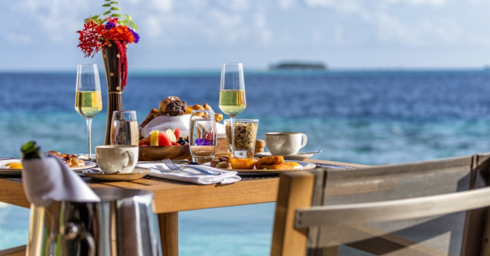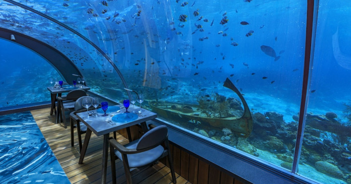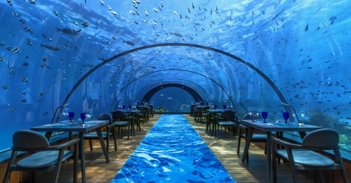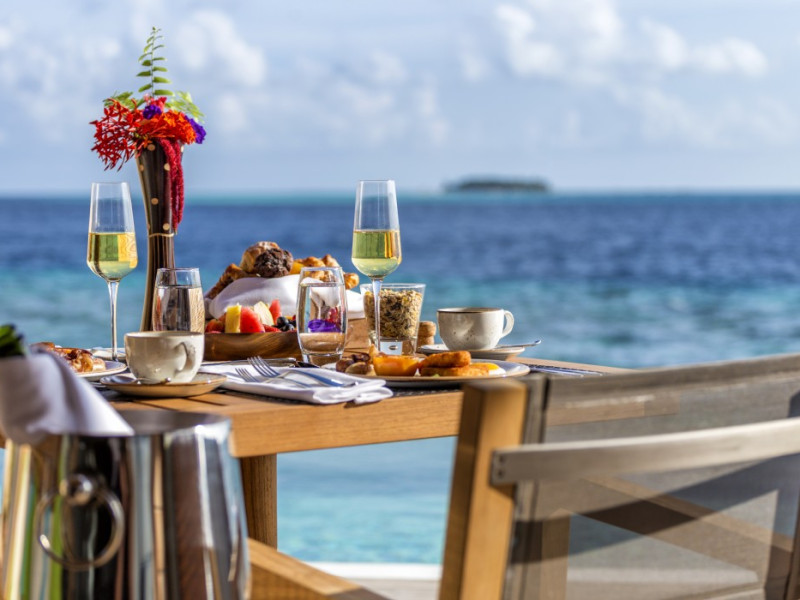 Canneli Restaurant, on the beach, serves “all you can eat” buffet style meals for breakfast, lunch and dinner, in a traditional open-air dining room with live action cooking stations. 5.8 Undersea Restaurant serves a world-class tasting menu and offers a selection of fine wines from our cellar. Guests walk down a spiral staircase, are seated at 1 of 12 tables located 5.8 meters (18 feet) beneath the lagoon and watch an exciting show of marine life swimming about the surrounding coral reef. Aquarium Restaurant, over-the-water, serves an international menu specialising in fresh seafood, prime beef and a variety of Asian cuisines including the flamboyant Teppanyaki show cooking, as well as a selection of fine wine. Dining options are the Snack Menu at the Bars and Pool, In-Villa Dining and Candlelight Dinners on the beach