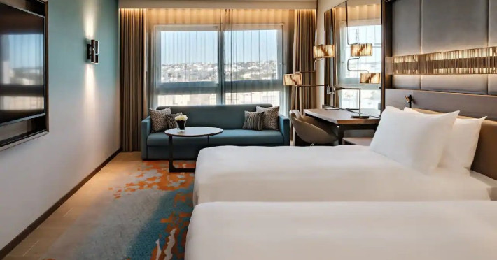 Camere si suite moderne Hotelul dispune de camere spatioase, elegant decorate, echipate cu facilitati premium, inclusiv televizoare smart, minibar si balcoane cu vedere panoramica.