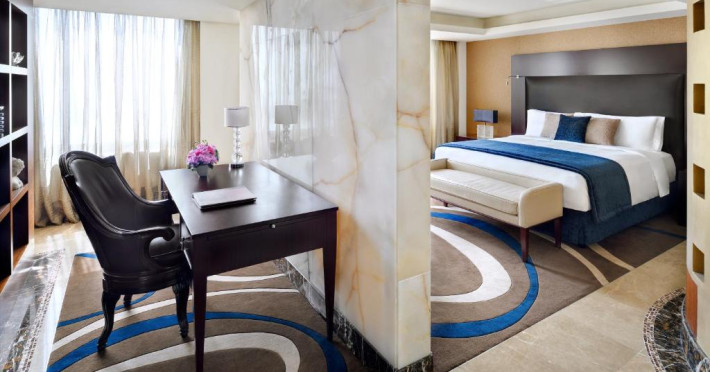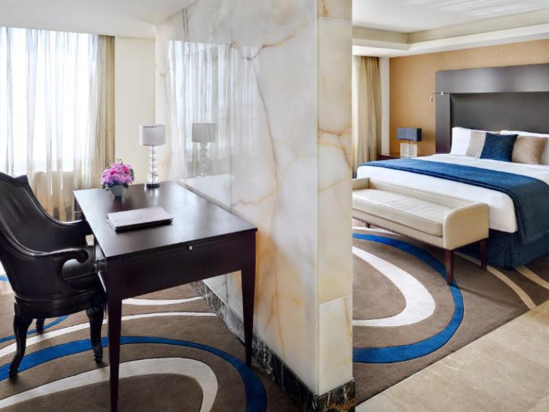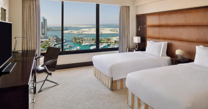Camerele de la InterContinental Abu Dhabi au interior modern, mobilier de lux și baie de lux amenajată cu marmură. Toate camerele oferă vedere la oraș sau la Golful Persic.
