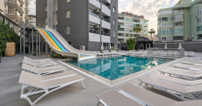 Situat in cartierul Oba, Hotelul all-inclusive Kaila Krizantem are o plajă privată cu nisip de-a lungul Mării Mediterane. Hotelul oferă, de asemenea, 3 piscine sezoniere in aer liber, o piscină pentru copii și un tobogan cu apă. Hotelul are un hamam tradițional, o saună și un centru de fitness.