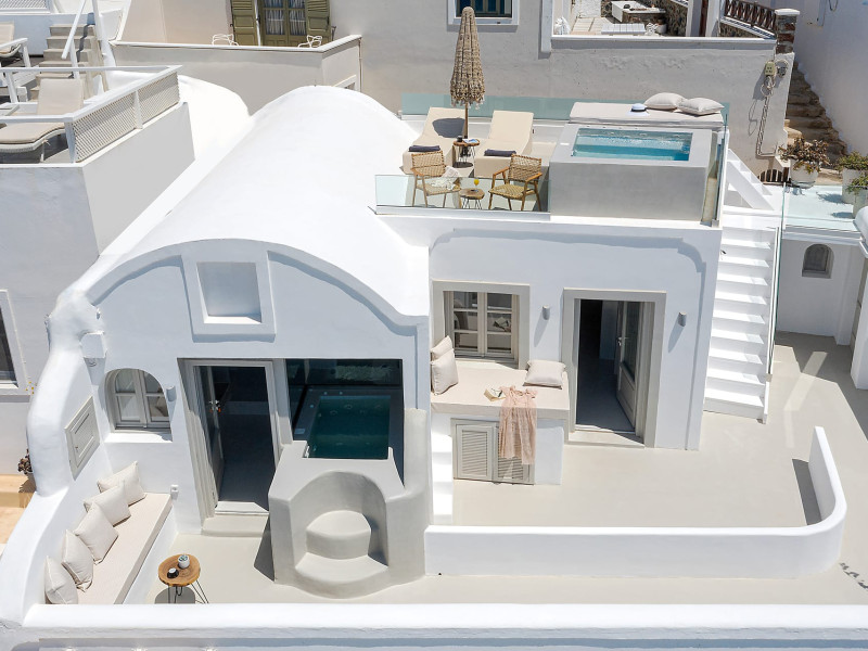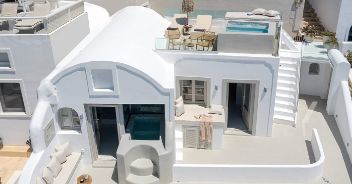 Kaleidoscope Imerovigli Suites is a new block of suites located in Imerovigli. Scenic view suite with plunge pool and Grand view Suite with outdoor jacuzzi.