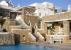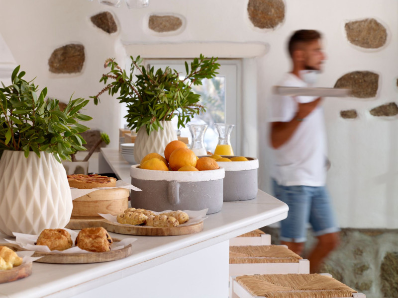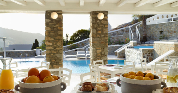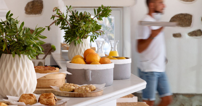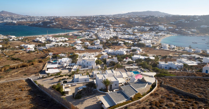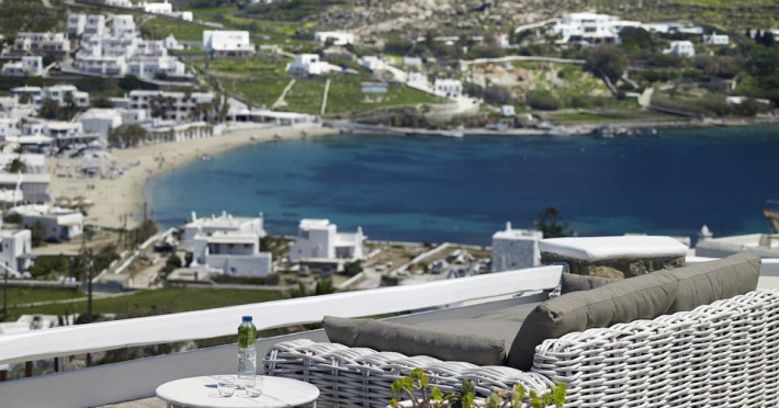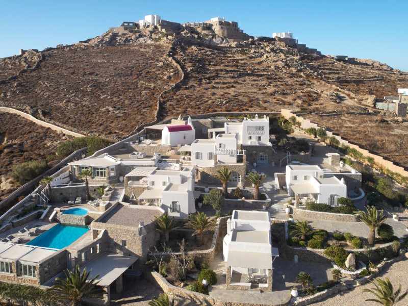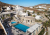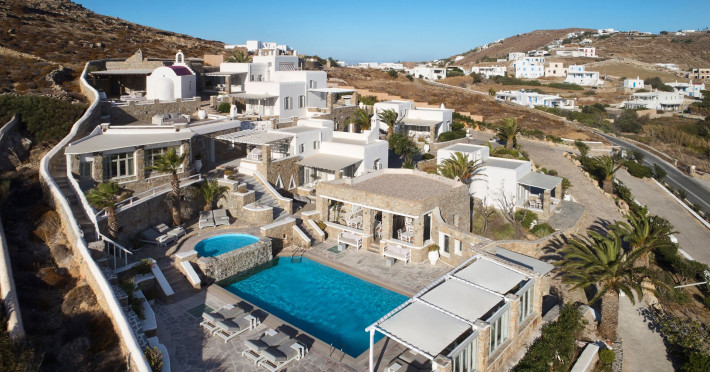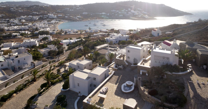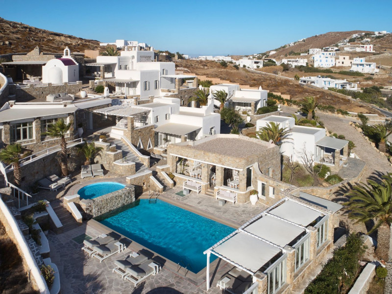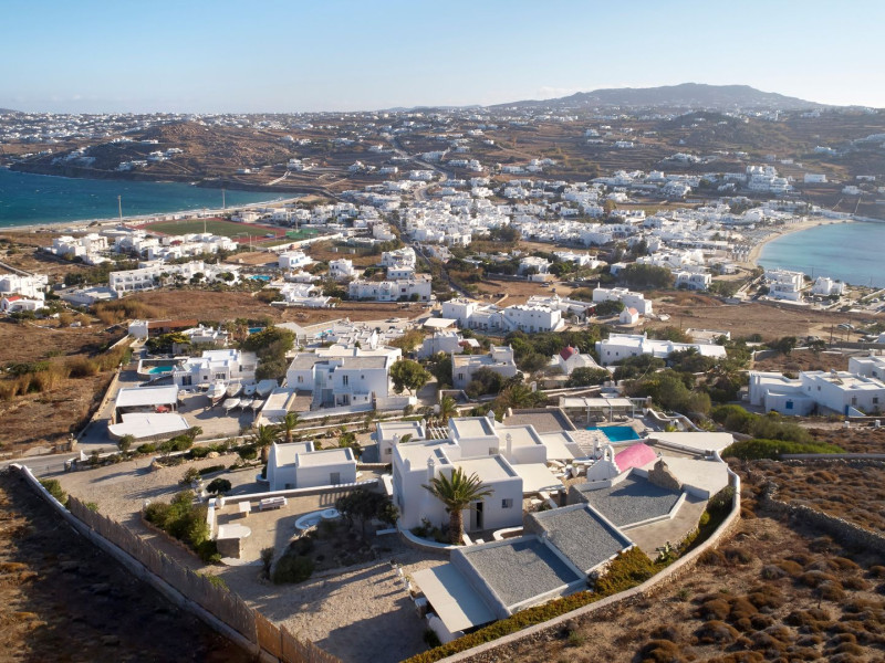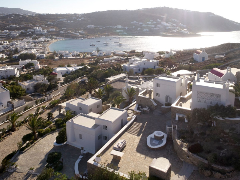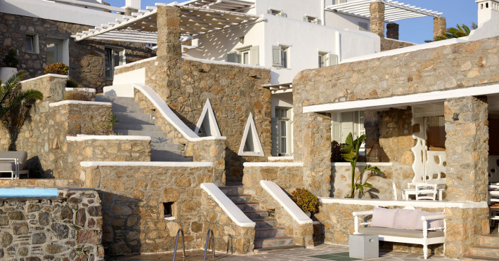 Kallos of Mykonos is a complex of houses and studios, built according to the traditional Mykonian architecture in a 5000 square meters field. It is constructed in uneven levels, so that all buildings have unobtrusive sea view to Ornos beach, Korfu beach and the town of Mykonos. All houses and studios have a private veranda, are spacious and equipped with comfortable signature beds, flat screen, cable TV, free wi-fi, kitchen and living room. The area of the pool and the hydro-massage offers its guests with comfortable sun beds and an all-day bar, with the breathtaking view of the Aegean Sea as the background, while Ornos beach is within a 10’ walking distance. Inside the complex there is a large garden area, with organic products that are cultivated with the Permaculture technique and are used for the preparation of the homemade breakfast and tasty snacks.
