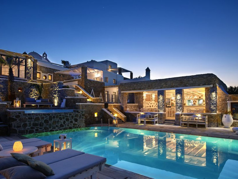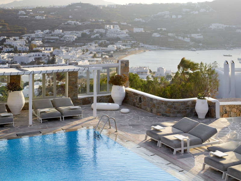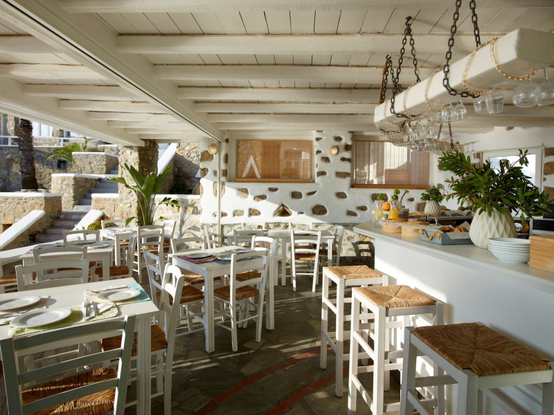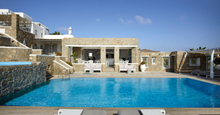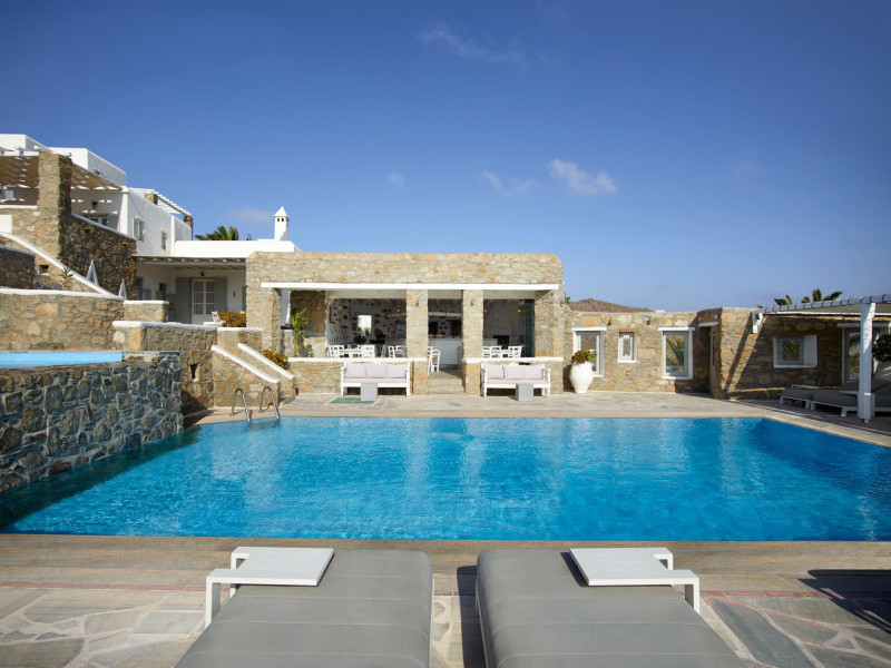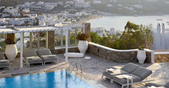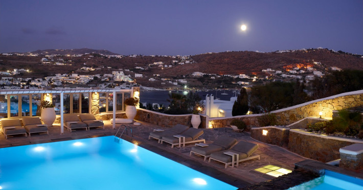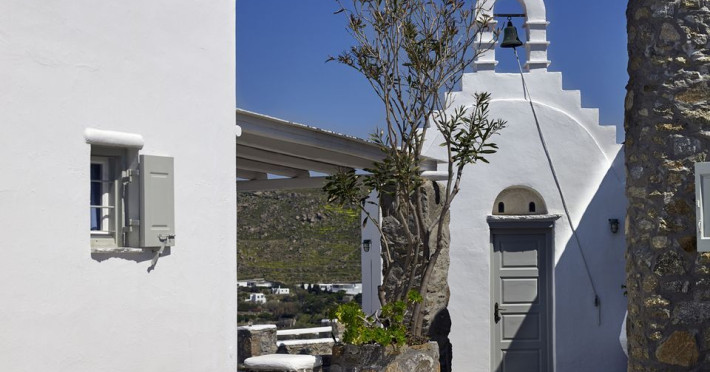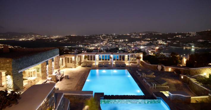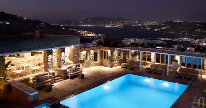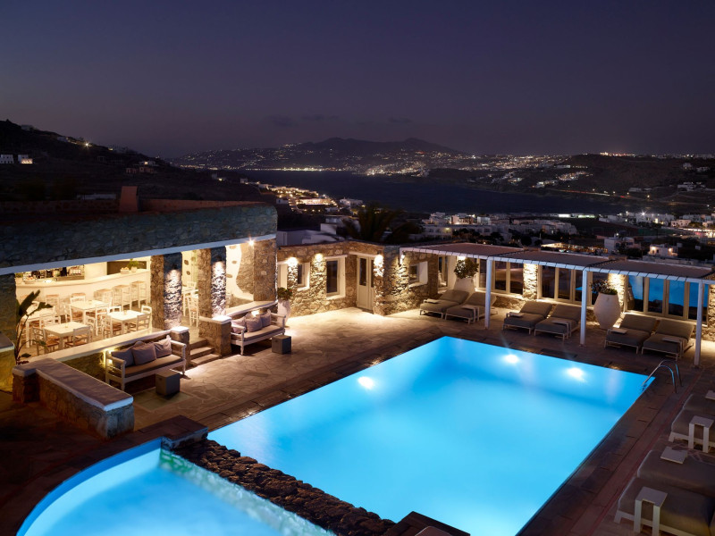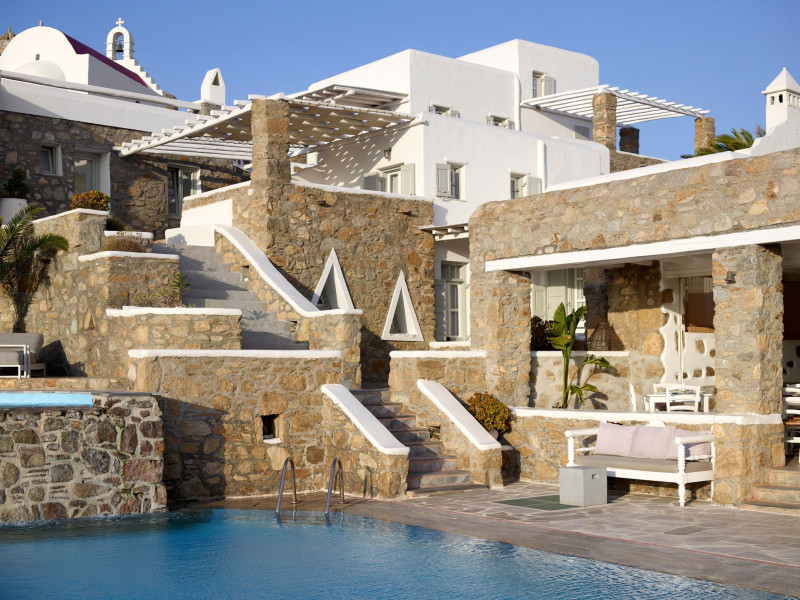 Kallos of Mykonos is a complex of houses and studios, built according to the traditional Mykonian architecture in a 5000 square meters field. It is constructed in uneven levels, so that all buildings have unobtrusive sea view to Ornos beach, Korfu beach and the town of Mykonos. All houses and studios have a private veranda, are spacious and equipped with comfortable signature beds, flat screen, cable TV, free wi-fi, kitchen and living room. The area of the pool and the hydro-massage offers its guests with comfortable sun beds and an all-day bar, with the breathtaking view of the Aegean Sea as the background, while Ornos beach is within a 10’ walking distance. Inside the complex there is a large garden area, with organic products that are cultivated with the Permaculture technique and are used for the preparation of the homemade breakfast and tasty snacks.