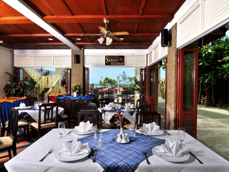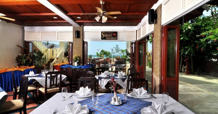 Dining options include The Sunset Restaurant, serving Asian and Western dishes with beachfront views. Guests can unwind with drinks at the bar/lounge or poolside bar. Room service is available. A buffet breakfast is available daily for a fee.