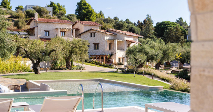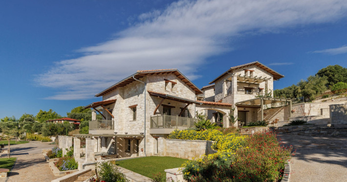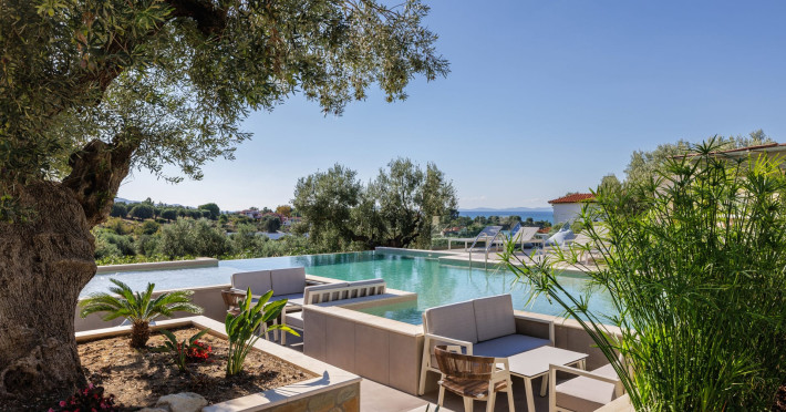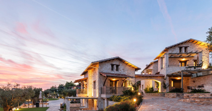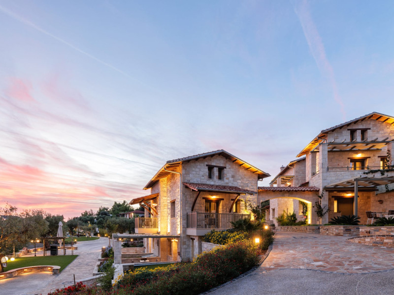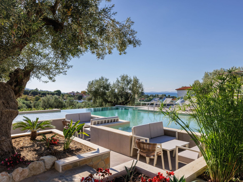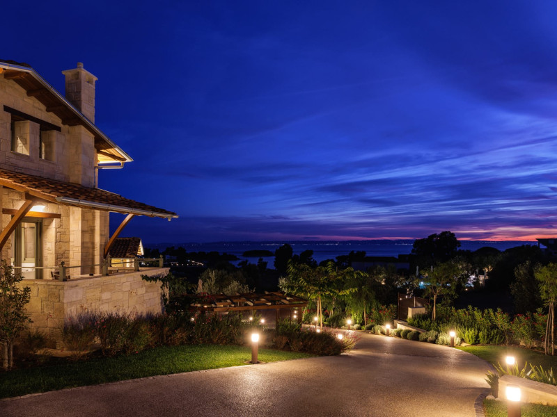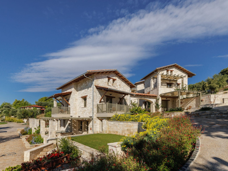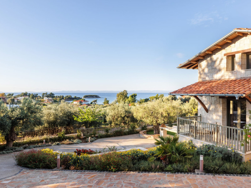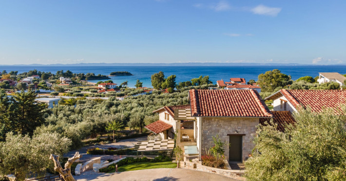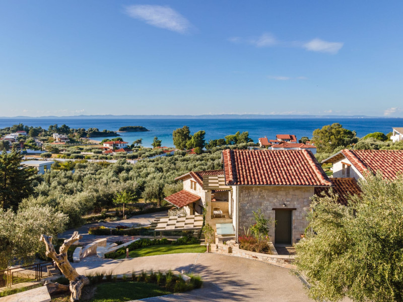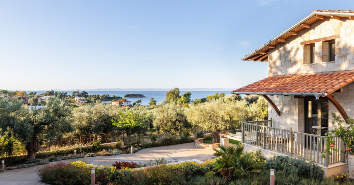 Kastri Elia is a complex of 10 sophisticated two-storey suites on the slope of a green hillside, in an area of 4 acres, next to Nikiti. Built amidst century-old olive trees and flower gardens with aromatic plants, they gaze unobstructed at the magnificent view of the deep blue Toroneos Gulf.
