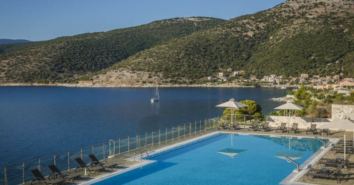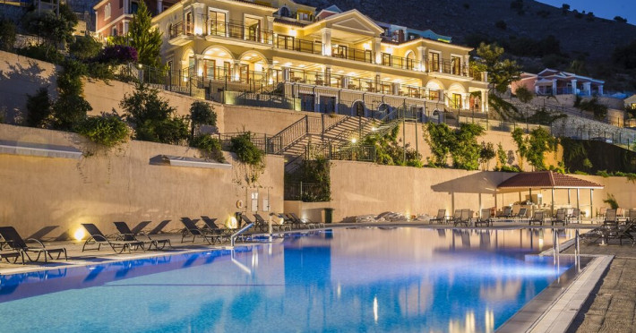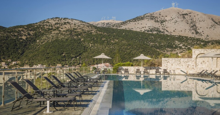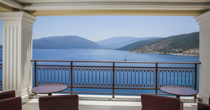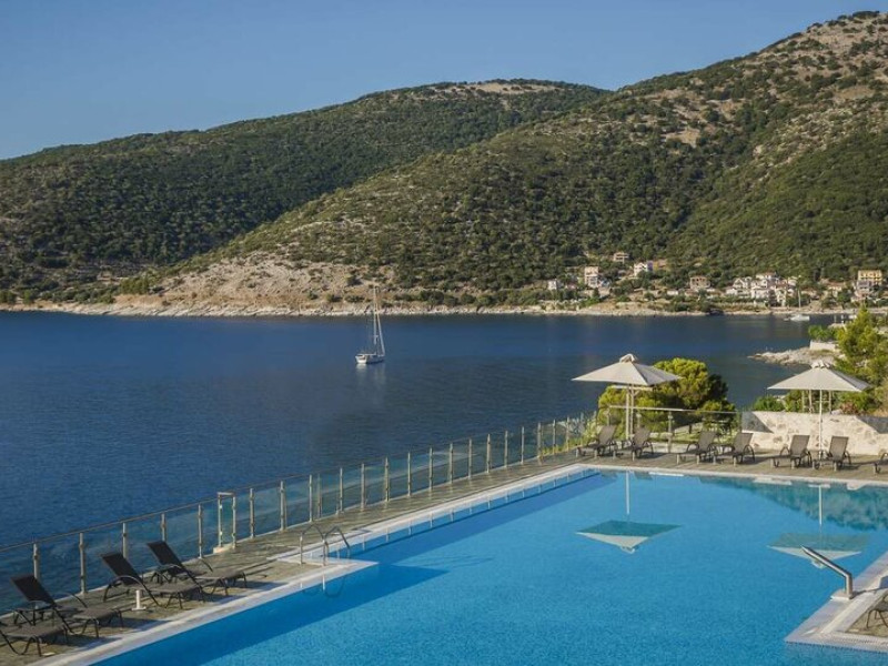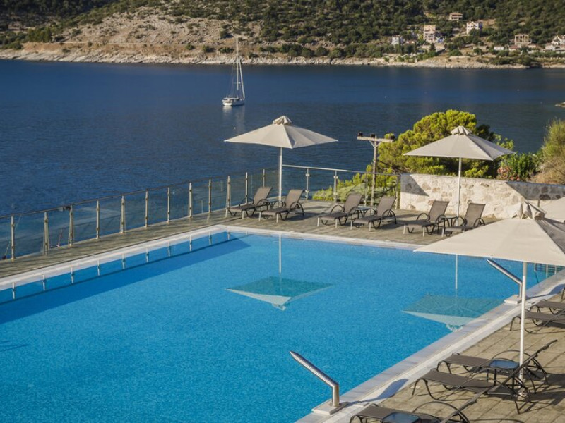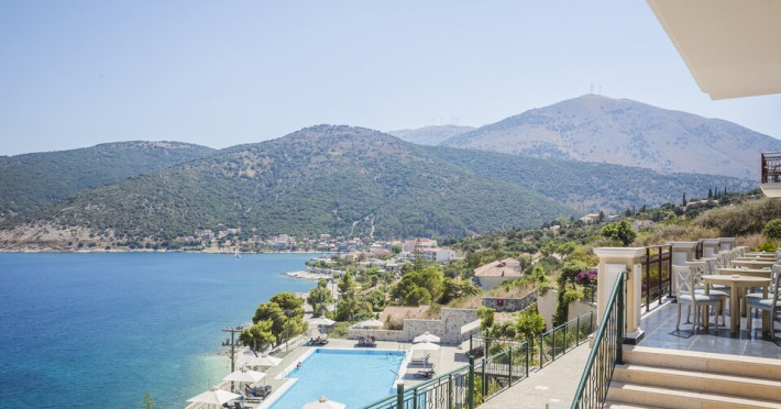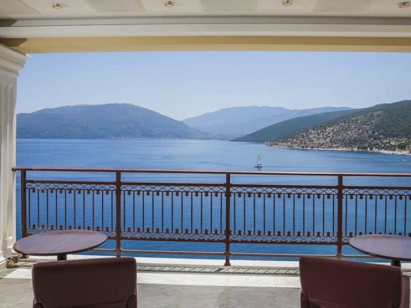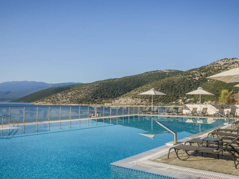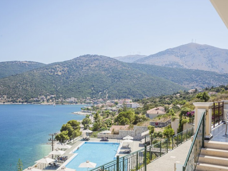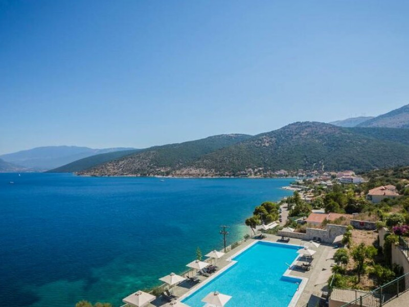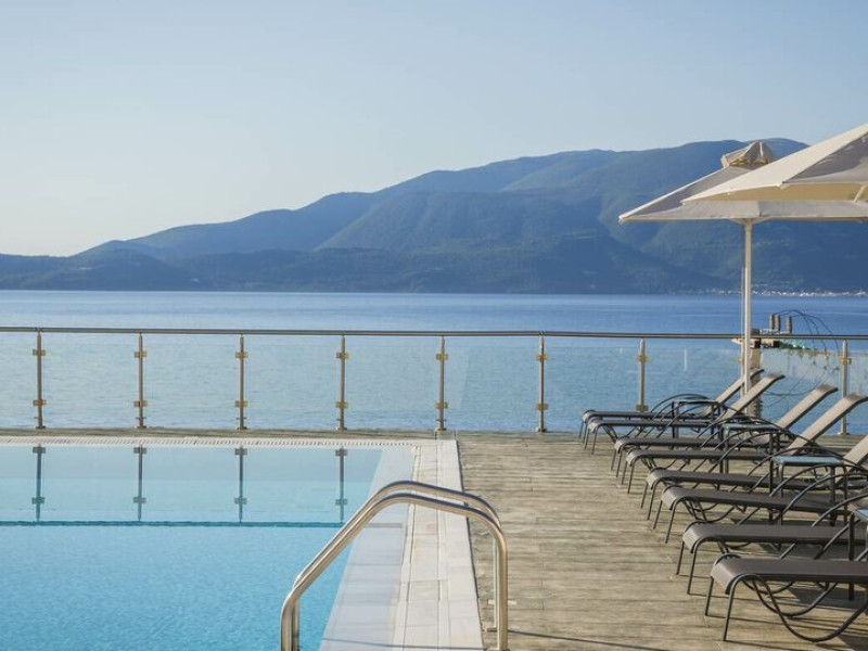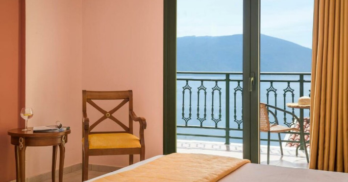 Kefalonia Bay Palace is situated near the award-winning Myrtos beach, just a short drive from Lake Melissani and Drogarati Cave. The hotel is ideal as a base for short visits to local attractions and sites. The hotel is situated in the village of Agia Efimia is a bustling resort with a marina for yachts, lively bars, restaurants and shops.The Hotel is a terrific spot to start exploring Kefalonia, one of the most beautiful Greek islands with spectacular scenery, mountains, perfumed pine forests, aquamarine waters and white beaches.The Kefalonia Bay Palace has 41 individual rooms and 6 luxury villas with private pools featuring contemporary interior design and hand-made wood furniture. Warm red, green and gold palettes work in harmony with the gorgeous natural surroundings outside and guests love the verandas opening to fantastic sea views. This amazing Kefalonia hotel provides villas with steam rooms and private pools with whirlpool.