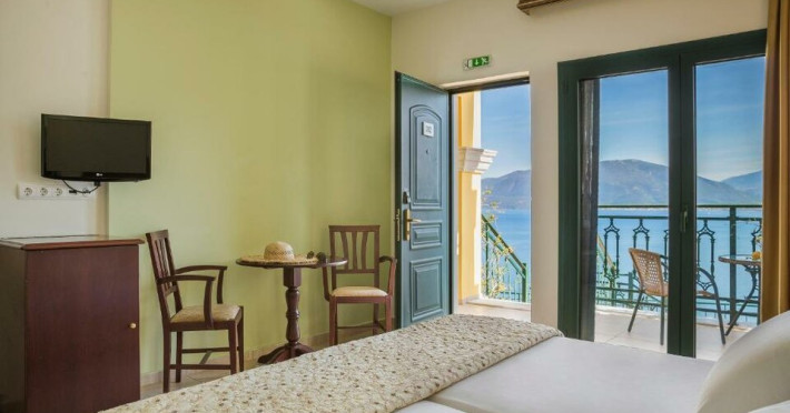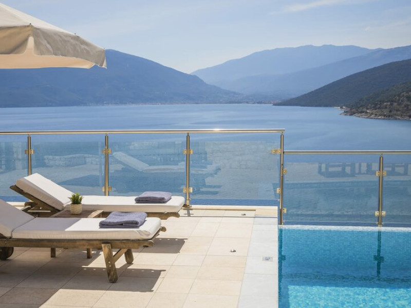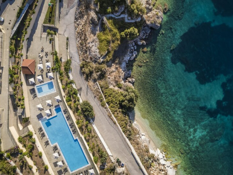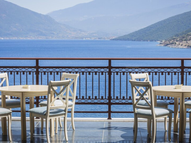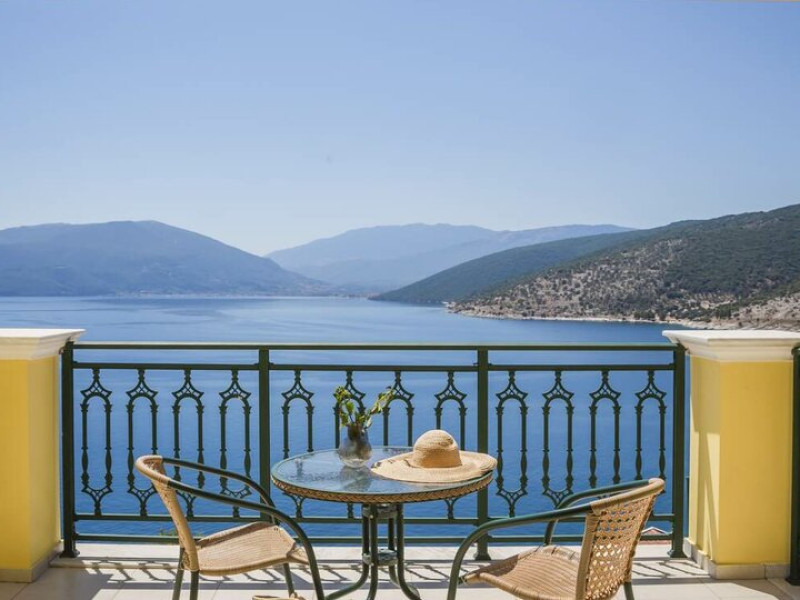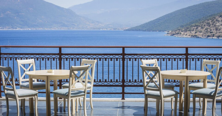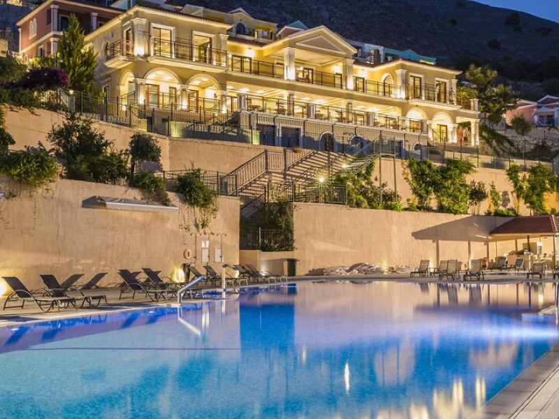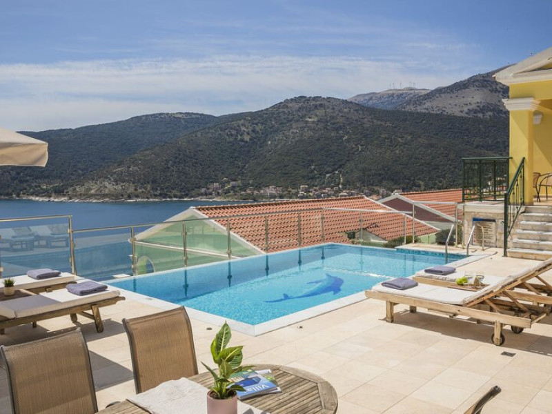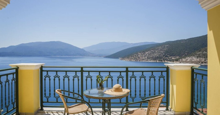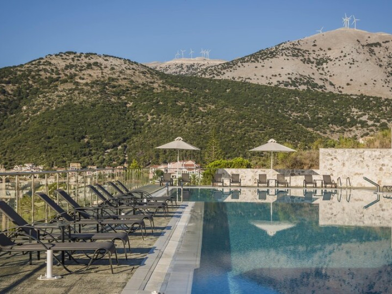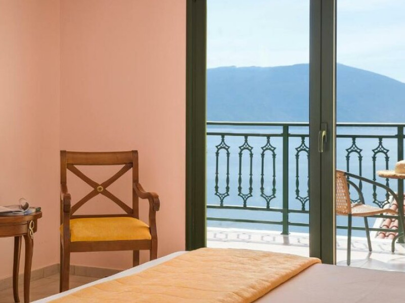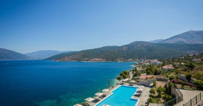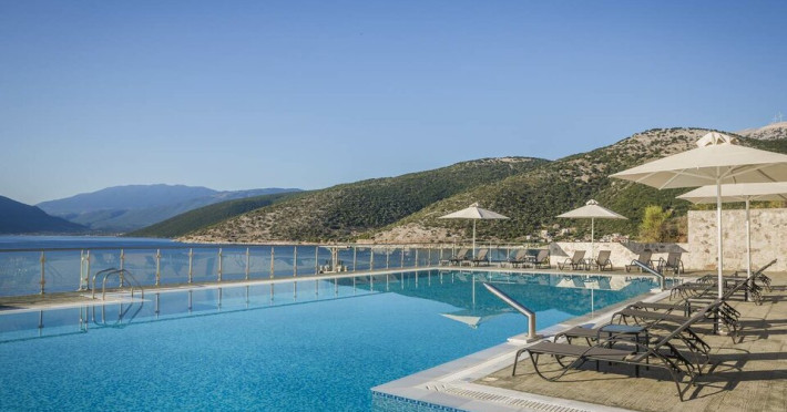 Kefalonia Bay Palace is situated near the award-winning Myrtos beach, just a short drive from Lake Melissani and Drogarati Cave. The hotel is ideal as a base for short visits to local attractions and sites. The hotel is situated in the village of Agia Efimia is a bustling resort with a marina for yachts, lively bars, restaurants and shops.The Hotel is a terrific spot to start exploring Kefalonia, one of the most beautiful Greek islands with spectacular scenery, mountains, perfumed pine forests, aquamarine waters and white beaches.The Kefalonia Bay Palace has 41 individual rooms and 6 luxury villas with private pools featuring contemporary interior design and hand-made wood furniture. Warm red, green and gold palettes work in harmony with the gorgeous natural surroundings outside and guests love the verandas opening to fantastic sea views. This amazing Kefalonia hotel provides villas with steam rooms and private pools with whirlpool.