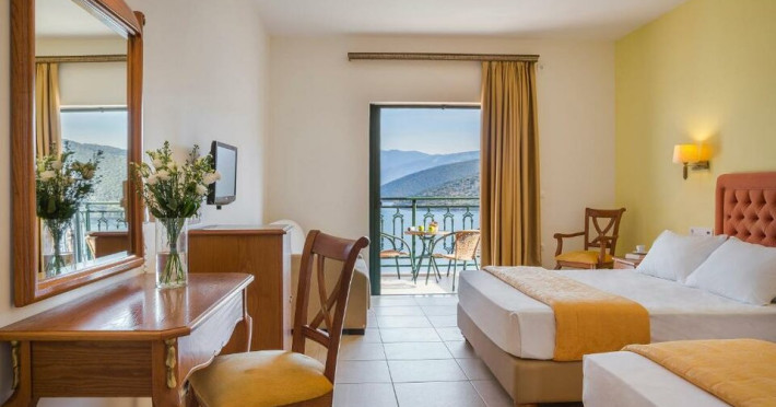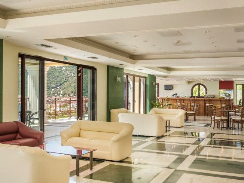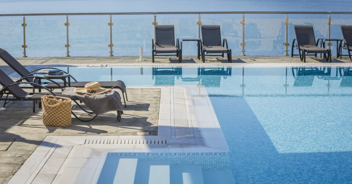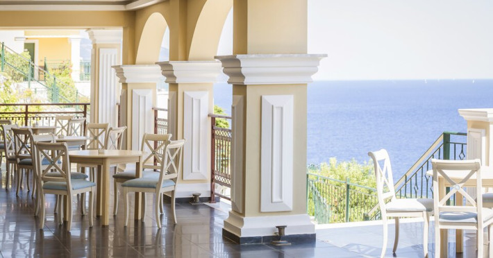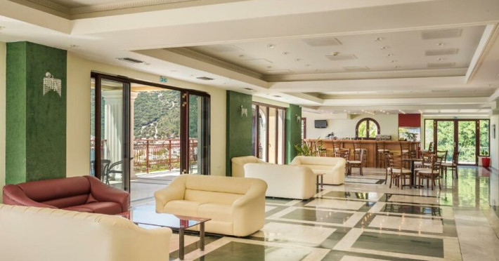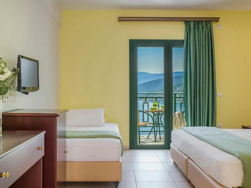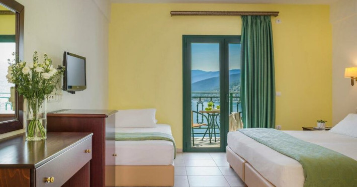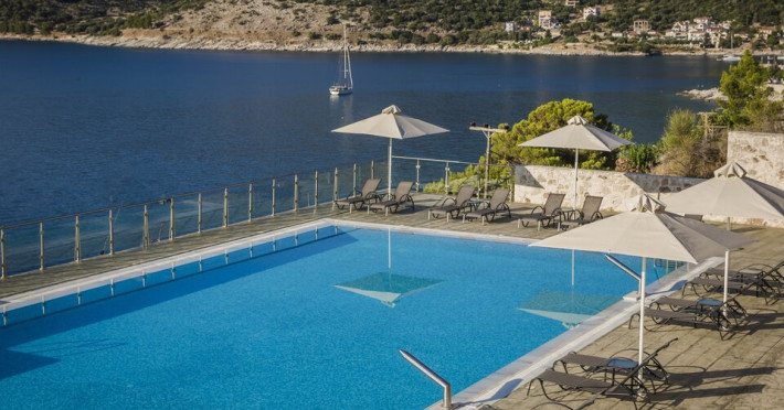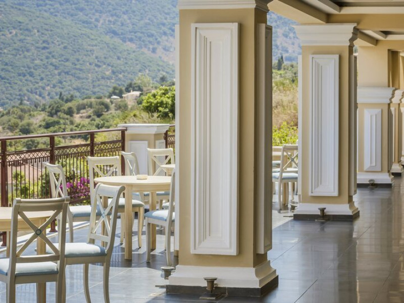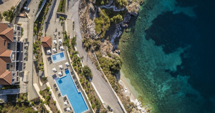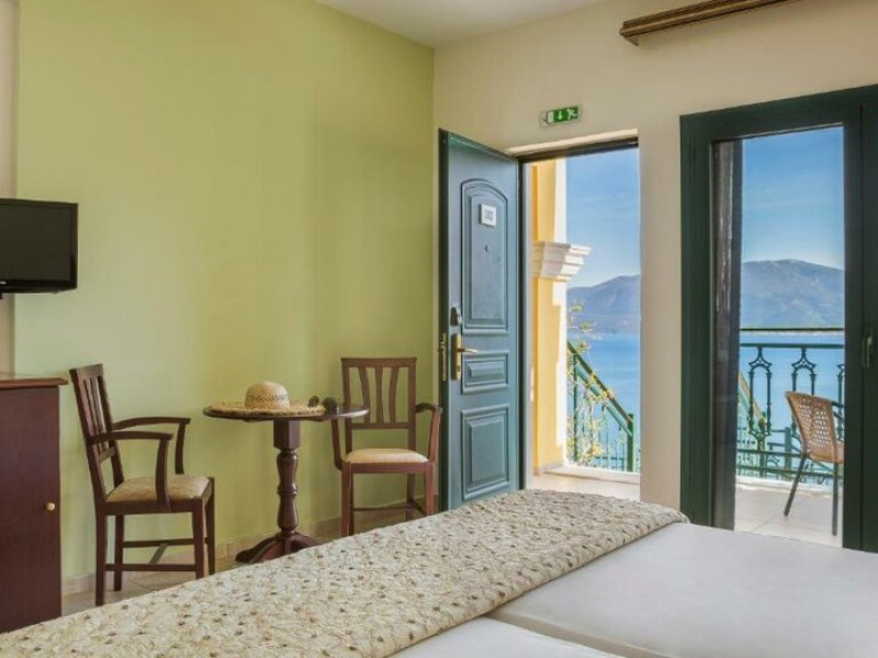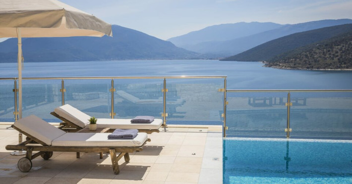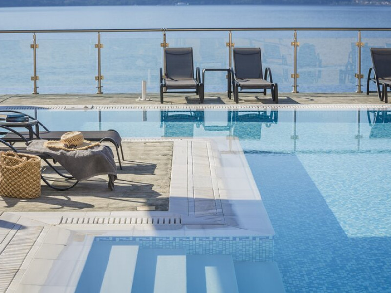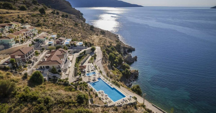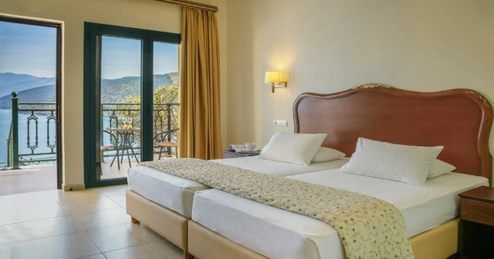 Kefalonia Bay Palace is situated near the award-winning Myrtos beach, just a short drive from Lake Melissani and Drogarati Cave. The hotel is ideal as a base for short visits to local attractions and sites. The hotel is situated in the village of Agia Efimia is a bustling resort with a marina for yachts, lively bars, restaurants and shops.The Hotel is a terrific spot to start exploring Kefalonia, one of the most beautiful Greek islands with spectacular scenery, mountains, perfumed pine forests, aquamarine waters and white beaches.The Kefalonia Bay Palace has 41 individual rooms and 6 luxury villas with private pools featuring contemporary interior design and hand-made wood furniture. Warm red, green and gold palettes work in harmony with the gorgeous natural surroundings outside and guests love the verandas opening to fantastic sea views. This amazing Kefalonia hotel provides villas with steam rooms and private pools with whirlpool.