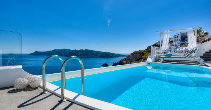 suites built in the heart of caldera with a unique panoramic view over the sea and the volcano. The pool completes the ideal scenery offering ultimate relaxation facing the breathtaking view over the high steep slope…