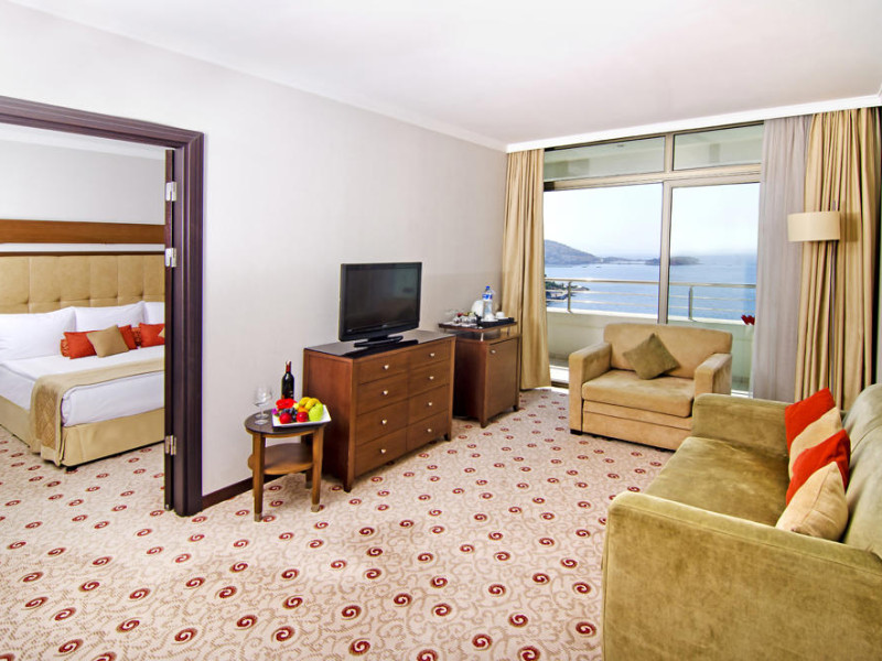 Plaja este situată la 500 m distanță de hotel, iar turiștii beneficiază gratuit de shuttle bus. Tariful pentru 2 șezlonguri și o umbrelă la plajă este de aproximativ 10 euro/zi.