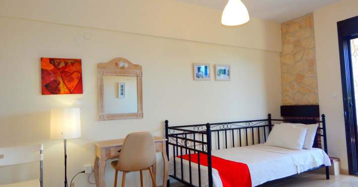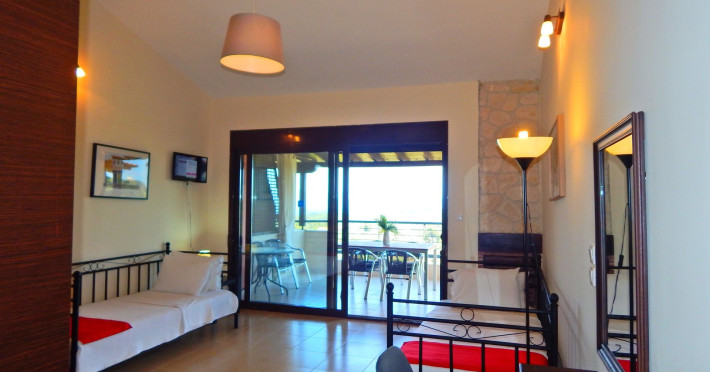 Kripis Studio Paliouri: Located in the most beautiful point of Paliouri, next to the chapel of St. Nektarios. Only 450 meters from the center of the village, you have your Patisserie, supermarket, bakery, restaurants, doctor, pharmacy and everything you need. The apartments are spacious and can accommodate Families or groups of 4-6 people. They have organized kitchens with refrigerator and stove. Also, Big balcony with sea view, Air-conditioning and TV. Internet. Sheets and towels every 4 days. Only five minutes’ drive to the sea (2.5 km), thera are the famous beaches Glarokambos, Xenia, Blue Fish Beach Bar and Kanistro. Also in 9km you can find Pefkohori and in 11 km Chanioti. All the apartments have separate one Room for 2 people, and a big Livingroom for 2-3 people. Refundable Damage Deposit 50 euro. (You take it back the day you leave if everything is OK). The apartments are delivered clean and tenant care alone for cleanliness. We do not provide any extra services. Minimum stay 6 days. We inform you, as shown in the pictures, that the ground is very steep, which is why all apartments have views. Also, the access is by an unpaved road 100 meters. You should be prepared for this small uphill / downhill. Kripis Studio Paliouri is located in Paliouri within 450 metres of the village centre. Featuring a sea-view balcony, the accommodation is fitted with a seating and dining area. An oven and refrigerator are also provided, as well as a coffee machine. There is also a kitchen in all of the units, equipped with a stovetop. Towels and bed linen are offered every 4 days. Within a 5-minutes drive you can reach Glarokambos, Xenia, Blue Fish Beach Bar and Kanistro. Pefkohori is 9 km away and Hanioti 11 km away. nbsp;