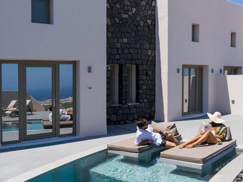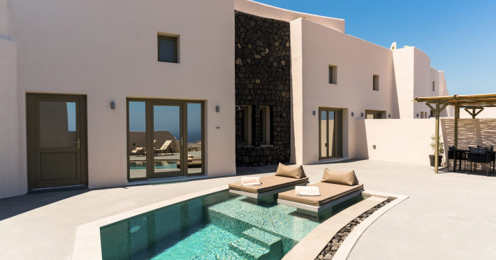 The suites are decorated with luxurious elements based on the peculiarity of the terrain offering their visitors the feeling of luxury together with simplicity. The suite also offers a patio with a private outdoor infinity pool with stunning views of the Aegean Sea from where you can get inspired and rest your soul.