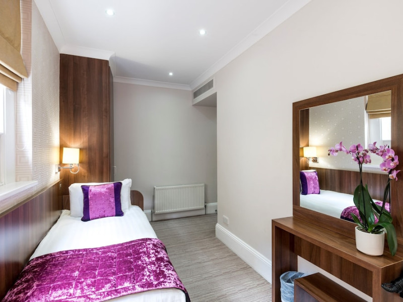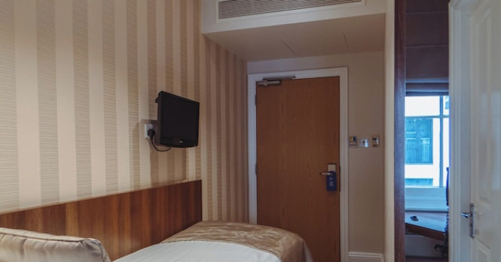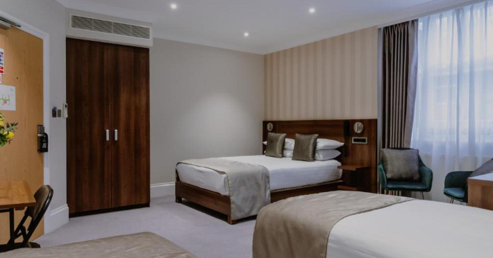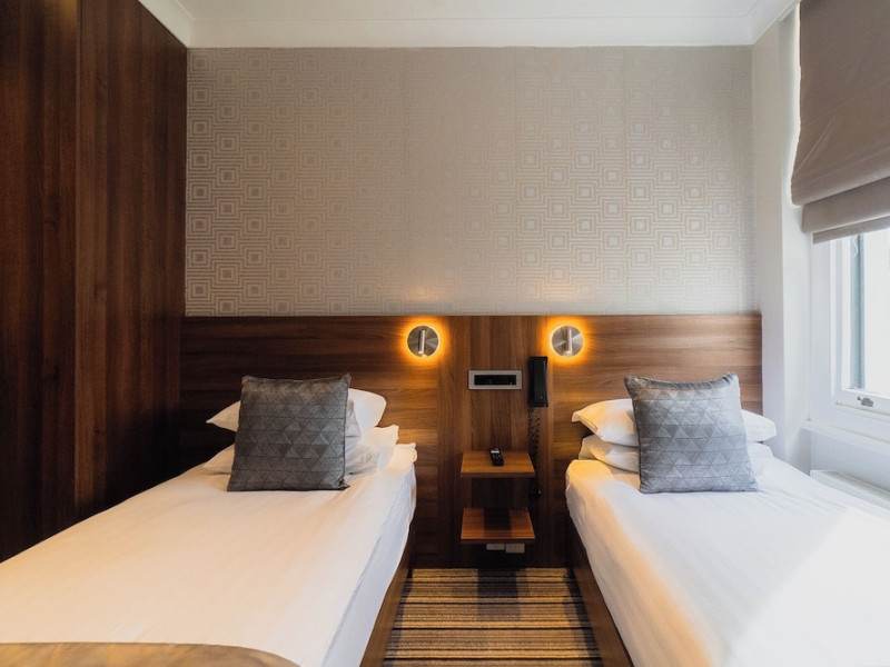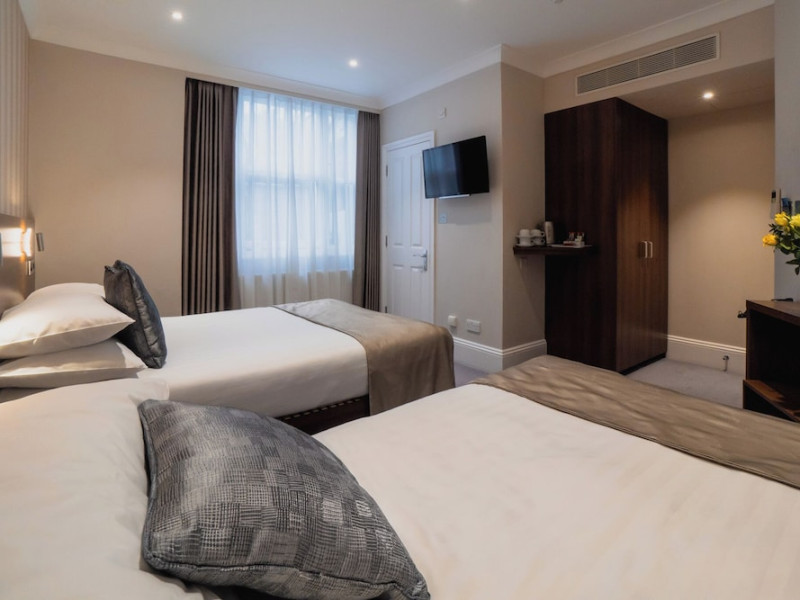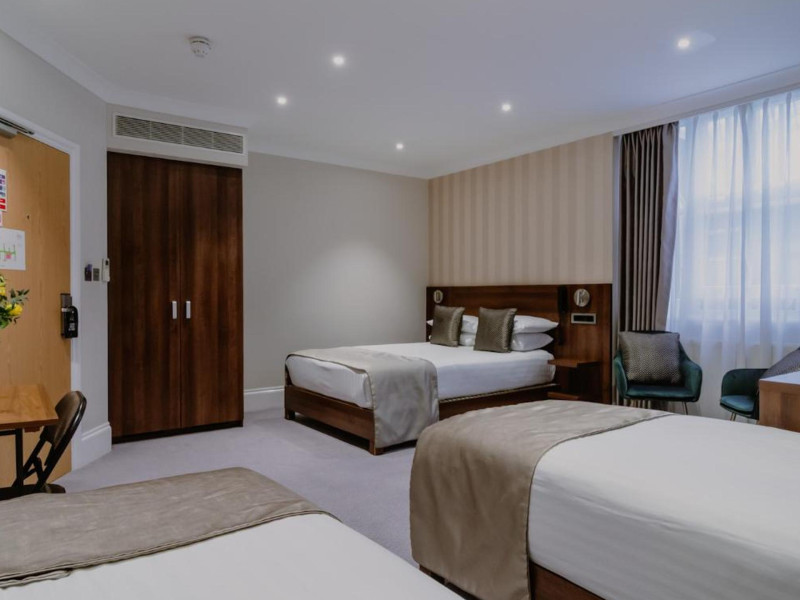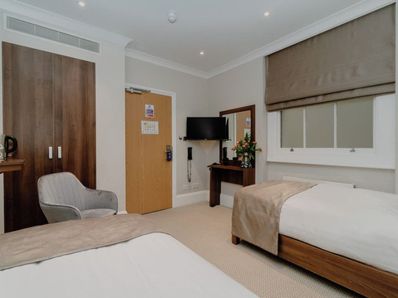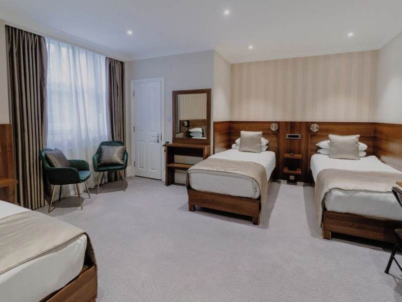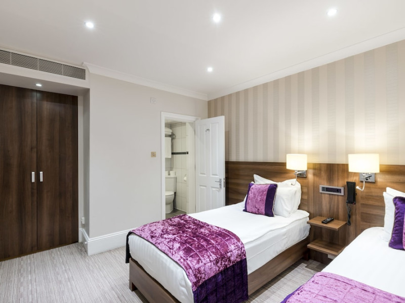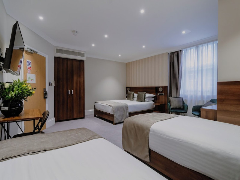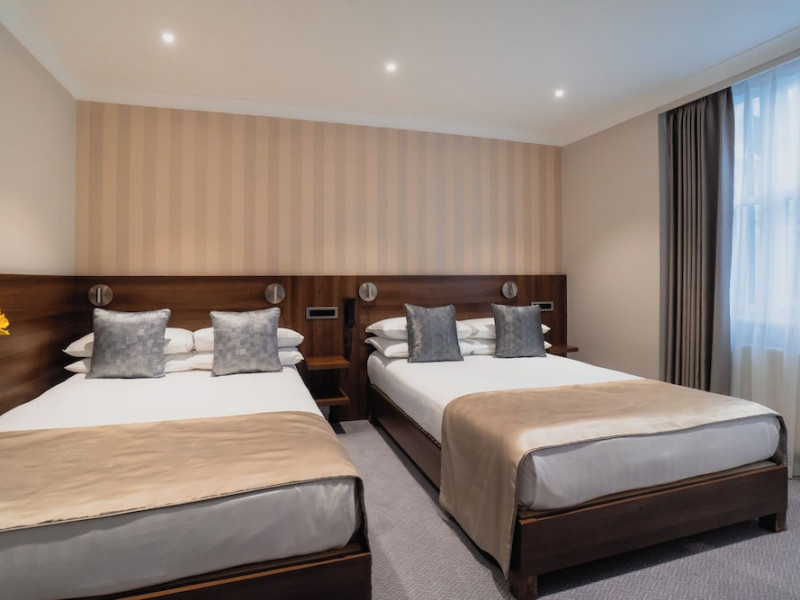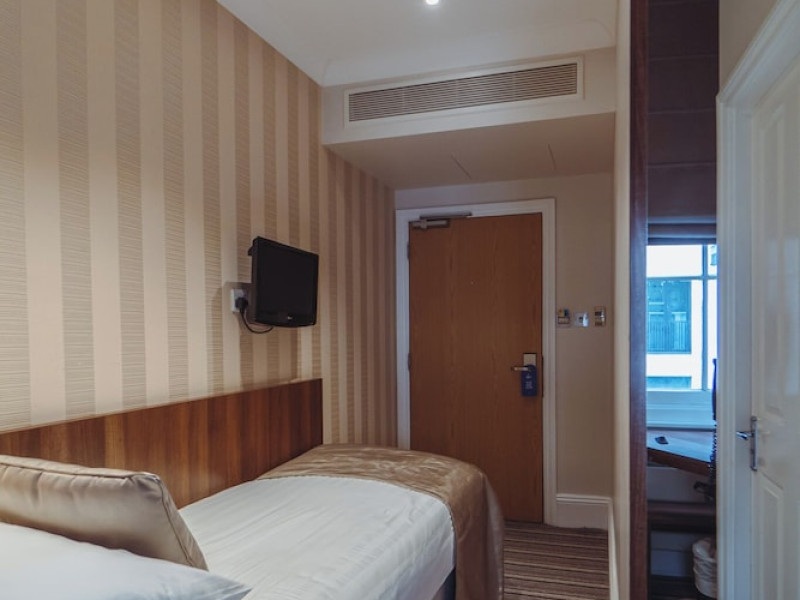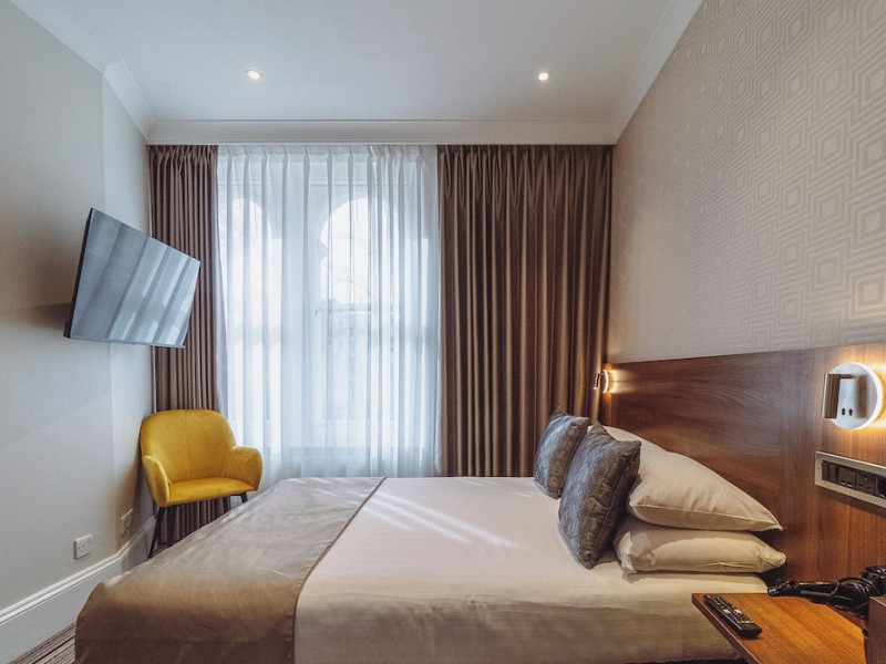 The 3-star London House Hotel combines Victorian charm with modern comfort, housed within five interconnected Victorian-era buildings. Its 103 rooms are designed for both style and functionality, featuring simple painted walls, dark wood veneer furnishings (bedheads, shelves, wardrobes), and comfortable beds accented with Byzantium purple cushions. Each room includes an en suite shower room with complimentary toiletries and a hair dryer. Standard amenities comprise minibars, flat-screen or LCD televisions with cable programming, phones, safes, and electric kettles. Air conditioning is available, with select rooms also offering linen service, blackout curtains, and coffee/tea making facilities.