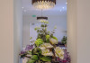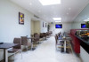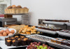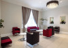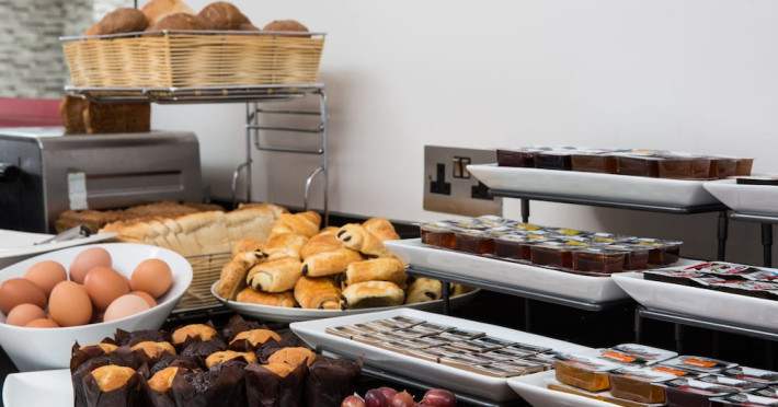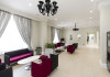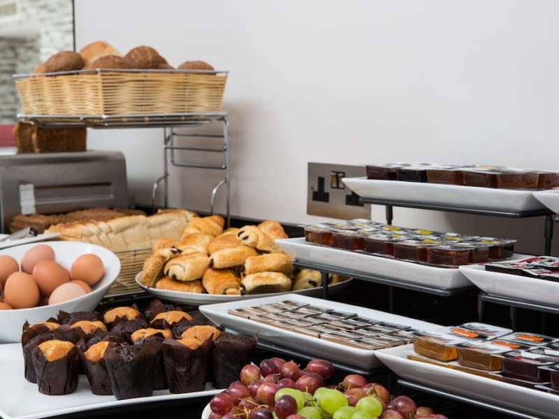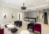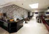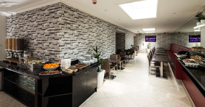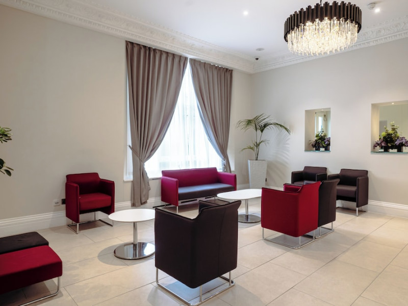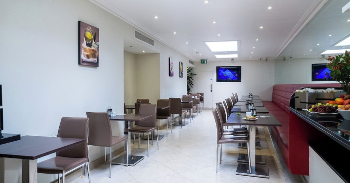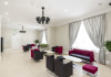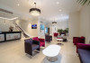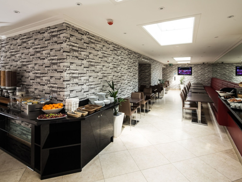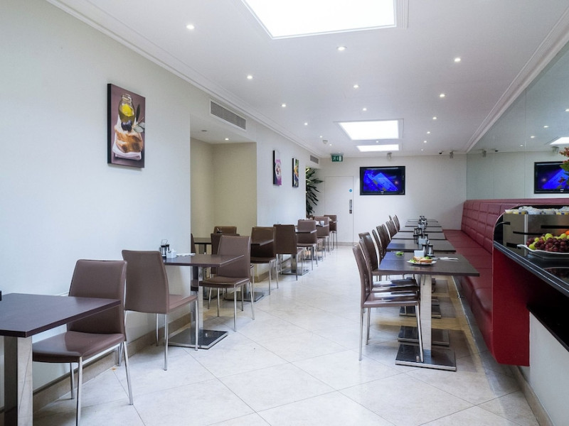 The large, air-conditioned lobby welcomes guests with cream walls, a black reception desk, vibrant purple lounge chairs, charcoal grey chandeliers, high ceilings, and tall mirrors that enhance the sense of spaciousness. A Continental breakfast is served daily from 7:00 AM to 11:00 AM for a fee in the sunny lower ground floor Breakfast Room. This space features dark tan chairs, square wooden tables, a mirror-lined wall with soft crimson chairs, and five skylights.